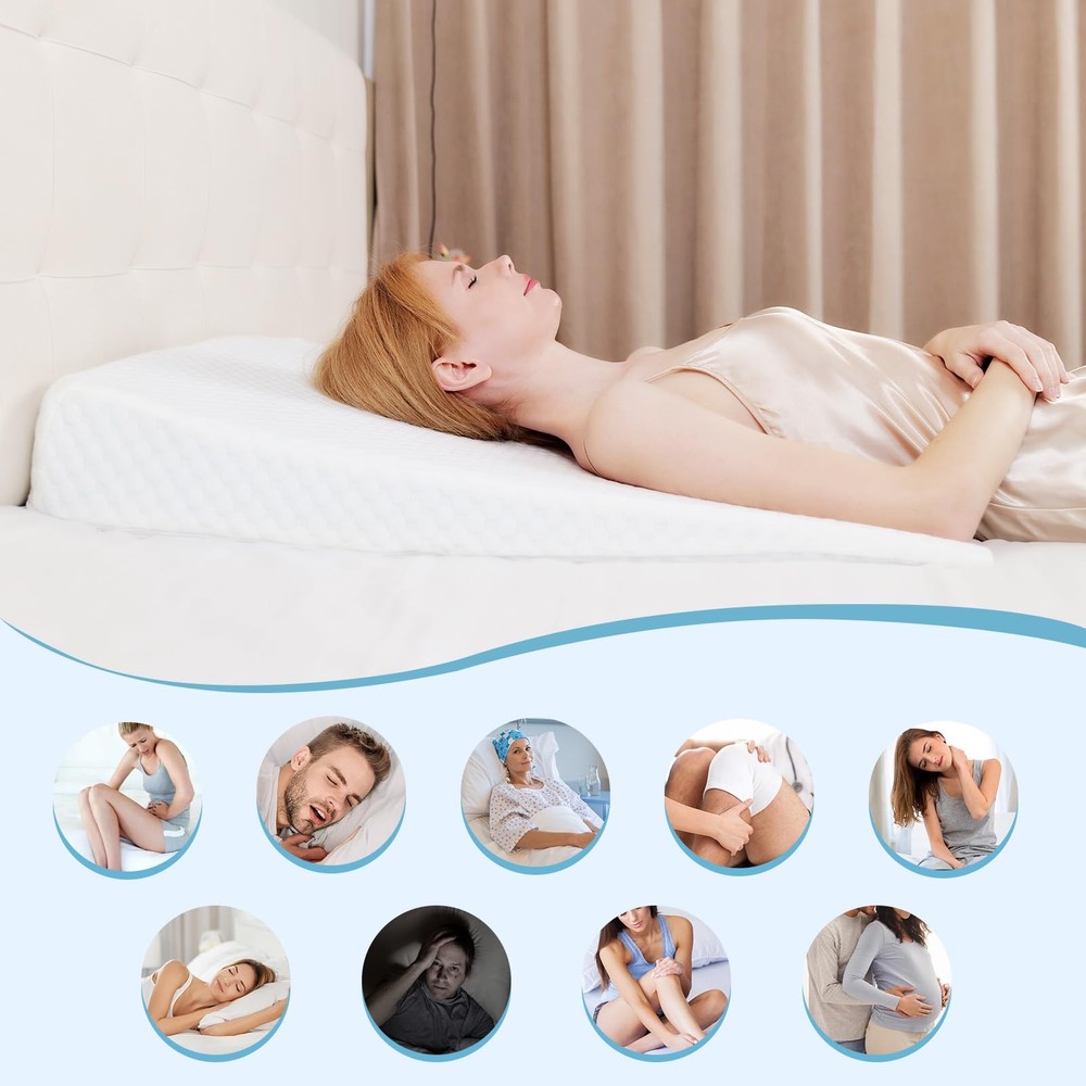 At VADSBO, our mission is to enhance every life by providing exceptional sleep solutions. We are grateful for the trust our customers place in us. As a reliable and professional brand of wedge pillows, we have served thousands of customers, helping them achieve restful and comfortable sleep. We are committed to continually improving our products and services, ensuring every customer enjoys a truly comfortable sleeping experience. Join the VADSBO family and experience the ultimate in sleep comfort! Specifications Pillowcase Material:35% bamboo fiber + 65% polyester fiber Foam Material:High density Foam Foam hardness: 30D Color:White/Gray Size:32x26x5in/80x66x12cm Package Included: Pillowcase x1 Foam x1 Care Instructions: Hand wash or machine wash cold on a gentle cycle Do not iron Use a mild detergent WARM REMINDER: Upon receiving the triangular wedge pillow, it is advisable to place it in a cool, well-ventilated area for a duration of 24 hours. This practice will assist in dissipating any smell associated with the new pillow and allow it to fully expand, thereby achieving optimal comfort and providing the appropriate level of support and balanced firmness PREMIUM MATERIAL: Our wedge pillow is made from a solid 30D high-density foam that offers durable support and quick rebound. The foam adapts to your body’s contours, providing tailored comfort and relaxation. Its resilient structure ensures long-lasting use 15° ERGONOMIC DESIGN: The bed wedge pillow features a scientifically designed 15° incline, providing 5-inch height support. This triangle wedge pillow ensures maximum comfort and proper alignment for reading, sleeping, leg support, and knee support MACHINE WASHABLE PILLOWCASE: Our triangle bed wedge pillow comes with a premium air-layered fabric pillowcase that’s both soft and breathable, offering comfort and easy maintenance. The U-shaped opening design ensures effortless cleaning. Note: The foam inside is NOT machine washable MANY PURPOSES: This versatile pillow offers gentle support for a restful sleep and can be used in multiple ways. Whether for reading, watching TV, working, or sleeping, it provides head, back, and knee support. Ideal for relaxing or for pregnant women, it ensures comfort and relaxation throughout the day ABOUT VADSBO: Your satisfaction is our top priority. If you encounter any issues with our product, please contact us first—we’re committed to resolving any concerns quickly and efficiently. Our 24/7 customer service team is here to assist, ensuring a positive experience