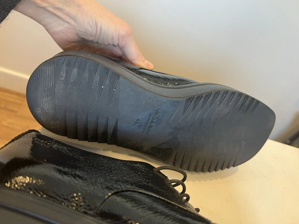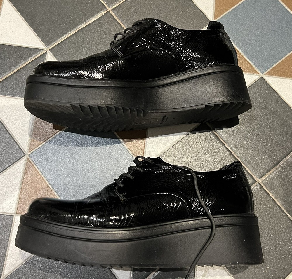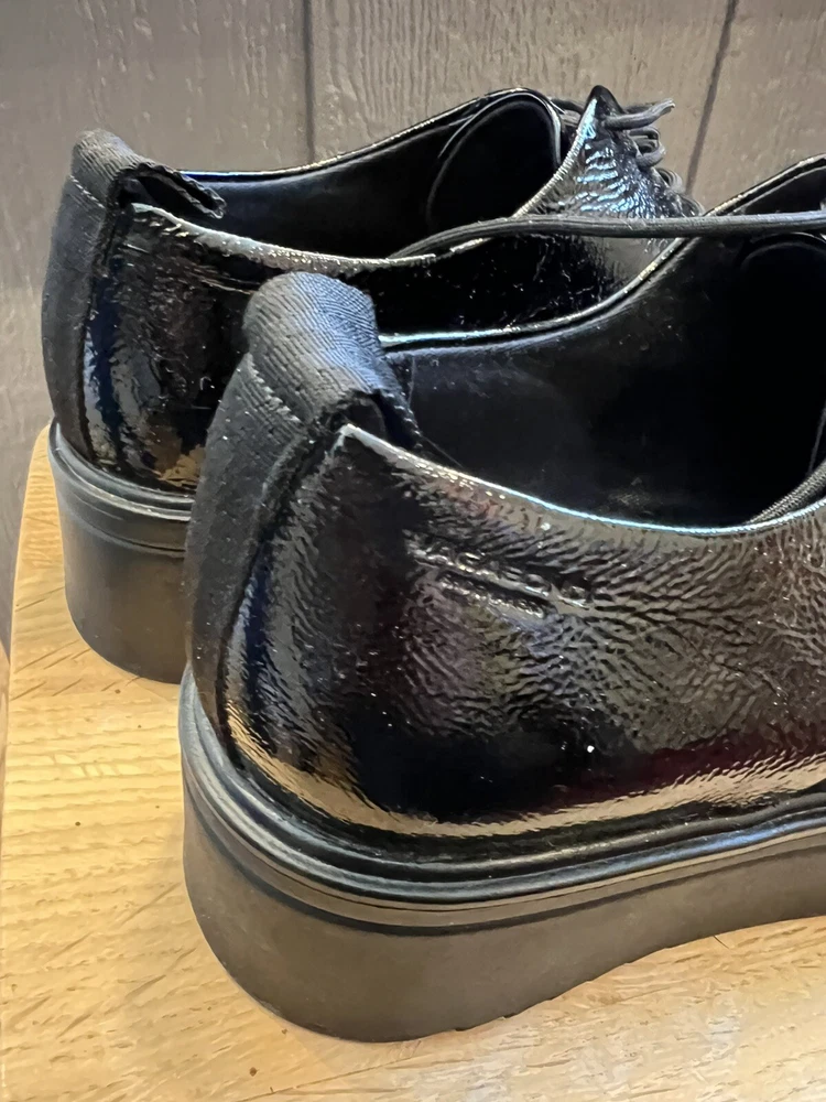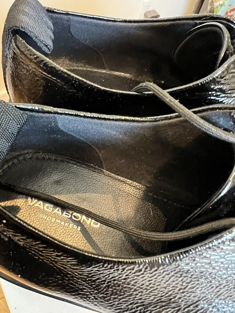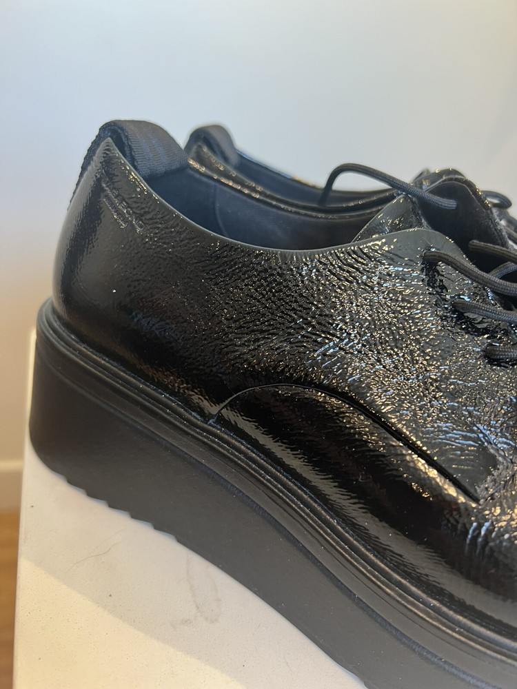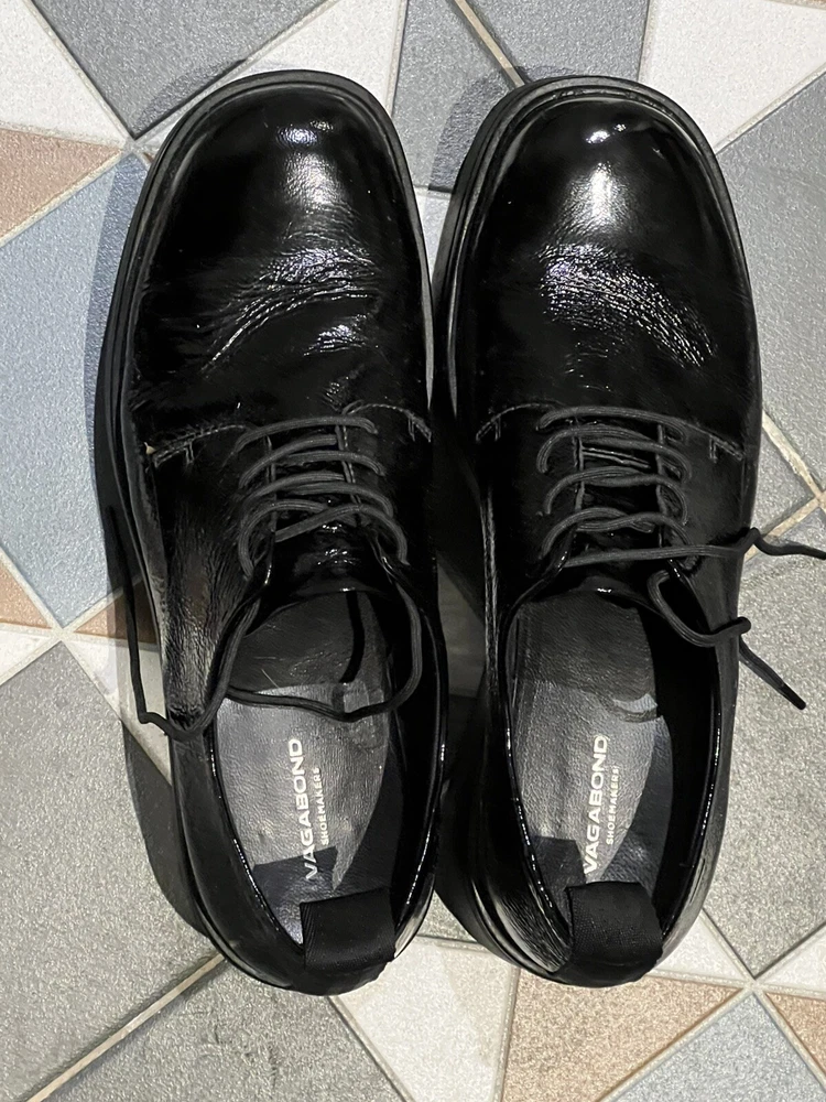 Vagabond Eyra model is a classic Oxford shoe for women in a sleek black patent leather finish. Size 40 EU/ 10 US. Excellent condition. The low platform heel provides comfort for all-day wear, with a leather lining and insole adding to the luxurious feel. Designed with a solid pattern and rubber outsole for durability, these stylish Derby shoes offer a combination of comfort and style suitable for casual occasions. Contemporary lace-up shoes Eyra is crafted in black leather, detailed with a classic derby lace-up fastening and boxy square toes. The low-cut style sets on solid rubber outsoles. Derby-lace up fastening Boxy square toes Solid rubber outsoles
