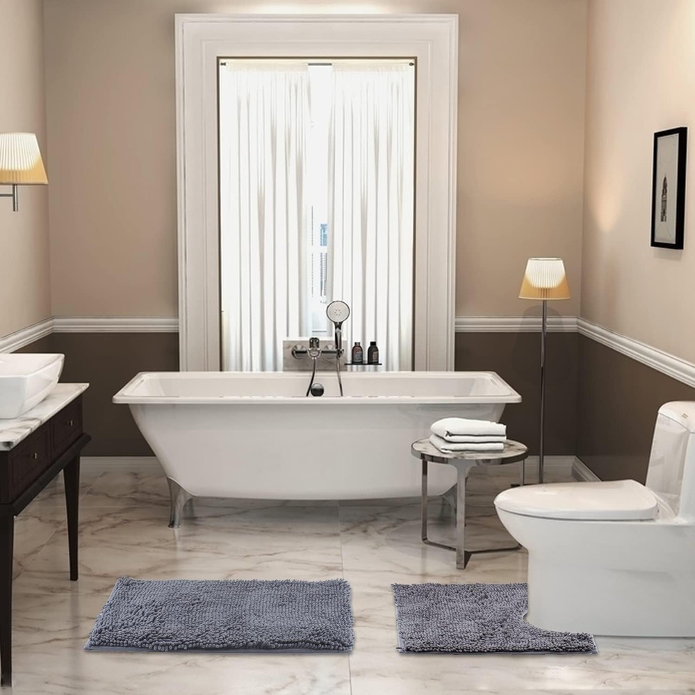 Gray Bathroom Rug Set - 2-Piece Fine Fiber Mat & U-Shape Toilet Mat