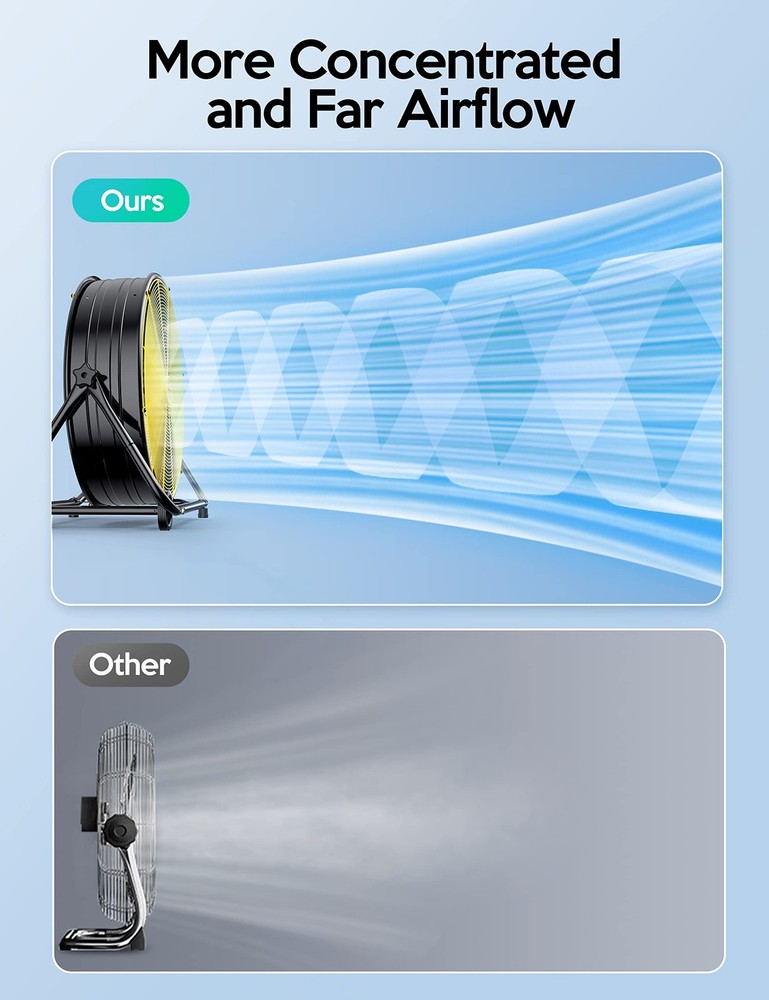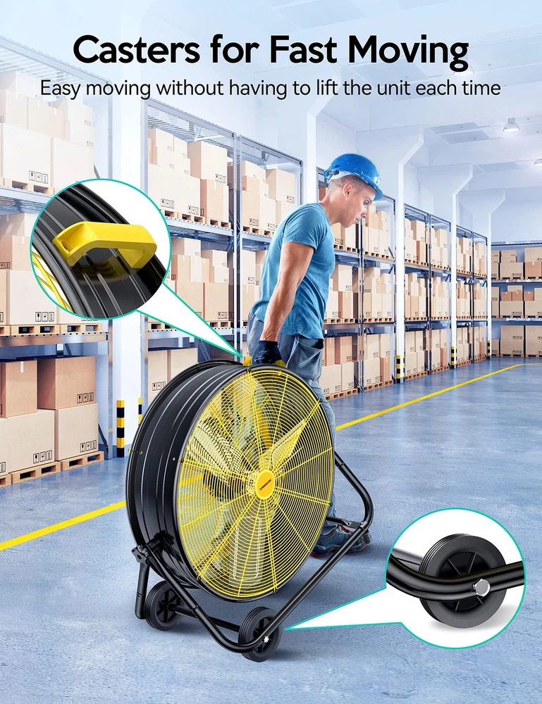 ๐Œ๐จ๐ซ๐ž ๐‚๐จ๐ง๐œ๐ž๐ง๐ญ๐ซ๐š๐ญ๐ž๐ ๐€๐ข๐ซ ๐…๐ฅ๐จ๐ฐ: The barrel fan body with edges and square fan blade design concentrates the wind better and allows it to blow farther, which is ideal for cooling large spaces like patios, garages, or warehouses. Enjoy your cooling wind easily when heat waves hit ๐Ÿ‘๐Ÿ๐ŸŽ๐– ๐๐จ๐ฐ๐ž๐ซ๐Ÿ๐ฎ๐ฅ ๐Œ๐จ๐ญ๐จ๐ซ: High-powered (320W) premium motor allows the 24-inch floor fan to produce a greater volume of air. Perfect for markets, patios, garages, barns, gyms, basements, commercial settings, industrial settings, factory floors, and anywhere strong and reliable air movement is needed. Any accessories missing can ask for sending replacement parts. ๐Ÿ‘ ๐’๐ฉ๐ž๐ž๐๐ฌ & ๐Ÿ‘๐Ÿ”๐ŸŽยฐ ๐“๐ข๐ฅ๐ญ: Our floor fan offers 3-speed options, so you can easily find the perfect level of airflow for your needs. The industrial drum fan features a 360ยฐ pivoting function and tilt adjustable design, allowing you to direct the airflow in multiple directions over a wide space ๐๐จ๐ซ๐ญ๐š๐›๐ฅ๐ž & ๐Œ๐จ๐ฏ๐š๐›๐ฅ๐ž: Equipped with a no-slip handle, big wheels, no-skid positioning legs, and a long power cord, the movable 24 inch floor fan can be placed almost anywhere on a flat surface, making it a highly versatile cooling/ ventilation solution ๐’๐š๐Ÿ๐ž ๐‚๐จ๐ง๐ฌ๐ญ๐ซ๐ฎ๐œ๐ญ๐ข๐จ๐ง: VAGKRI floor fan is constructed from steel materials that can withstand regular use and extend its longevity. The solid blades and high-density pitch metal grid meet ETL standards for safety, ensuring the safety of the standing fan