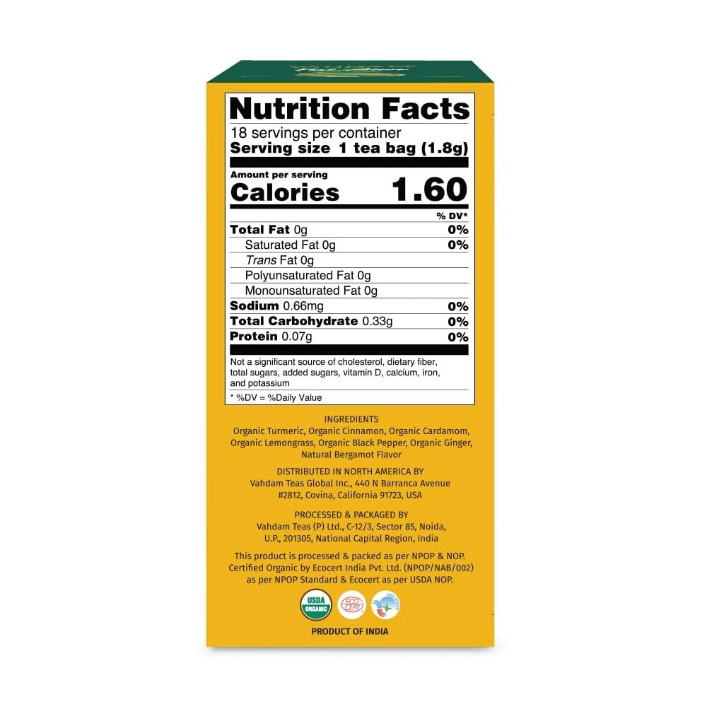 VAHDAM, Organic Turmeric Citrus Ginger Herbal Tea (18 Count) Caffeine Free, Gluten Free | 100% Pure Herbal Blend - Citrusy & Savory | Eco-Friendly Individually Wrapped Tea Bags | Direct from Source Description Features: Harvested in India - Turmeric Citrus Ginger Herbal Tea crafted with turmeric, ginger, and lemon sourced directly from Indian farms, with no middlemen involved, grown sustainably and free from artificial flavors. Citrusy Turmeric Ginger Tea - Our tea offers a warming spice of turmeric and ginger with a balance of tangy citrus note from lemon with a hint of natural sweetness. Being caffeine-free it's perfect for any time of the day. A Brand With a Billion Dreams - Feel alive with VAHDAM Indias premium teas. A leading global brand, we ship to over 3 million customers in 130+ countries. Proudly carbon-neutral and plastic-neutral, we invest in environmental sustainability under our home-grown, sustainable label. Ethical, Direct & Fair-trade - Our supply chain ensures you get the freshest tea while farmers receive fair prices. We reinvest 1% of our revenue into the education of our tea growers' children through our Teach Me initiative, honoring their aspirations and supporting their future. Product Details: Brand: VAHDAM Item Form: Teabags Flavor: Turmeric Tea Variety: Turmeric Unit Count: 1 Count Package Dimensions : 5.2 x 3.19 x 2.8 inches; 2.4 ounces UPC : Manufacturer : VAHDAM Country of Origin : India Handling We will ship all orders within 3 business days of payment. Delivery We do not ship outside of the Continental US. Feedback We take our reputation seriously, we buy and sell online, so we understand the value of trust. If you are unsatisfied with your order, please contact us and we will work with you to resolve it to your satisfaction.