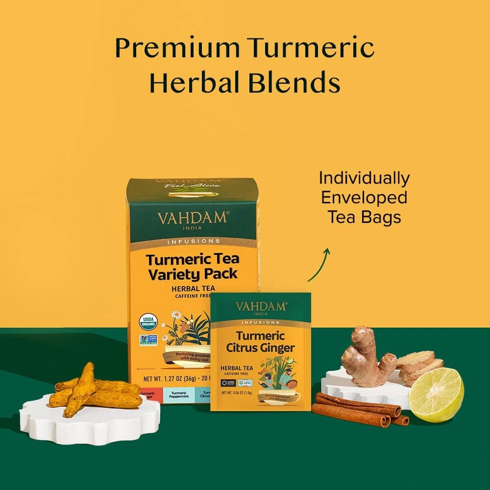 VAHDAM, Organic Turmeric Herbal Tea Sampler (20 Tea Bags, 4 Flavors) USDA Organic, Caffeine-Free, Gluten-Free | Assorted Tea Sampler - Citrus, Ginger, Chamomile and Peppermint | Tea Variety Pack Description Features: EXOTIC ASSORTED TURMERIC HERBAL TEA BLENDS: Introducing our the ultimate Herbal assortment box that packs tantalizing array of flavors - Turmeric Ginger, Turmeric Chamomile, Turmeric Citrus Ginger & Turmeric Peppermint. Each blend promises a unique and delightful journey for your taste buds, crafted with premium ingredients for an invigorating tea experience. PLASTIC-FREE TEA BAGS: Our Filter-Paper tea bags made from full wood pulp, free from micro-plastics, harmful chemicals and toxins, allowing you to enjoy your favorite Tumeric Ginger tea without concern for your health. A BRAND WITH A BILLION DREAMS - VAHDAM India is one of India's largest digitally native, global brands, shipping to over 3 million customers across 130+ countries. With an aim to bring India's finest Teas, Brew Ware, Spices & Herbs to consumers across the world under a home-grown, sustainable label with a strong commitment to people and planet. ETHICAL, DIRECT & FAIR-TRADE - Our innovative supply chain model ensures that you get the freshest cup of tea and our farmers get a better price for their produce. 1% of our revenue is redirected towards the education of our tea growers' children with our social initiative, Teach Me, simply wish to honour this aspiration. WE CARE FOR PEOPLE & PLANET - We are now a proudly carbon-neutral & a plastic-neutral brand. We measure our overall carbon & plastic footprint & offset it via our investments in environment sustainability initiatives in India. Product Details: Brand: VAHDAM Item Form: Teabags Flavor: Turmeric Tea Variety: Turmeric Unit Count: 1 Count Package Dimensions : 5.16 x 3.11 x 2.8 inches; 2.89 ounces UPC : Manufacturer : VAHDAM Country of Origin : India Handling We will ship all orders within 3 business days of payment. Delivery We do not ship outside of the Continental US. Feedback We take our reputation seriously, we buy and sell online, so we understand the value of trust. If you are unsatisfied with your order, please contact us and we will work with you to resolve it to your satisfaction.