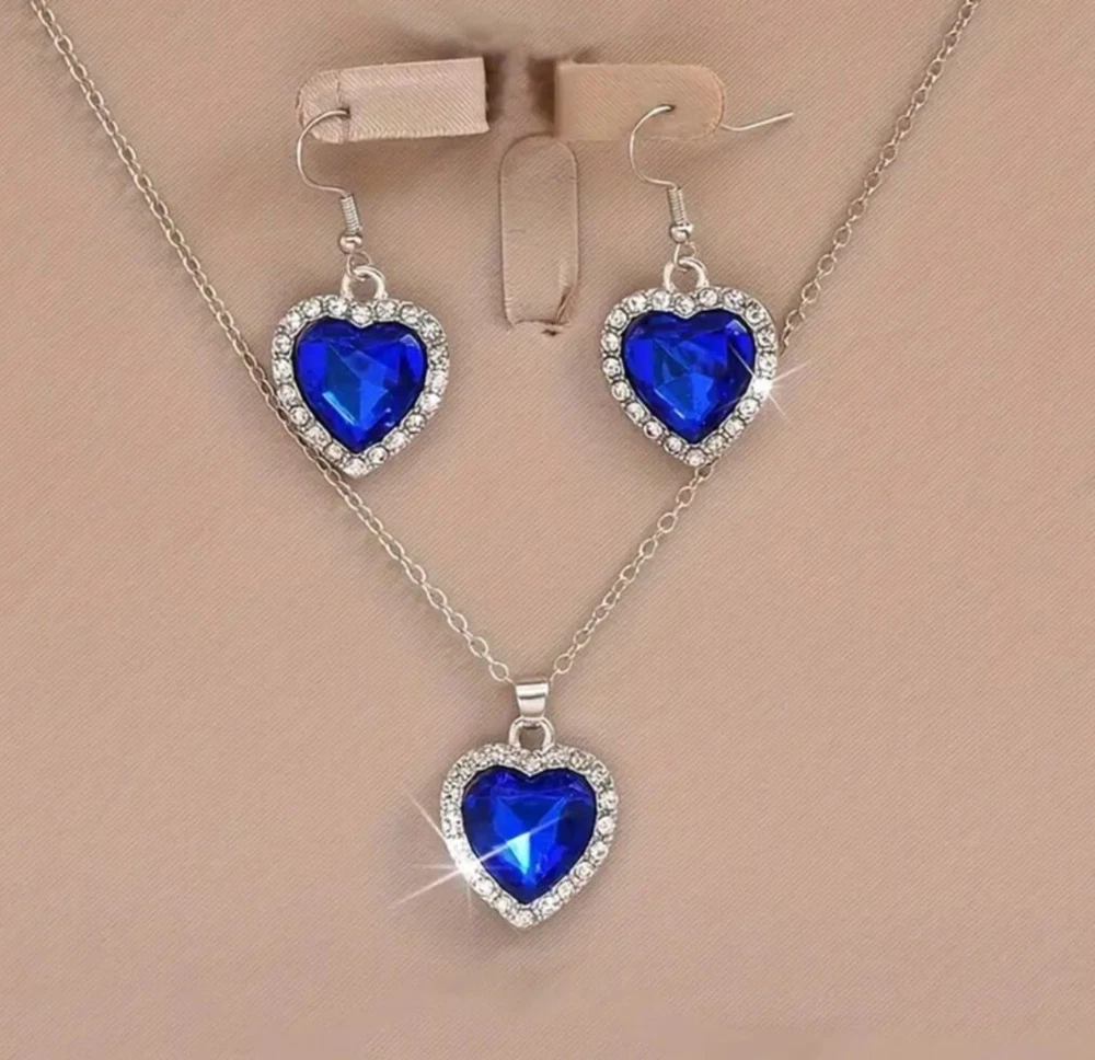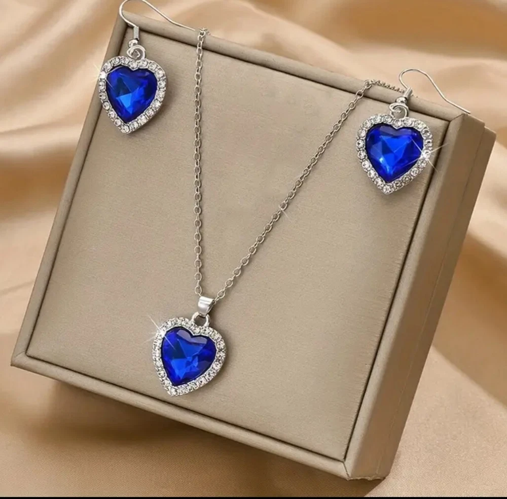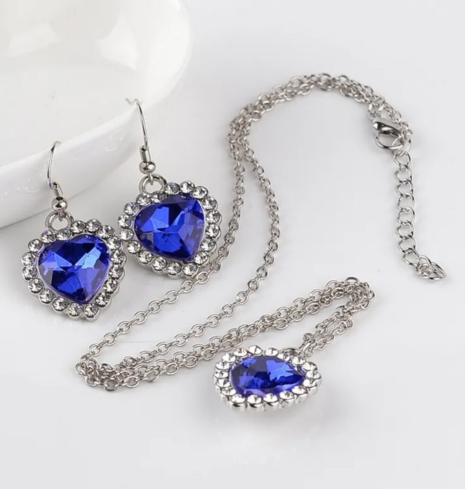 NEW ~ Silver Plated Heart Pendant Necklace & Earrings Set with Sapphire Blue Swarovski Austrian Crystal Elements & Clear Rhinestones NEW ARRIVAL !! ~ LIMITED QUANTITIES !! Showcase Presentation: Item Necklace Condition New Metal Silver Plated Closure Lobster Claw Clasp Design / Motif Heart Approximate Item Weight 3 gms Approximate Measurements The Heart is 5/8" Wide x 3/4" Long with the Bail. The Silver Plated Delicate Wheat Link Chain adjusts from 17" to 19" Gemstone Information Crystal Swarovski Austrian Crystal Elements & Rhinestones Color Sapphire Blue Crystals Accent Stone Color Clear Rhinestones Showcase Presentation: Item Earrings Condition New Metal Silver Plated Hooks Closure Fish Hooks with Plastic Plugs Design / Motif Dangle Earrings ~ Heart Approximate Item Weight 4 gms For the Pair Approximate Measurements 5/8" Wide x 1-1/4" Long Gemstone/ Material Information: Stone Color Sapphire Blue Crystals Accent Stone Color Clear Rhinestones