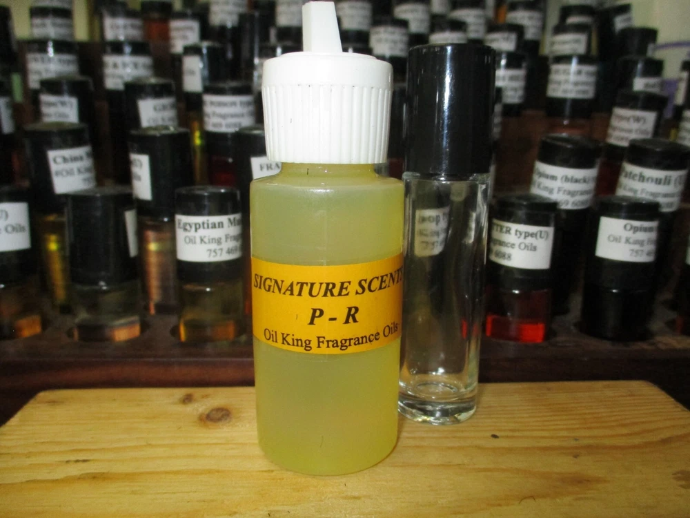 OIL KING FRAGRANCE OILS. Hello Friend. Thank you for your Interest. For Sale: Your Choice of One 1oz. Plastic Spout Bottle of a SIGNATURE SCENT " P " and a 1/3 oz. Roll-on Vial. Pure Superior Quality Fragrance Oil. For Crafts, Burning or Body. Strong Scent that Last Long. SIGNATURE SCENTS . "Top Tier Popular Oil Fragrances." *The Fragrances Types on this List have no Connection to any Trademark or Designer Perfume Manufactures. They are Not Original or Imitations of Designer Perfumes. They are Our Version of Fragrance Oils. Color of Oil May Be Different From Photo.