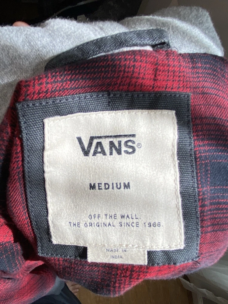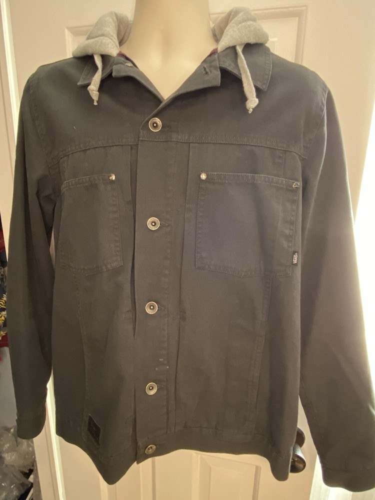 Fabric Type: Flannel Color: Gray Fit: Regular Handmade: No Pattern: Solid Accents: Button, Logo Type: Jacket Size: M Outer Shell Material: Cotton Blend Department: Men Size Type: Regular Personalize: No Jacket/Coat Length: Short Features: Collared, Hooded, Pockets Country/Region of Manufacture: India Occasion: Casual, Travel Product Line: Vans Season: Fall, Spring, Winter Brand: VANS Closure: Button Garment Care: Machine Washable Style: Hooded Jacket Theme: 90s, Grunge, Outdoor, USA, American