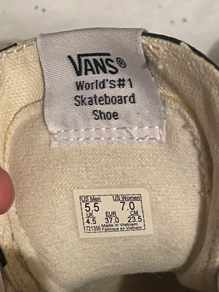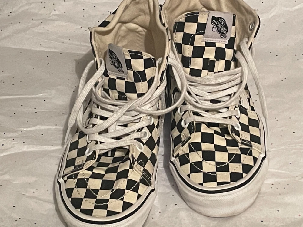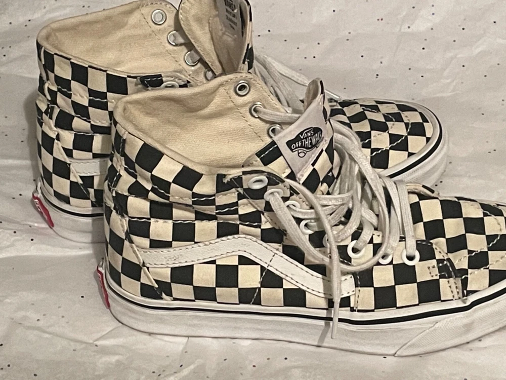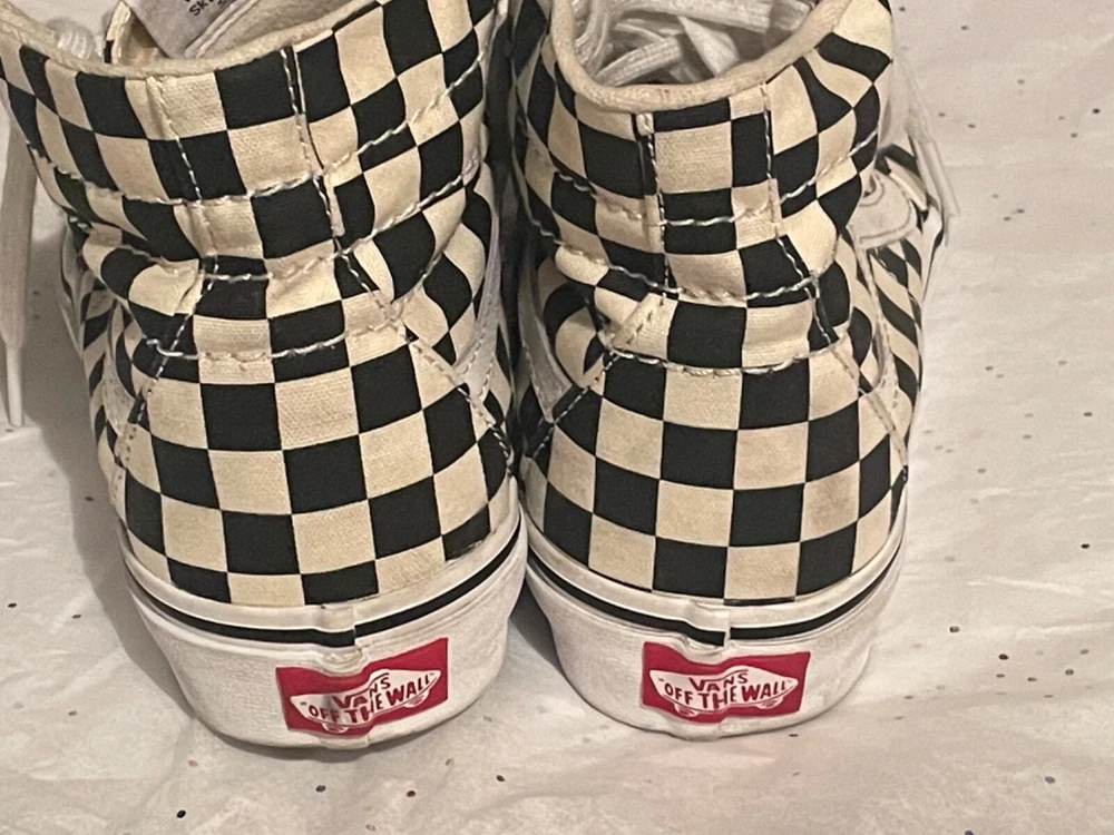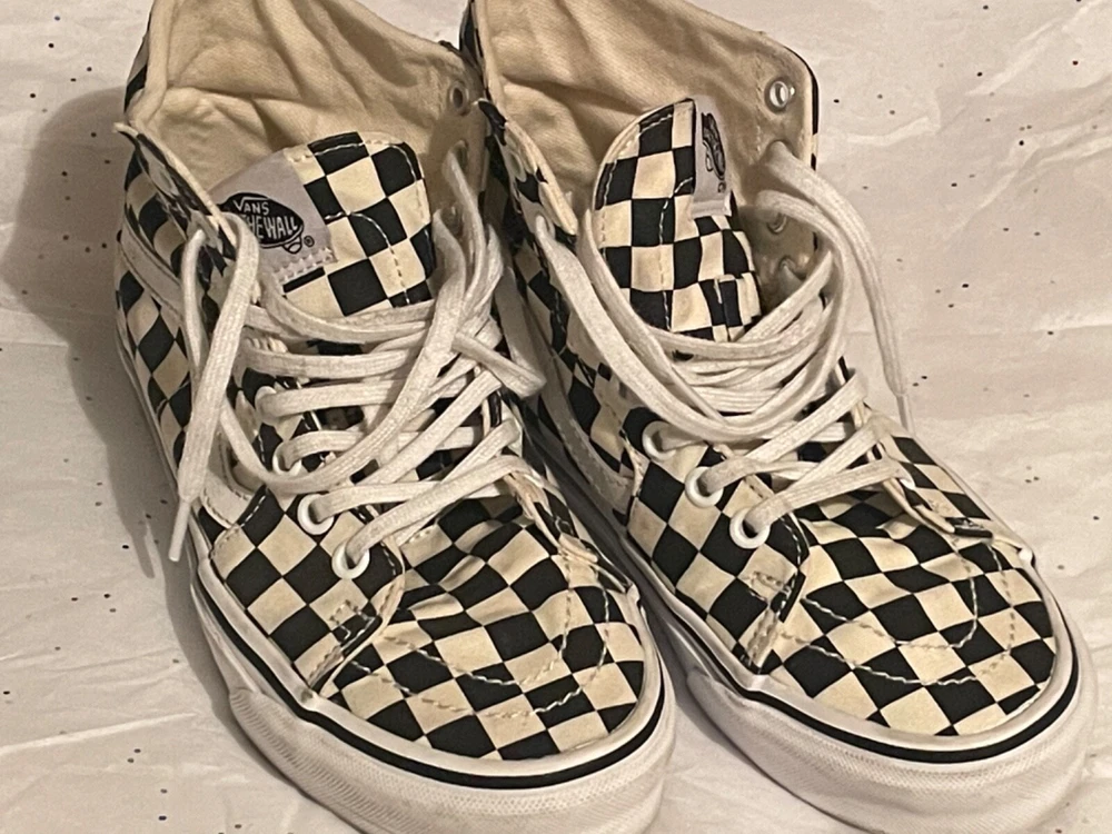 These VANS shoes are high-top sneakers in black with a white checker pattern. They feature a lace-up closure, rubber outsole, and comfortable foam insole. Suitable for skateboarding, the shoes are designed for both men and women in a standard shoe width. The upper material is cotton blend, making them breathable and adjustable for a variety of activities.