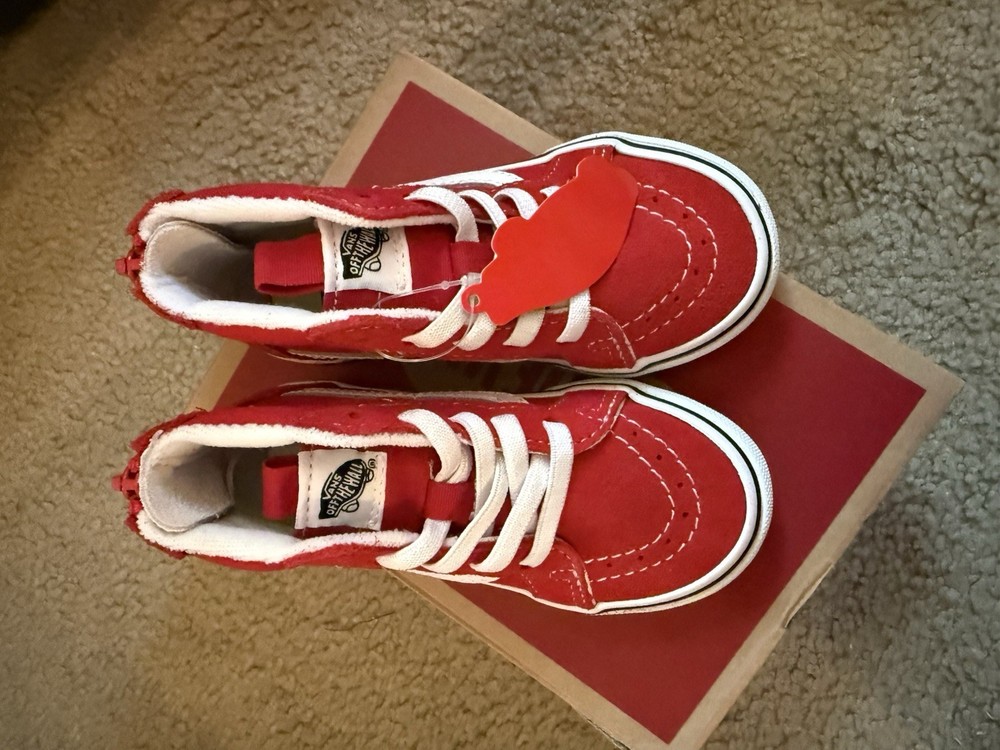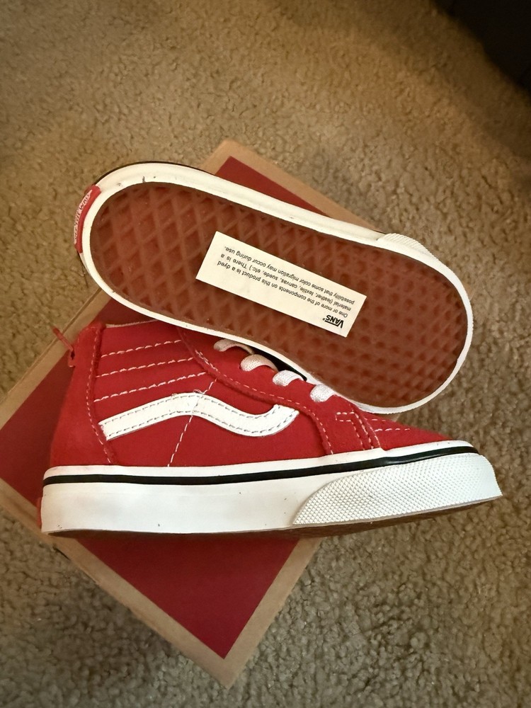 BRAND NEW pair of VANS shoes for toddlers Red w/white stripe SZ-7.5 Zipper up on back of shoe Smoke free home