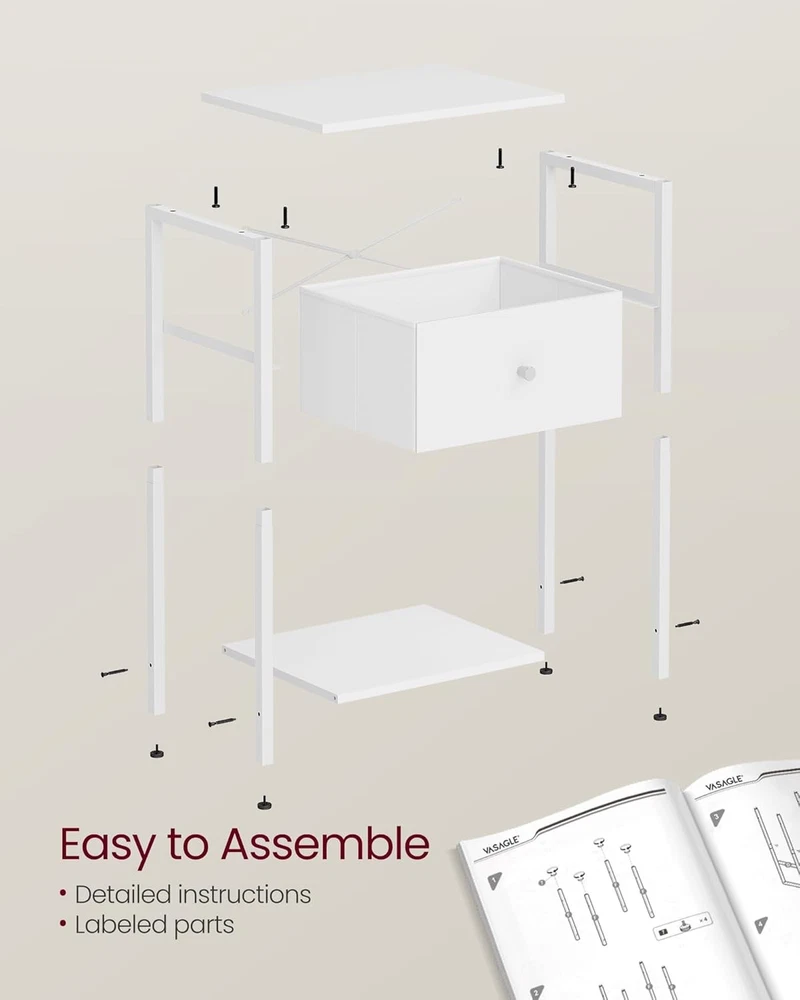 VASAGLE Nightstands, Set of 2 Side Tables 2 Pack with Single Drawer, White Product Details Brand: VASAGLE Product Dimensions: 11"D x 15"W x 24"H Maximum Weight Recommendation: 22 Pounds Color: White Product Care Instructions: Wipe with Dry Cloth Item WeightFrame Material: 16.4 PoundsGlass Top Material TypeShape: GlassRectangular [Ample Storage] With 2 open shelves and 1 fabric drawer, these 2 nightstands offer within-reach storage for your lamp, water glass, and remotes and out-of-sight storage for those easy-to-get-messy cables, pens, and your little secrets [Serve Many Places] Make it an end table next to the couch in the living room, a bedside table in the bedroom, or add handy storage in the hallway—this set of 2 stylish tables rounds off your space in any way [Ideal Height] 24” tall, each side table matches most beds and makes it easier for you to grab the stuff on the table when you’re in bed [Sturdy & Stable] Made with particleboard, a steel frame with an X-bar, a durable non-woven fabric drawer, and balanced by 4 adjustable feet, each end table with drawer offers firm, stable, and lasting support [Easy-Peasy Assembly] With easy-to-follow instructions and labeled parts, you can assemble these bedside tables before you know it Specifications: Color: Greige, BlackMaterial: Particleboard, Steel, Non-Woven FabricProduct Size: 11”D x 15”W x 24”H (28 x 38 x 61 cm)Total Weight of 2 Tables: 16.3 lb (7.4 kg)Max. Static Load Capacity of the Tabletop: 100 lb (45.6 kg)Max. Static Load Capacity of the Shelf: 20 lb (9 kg)Max. Static Load Capacity of the Drawer: 5 lb (2.2 kg)Max. Total Static Load Capacity per Table: 125 lb (56.8 kg) Package Contents: 2 x Nightstand2 x Accessory Kit1 x Instructions VASAGLE Notes: Do not put overweight items in the not wash the drawer. Clean with a wet cloth.There may be a smell of "new" when first opening the package; please air the side table out in a well-ventilated place for a few hours.