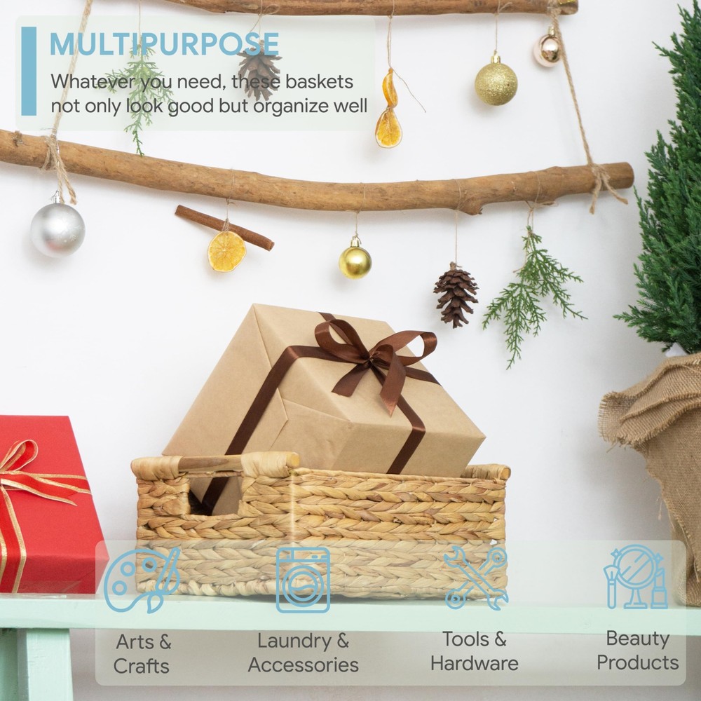 ✅ Convenient and Attractive - Whether it be by way of pure decor, storage, or organization for kitchen, pantry, or bathroom. This natural baskets with handles suit your home in every way. The rectangular baskets wicker is great for magazines, games, pet toys, media, household items. ✅ Natural & High Quality - Our wicker storage baskets for shelf are made of Water Hyacinth, was carefully handcrafted to perfection. It comes with an iron frame for sturdy storage. The wooden handles on both sides are not only pretty but to help you easy to carry the wicker basket. ✅ Ideal For Home - wicker basket with handle is an easy and affordable way to change the style of your home. With it's natural design, the basket storage wicker make nice neutral backdrops and can brighten your day as well as impress your guests. ✅ Medium Wicker Basket: 13.6"L x 9.5"W x 5.6"H. This wicker basket is convenient and easy to storage for drawers, shelves, desks, or anywhere in the house. Please note that this item is just single medium wicker storage baskets, is handmade and the sizes may vary ±1 inch. ✅ The Best Customer Service - With our famous 100% satisfaction, you can have peace of mind. If for any reason you're not completely happy with your purchase- if it breaks, if it's damaged in shipping, or any other reason - simply let us know and we will definitely assist you!