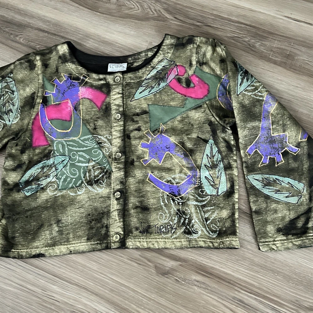 V.C.Torias Gold Multicolored Hand Paint Patch Work Button Up Cardigan Women 0/S. V.C.Torias Gold Multicolored Hand Paint Patch Work Button Up Cardigan Women 0/S in great condition/ boxy cut/ All Over Print/ non stretchy / vintage Pit to pit 22” Length from shoulder 20” Sleeve from shoulder seam 23” Approximate measurements #20 Office, work, brunch, street, 80’s, 90’s, retro, street, Paris fashion, New York fashion , art to wear granny , garden, gremlin All final sale