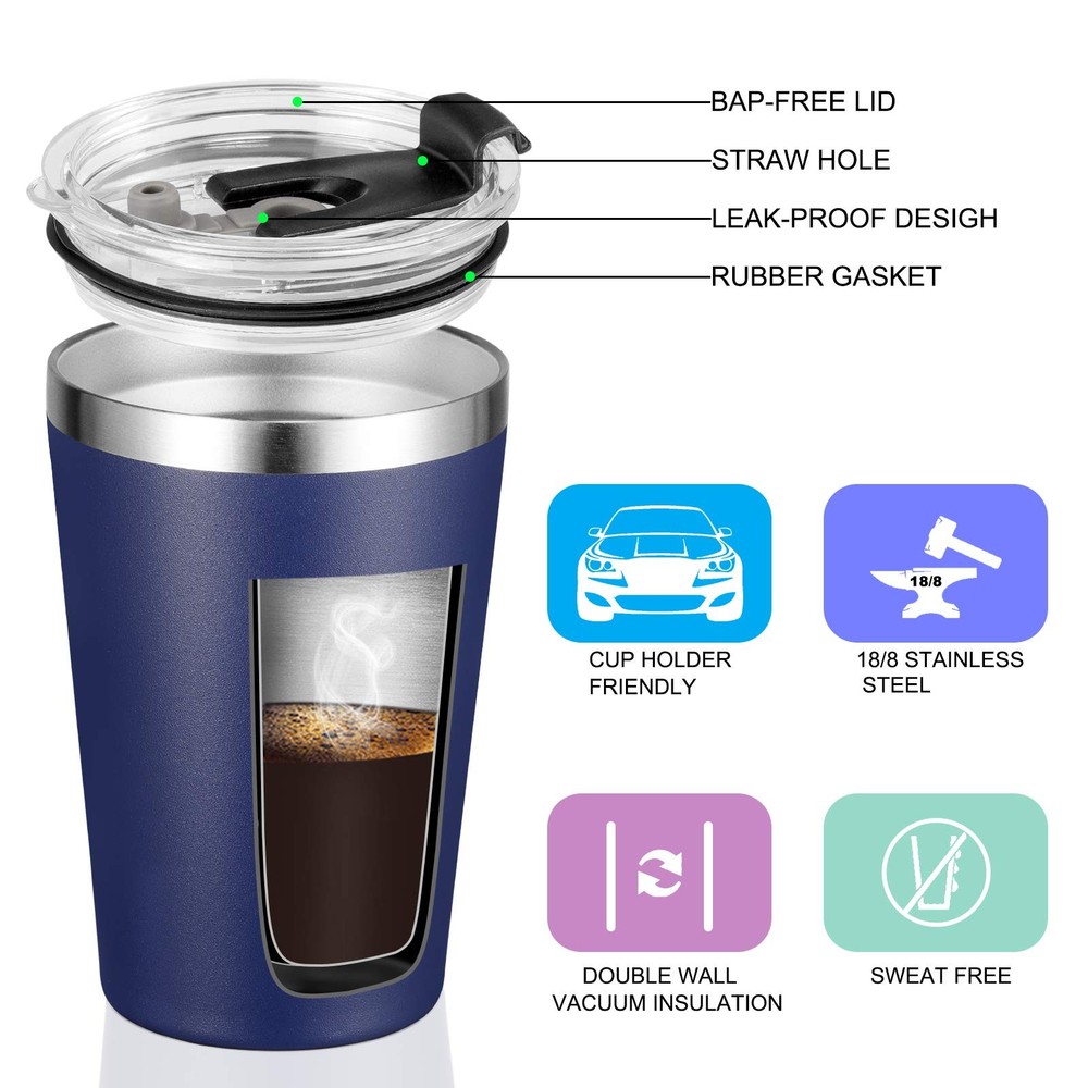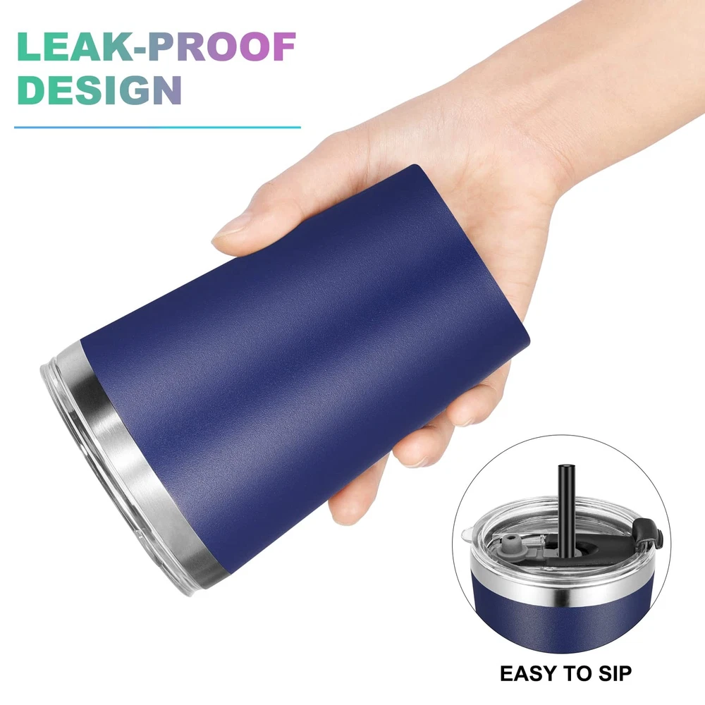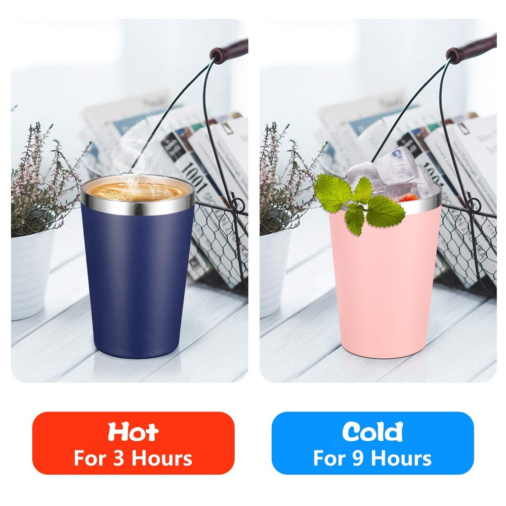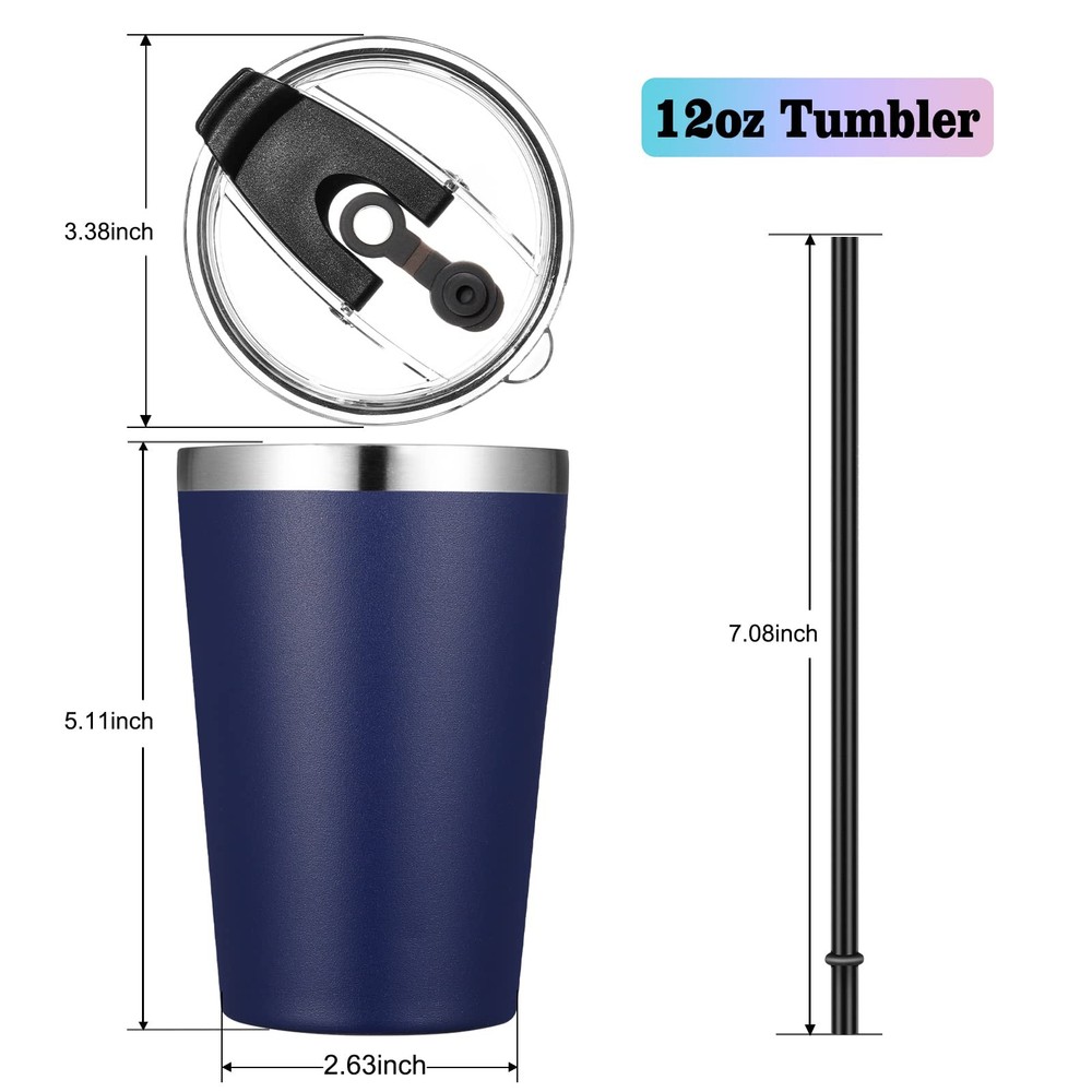 VEGOND 12oz Tumbler Stainless Steel bulk Vacuum 12 Ounces, Navy Blue Product Details Stainless Steel Tumbler with Lid and Straw: This 12 oz insulated tumbler is made of 304 18/8 stainless steel including plastic lid and straw. No metallic taste Hot and Cold Tumbler: Double wall tumbler ensure the 12 oz coffee tumbler incredibly good at temperature protection. Under normal temperature, the insulated tumbler keeps your water hot for three hours and cold for nine hours Colored Powder Coated Tumbler: The stainless steel cups is crafted with stylish color powder coating, gives you multiple color options. It's cool to touch when filling with hot water and also sweat proof with cold water, always keep your hands comfortable while holding the stainless steel tumblers 12 oz Tumbler: The 12oz coffee tumbler cups height is 5.11", bottom length:2.63", lid siameter is 3.38". It fits most car cup holder and ideal for gift. We also provide tumblers bulk option Widely Use: The 12 oz tumbler with lid and straw can be used as kids tumbler, travel coffee tumbler, small water tumbler cup, suitable for birthday parties, picnics, self-driving travelling, camping and hiking etc