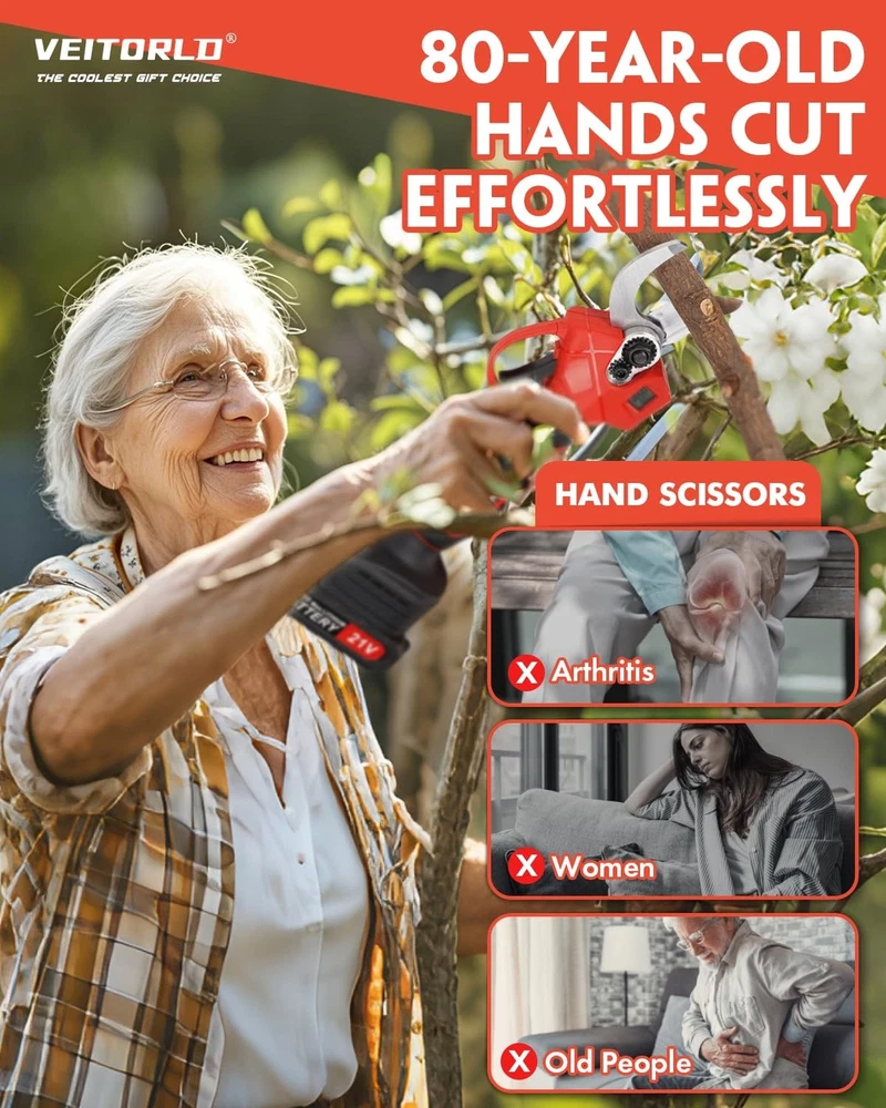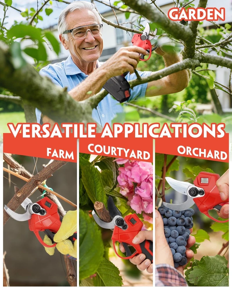 VEITORLD Electric Pruning Shears, Portable Cordless Branch Cutter Tree Trimmer with LCD Display&Replaceable Blades, 30mm 1.2'' Cutting Diameter for Gardening Tree (Included 2Pcs 2000mAh Batteries) - Buy Now with Fast Shipping! VEITORLD Electric Pruning Shears, Portable Cordless Branch Cutter Tree Trimmer with LCD Display&Replaceable Blades, 30mm 1.2'' Cutting Diameter for Gardening Tree (Included 2Pcs 2000mAh Batteries) Product Details Brand: Veitorld Color: Black Red Style: 1.2in Handheld Pruner Product Dimensions: 30"L x 4"W Blade Material: High Carbon Steel Brand: Veitorld Color: Black Red Style: 1.2in Handheld Pruner Product Dimensions: 30"L x 4"W Blade Material: High Carbon Steel Handle Material: Rubber Blade Edge: Serrated Blade Type: Bypass Hand Orientation: Ambidextrous Point Style: Round point Cutting Width: 1.2 Inches Manufacturer: Veitorld Part Number: 001 Item Weight: 4.58 pounds Country of Origin: China Item model number: DDXZJ-DCK Batteries: 5 Lithium Ion batteries required. (included) Material: High Carbon Steel, Plastic Power Source: Battery Powered Voltage: 20 Volts Wattage: 600 watts Item Package Quantity: 1 Included Components: Oil Bottle, Blades, Battery, Charger, Sharpening Stone Batteries Included?: Yes Batteries Required?: Yes Battery Cell Type: Lithium Date First Available: June 17, 2024 Key Features ✅ UP TO 30mm CUTTING:Quickly and cleanly trim branches without damage. SK5 steel blades and a brushless motor ensure sharpness and durability for cutting 1.2 inch branches. Ideal for gardens, parks, farms, and orchards, perfect for grapevines and fruit tree ✅ 600W BRUSHLESS MOTOR:Efficient and easy-to-use, our shears feature a powerful motor for superior performance. Less energy use, more efficiency, effortlessly every time, and a longer lifespan make it perfect for summer pruning tasks ✅ LONG BATTERY LIFE:Equipped with 2 x 21V, 2AH lithium batteries for extended use. Quick 1-2 hour charge and spare batteries allow for 6-8 hours of work, cutting over 1,000 branches. Ideal for maintaining your garden during the busy summer season ✅ SAFETY & AUTOMATIC SLEEP:Turning the battery on and pressing the start button twice quickly before it starts working reduces the risk of accidents. After 1 minute of inactivity, it automatically enters sleep mode to extend the life of the battery ✅ ENJOY EVERY PRUNING JOURNEY:Ergonomic design, pruning shears weigh only 1.7lb, long-term use is not easy to feel fatigue, especially suitable for the elderly, women and other uses ✅ LCD DISPLAY:Equipped with LCD display can real-time display cutting situation and battery remaining power, so that you always keep track of cutting activities, so that each trimming work is no longer laborious and boring ✅ PACKAGE & SUPPORT:Includes shears, 2 batteries, oil bottle (WITHOUT OIL), 2 SK5 blades, sharpening stone, wrenches, charger, and manual. Our 24/7 customer service is ready to assist with any product inquiries, Please feel free to contact us Product Description