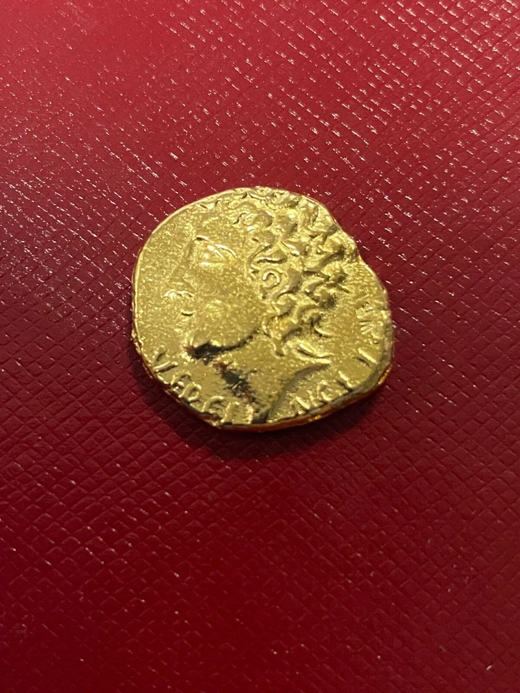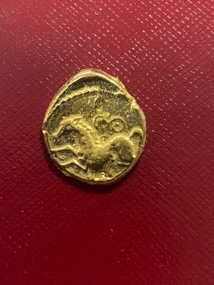 PLEASE NOTE THIS COIN WILL NOT BE POSTED UNTIL MONDAY 28th FEBRUARY RARE VERCINGETORIX GOLD STATER REPRODUCTION COIN Diameter - 18 mm An unusual and rare coin exact to the original it was cast from and finished in gold plate, EF condition. Originally struck under the authority of the Gallic chief in 52 BC at the time the Arverni leader, Vercingetorix, was confronting the Roman armies of Gaius Julius Caesar. Fewer than thirty Vercingetorix staters, in gold, electrum and bronze, have been identified around in the world Obverse - Bare head bust of Vercingetorix with wavy hair, left. Text below: VERCI-NGETORIXS. Reverse - Full bodied horse galloping left, spiral shape above . Vercingetorix, chief of the Arverni, led the great Gallic revolt against the Romans in 53-52BC. His name in Gaulish means ‘over-king of warriors’. He was eventually defeated by Caesar at the Battle of Alesia in 52BC and was imprisoned, he died in 46BC. The free horse on the reverse symbolises the Arverni spirit of independence.