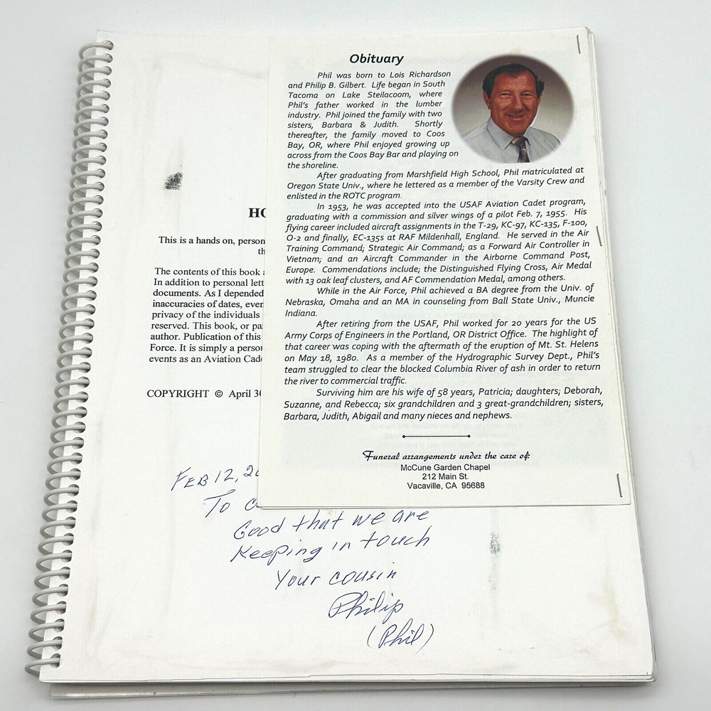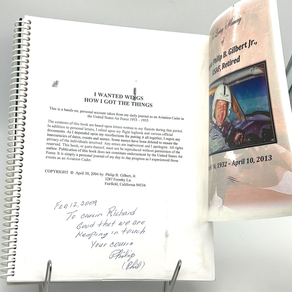 This signed aviation memoir by Philip B. Gilbert Jr. (Ret. USAF) takes you inside his real-life journey as an aviation cadet from 1953-1955 . Featuring color and black-and-white photographs , personal letters, and firsthand experiences, this rare, self-published book is a treasure for military and aviation enthusiasts. Comes along with Philip B. Gilbert Jr.'s Funeral pamphlet as well.