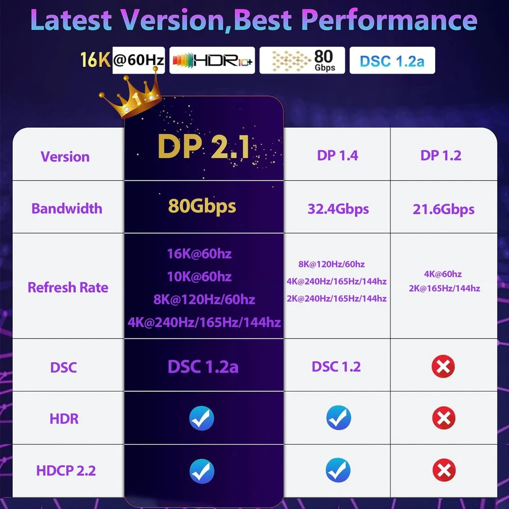 šŸš€ć€VESA Certified 16K DisplayPort Cable 2.1怑 The 16K DP to DP 2.1 cable is officially certified by VESA for exceptional quality. The DP 2.1 Cable supports high resolutions like 16K(15360*8640)@60Hz, 10K@60Hz, backward compatible with 8K@120Hz, 4K@240Hz, and 2K@360Hz and more. This is the only Display Port cable you'll need for the next decade. It's also backward compatible with DisplayPort 2.0, 1.4, 1.3, and 1.2. šŸŽ®ć€Optimal Choice for Gaming Enthusiasts怑16K displayport cable supports all popular graphics cards and monitors. Unlike 4K/8K DP cables, 16K displayport 2.1 can provide 80Gbps bandwidth, HBR3, DSC 1.2a. Dynamic HDR enhances dark scenes and details. The 32-bit audio captures enemy footsteps and breathing, especially in FPS and 3A masterpieces. Experience the thrill of multi-screen gaming with MTS multi-stream transmission. This is your all-in-one DisplayPort cable for the next decade. (Important: Exclusively for DP to DP connections, Not HDMI or Mini DP) šŸ’»ć€Wide Compatibility怑 Our DisplayPort to DisplayPort Cable 2.1/2.0 allows for a direct connection between DisplayPort-enabled desktops and laptops to monitors. It is compatible with various monitors, including Odyssey G8 G9 CHG90 CRG9, Ben Q, iiyama, Alienware monitors, and others. Additionally, it works seamlessly with popular graphics cards such as 4090, 4080ti, 4070ti, 3090, 7900XTX, and others. It supports DP, DP++, DisplayPort++, and G-Sync, Free-Sync, Adaptive-Sync, and is suitable for graphics cards and monitors with DisplayPort ports šŸ›”ļøć€Ergonomic Design & Anti-Interference怑The Green Jiss DP cable features a buckle-free and groove design at the port, reducing the chances of accidental damage. The groove design also makes it easier to remove the cable in tight spaces. The conductor is made of 28AWG tinned copper and has triple shielding to provide high resistance to EMI. In comparison to PVC cables, this cable is ten times more durable. Its double nylon braiding and 24K gold-plated connectors ensure that there are no artifacts or audio/video synchronization problems šŸ¤ć€Lifetime After-sale Service怑Each cable undergoes rigorous quality control to ensure optimal functionality. We go beyond selling cables by providing expert technical support to every customer. If you have any questions or concerns, feel free to contact us. There is a professional customer service team who will solve the problem for you within 24 hours.