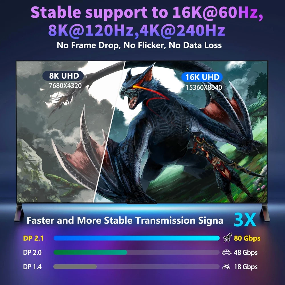 šćVESA Certified 16K DisplayPort Cable 2.1ć The 16K DP to DP 2.1 cable is officially certified by VESA for exceptional quality. The DP 2.1 Cable supports high resolutions like 16K(15360*8640)@60Hz, 10K60Hz, backward compatible with 8K120Hz, 4K240Hz, and 2K360Hz and more. This is the only Display Port cable you'll need for the next decade. It's also backward compatible with DisplayPort 2.0, 1.4, 1.3, and 1.2. š®ćOptimal Choice for Gaming Enthusiastsć16K displayport cable supports all popular graphics cards and monitors. Unlike 4K/8K DP cables, 16K displayport 2.1 can provide 80Gbps bandwidth, HBR3, DSC 1.2a. Dynamic HDR enhances dark scenes and details. The 32-bit audio captures enemy footsteps and breathing, especially in FPS and 3A masterpieces. Experience the thrill of multi-screen gaming with MTS multi-stream transmission. This is your all-in-one DisplayPort cable for the next decade. (Important: Exclusively for DP to DP connections, Not HDMI or Mini DP) š»ćWide Compatibilityć Our DisplayPort to DisplayPort Cable 2.1/2.0 allows for a direct connection between DisplayPort-enabled desktops and laptops to monitors. It is compatible with various monitors, including Odyssey G8 G9 CHG90 CRG9, Ben Q, iiyama, Alienware monitors, and others. Additionally, it works seamlessly with popular graphics cards such as 4090, 4080ti, 4070ti, 3090, 7900XTX, and others. It supports DP, DP++, DisplayPort++, and G-Sync, Free-Sync, Adaptive-Sync, and is suitable for graphics cards and monitors with DisplayPort ports š”ļøćErgonomic Design & Anti-InterferencećThe DP cable features a buckle-free and groove design at the port, reducing the chances of accidental damage. The groove design also makes it easier to remove the cable in tight spaces. The conductor is made of 28AWG tinned copper and has triple shielding to provide high resistance to EMI. In comparison to PVC cables, this cable is ten times more durable. Its double nylon braiding and 24K gold-plated connectors ensure that there are no artifacts or audio/video synchronization problems š¤ćAfter-sale ServicećEach cable undergoes rigorous quality control to ensure optimal functionality. We go beyond selling cables by providing expert technical support to every customer. If you have any questions or concerns, feel free to . There is a professional team who will solve the problem for you within 24 hours.