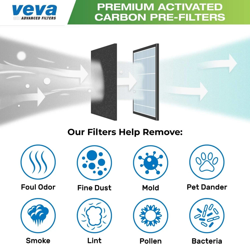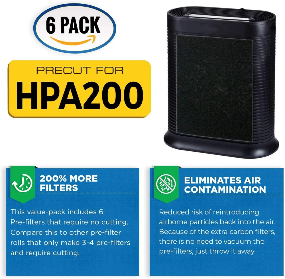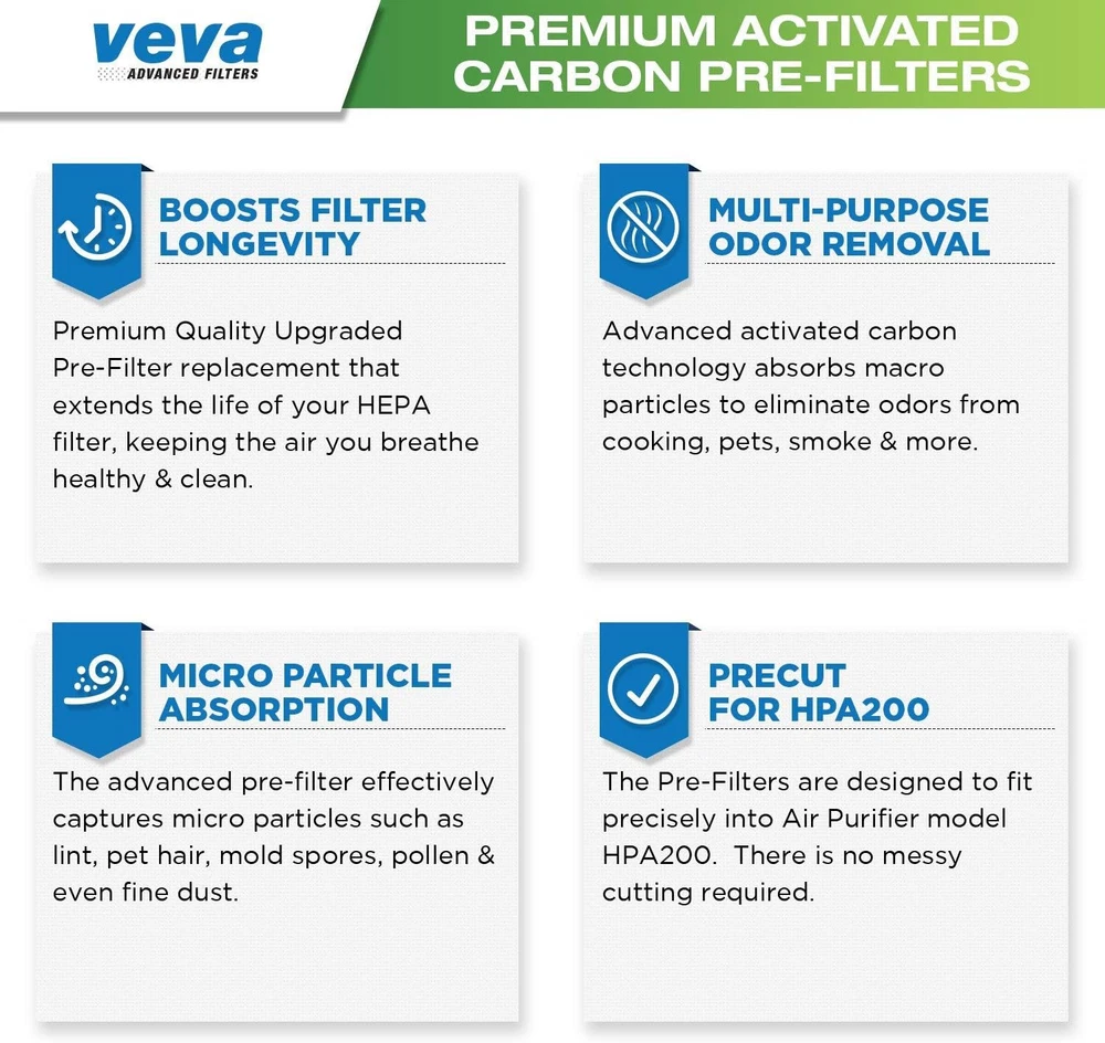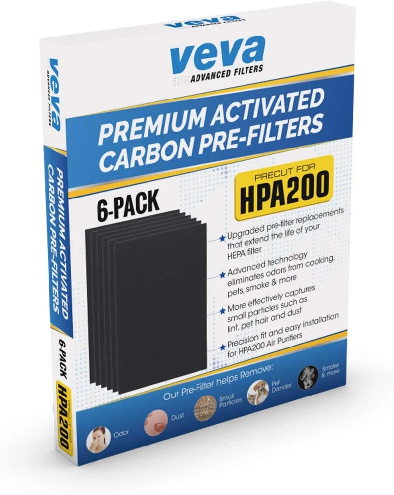 VEVA Air Purifier Filter Replacements - 6 Pack Precut & Compatible with Honey-well HPA200 Purifiers - Premium Activated Carbon Pre-Filters Product Details Is Discontinued By Manufacturer : No Product Dimensions : 11.26 x 0.2 x 13.9 inches; 9.59 ounces Item model number : AMAPF01F Manufacturer : VEVA Brand: VEVA Material: Carbon Fiber Product Dimensions: 11.25"L x 13.9"W x 0.2"Th Compatible Devices: Air Purifier UPC: 616010960984 Number of Items: 1 Manufacturer: VEVA Unit Count: 6.0 Count Compatible Air Purifier Models: Honeywell HPA200 Our high-quality, premium air filter replacements capture unwanted particles traveling through your home. Ideal for households with pets, cooking & smokers, our air purifier replacement pre-filters work to trap odors and purify your home. Our high-caliber charcoal air filter replacements are essential for keeping the air in your home healthy & clean. Precut and specially designed to be compatoble with and fit HW HPA200, 202, 204, and 250B air purifiers. Value pack includes 6 activated carbon pre-filters (11.25" x 13.9" x 0.2”). Our Goal is Keep Your Home Smelling Fresh and Clean with our Activated Carbon Pre Filters! Pet owners, smokers, people suffering from asthma or allergies trust VEVA Advanced Filters for their needs, whether to remove odors, smells, allergens, dander, pollen, pet hair, dust or smoke from their household.INCREDIBLE VALUE IN EACH PACK - With 6 filters in every pack, this may last up to 6 months for each filter depending on your usage. Lower quality replacement filters allow dust & particles to escape into your main HEPA filter which is costly to replace. SUPER FAST INSTALLATION - No more time consuming cutting and measuring you’ll have your machine running in a matter of minutes. These are specially cut and designed to be compatoble with and fit HW HPA 200, 202, 204, and 250B Air Purifiers. Pre Filter Dimensions: 11.25" x 13.9" x 0.2”.