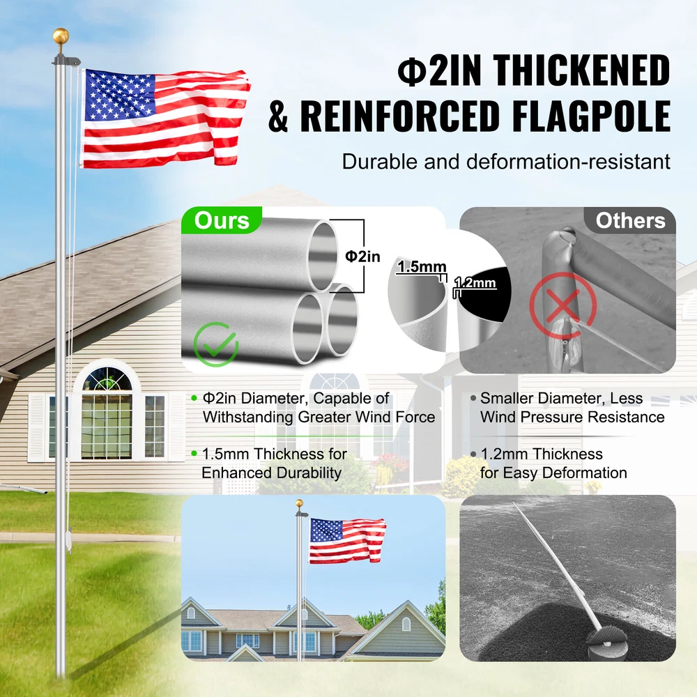 Document Product Description VEVOR Flagpole Kits- Showcase Your Pride and Glory Our an aluminum alloy flagpole kit is not only sturdy and durable but also lightweight and flexible. Its lightweight design allows for easy installation, while anodized oxidation ensures rust resistance and durability. Featuring a thick-walled design with a 2-inch diameter (Φ2in), our flagpole ensures robust bearing performance. It withstands severe weather conditions such as storms, harsh weather, and sun exposure, maintaining stability and shape integrity over extended use. Our pulley design of flag pole kit allows you to hang one or two flags or lower the flag to half-mast easily. The dual nylon ropes simplify operation, while the top gold ball not only enhances aesthetics but also complements solar light usage (not included). Our detachable flagpole kit includes detailed installation instructions. From installing the gold ball and pulley on the main pole to securing the flag with aluminum clips, installing the rope winder and fitting the detachable aluminum tube, and finally inserting the PVC pipe underground. Whether in a yard, commercial plaza, or corporate setting, our aluminum alloy flagpole adds a special ambiance to your environment. Experience patriotic pride amidst beautiful scenery and showcase your glory. Features & Details Upgraded Material & Structure: Our flagpole kit is made of high-strength aluminum alloy, lightweight yet sturdy. Treated for wind and rust resistance, it withstands high wind loads and is suitable for various harsh environments. The oxidized surface treatment enhances corrosion resistance, ensuring long-lasting aesthetics and durability. φ2in Thickened Flagpole: Our thickened flag pole has withstood the test of time and nature. Whether under scorching sun, strong winds and storms, or ice and snow, this flagpole remains stable and reliable, allowing you to use it with peace of mind without worrying about deformation or damage issues. Multiple Display Options: We provide double-stranded nylon ropes and flag clips, allowing you to hang 1 flags, 2 flags, or even display flags at half staff according to your needs. Whether in yards, squares, or commercial spaces, our product offers the most suitable display options to meet your requirements. Easy Installation: We offer comprehensive installation instructions and various accessories such as PVC pipes, balls, and aluminum clips, making it easy for you to assemble the flagpole. Ideal for users who prefer to independently complete assembly tasks, such as homeowners or veterans, making installation straightforward and manageable. Durable and Elegant: Our flags are made of 100% polyester fiber, vibrant in color and durable with minimal fading. Equipped with brass grommets for easy installation, they blend seamlessly into any environment, enhancing the appearance of the surroundings. Outdoors, they resist significant fading, making maintenance convenient and meeting your expectations for quality. SHIPPING ABOUT US PAYMENT RETURNS CONTACT WARRANTY Welcome to our eBay store. As a leading and emerging company in manufacturer and exporting business, we are specialized in Business and Industrial Products, Sporting Goods, Pet Products, Home and Garden products for more than 10 years. We believe that it is our vision and mission to provide innovative products with best service and competitive price to satisfy you. Our goal is to make sure that you can find exactly what you are looking for and make it easy for you to place your orders. We accept PayPal payment,PayPal Credit,Credit card or debit card and so on. Payment should be completed within 4 (Four) days of auction closing. Or unpaid dispute will be filed for closing auction. We will leave a positive feedback immediately after payment is received. We appreciate a positive feedback as much as you do. If for some reason there is any issue with the purchase, please contact us prior to leaving feedback, we will be glad to work together and provide a satisfying solution. Please be aware that PO Box cannot receive items, please DO NOT fill in the PO Box address. DELIVERY DAYS: 3-7 BUSINESS DAYS 3 BUSINESS DAYS SHIPPING OUT SHIP FROM CA & TX & NJ & GA & NC &OR WAREHOUSE California Warehouse: City of Industry, CA Texas Warehouse : Houston, TX New Jersey Warehouse : Perth Amboy, NJ New York State Warehouse: Perth Amboy, NJ Georgia Warehouse: Austell,GA North Carolina Warehouse: Grove NC Oregon Warehouse: AIRPORT WAY Portland,OR All of our items are backed with a 30-day return policy. We ensure all our items are new and in excellent condition prior to shipping. In case you receive the item that is not to the standards above, please contact us via e-Bay messages. All returns must be in new original condition as received and should be shipped with delivery confirmation Please note that all returns must be pre-approved by us. Unauthorized returns will not be accepted. If you need to return, please check twice to confirm the item not work and contact our customer service representative, let us know the detailed problem and send us some pictures for confirmation. We ONLY accept returns with original package. Please make sure that item has NO man-made sabotage. Used items will not be accepted for return. Email Customer Support: 9:00am-2:00am PST Sunday-Friday All emails will be responded to within 12-24 hours This item comes with 12 months Warranty from the date of customers purchased it. Special circumstances will be listed clearly in the listing. If your item has been damaged in transit or become faulty in warranty period, please email us with pictures or video to show the problem. Please do check everything carefully after you received the parcel, any the damage except DOA (Dead-On-Arrival) would not be covered if it's your fault. Replacement products are provided with the same warranty as the returned products. VEVOR is a leading brand that specializes in equipment and tools. Along with thousands of m