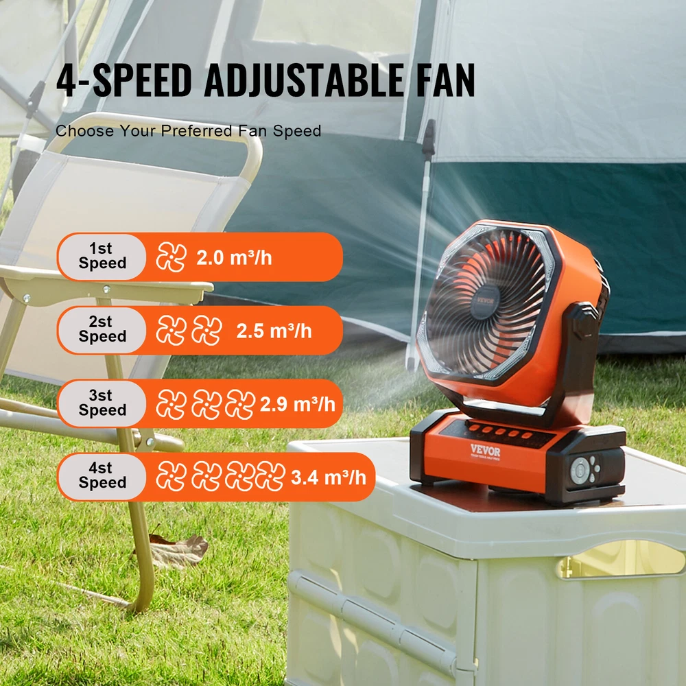 Document Product Description VEVOR Rechargeable Fan - Enjoy Cool Breezes in Summer The VEVOR desktop charging fan features a brushless motor and dual fan blade design, increasing airflow and offering 4 adjustable fan speeds for various wind modes to meet different needs. It is compact, lightweight, and easy to carry, making it ideal for picnics, barbecues, car trips, and more. This desktop charging fan is built on an aerodynamically stable fan structure, combining ventilation, lighting, and charging functions in one unit to cater to different usage needs, allowing you to easily enjoy outdoor camping fun during the summer. Our charging fan features a brushless motor and a dual fan blade design, increasing airflow and providing a more powerful breeze compared to regular products. This ensures your comfort even in hot weather, allowing you to quickly enjoy a cool breeze. The fan has a built-in high-capacity battery and uses the latest fast charging technology, requiring just 9-10 hours for a full charge. With a single charge, it can run continuously for 72 hours at the lowest fan speed setting, keeping you cool and comfortable throughout the day. Come with 16 surrounding LED lights with 3 levels of adjustable brightness, providing an ideal light source for nighttime outdoor activities. The fan has a stable base that securely holds the fan even during high-speed operation. Features & Details Three-in-One Design: The desktop charging fan combines ventilation, lighting, and charging functions in one unit, allowing you to choose the desired function according to your needs. It can meet various usage requirements, making it an essential outdoor travel accessory for you to easily enjoy summer camping fun. Powerful Performance: This charging fan features a brushless motor and dual fan blade design, which increases airflow and quickly cools down. It offers 4 adjustable fan speeds, allowing you to freely choose from various wind modes according to your preferences. High-Quality Battery: This desktop charging fan is powered by a 20,000mAh rechargeable battery, providing a long working time of up to 60 hours at the lowest fan speed. This ensures prolonged cooling, and it can be fully charged in 9-10 hours. Thoughtful Details: This fan has 16 LED lights with a night mode that dims the screen for comfortable sleep, 3 brightness levels for ideal nighttime lighting, automatic oscillation at 45 or 90 degrees, manual rotation up to 270 degrees, manual rotation left and right by 360 degrees, a stable base for secure placement, and a hidden hook for convenient hanging. Wide Application: This table fan is compact, lightweight, and easy to carry, making it suitable for outdoor activities such as camping, fishing, traveling, picnicking, barbecues, car trips, and outdoor parties. It is also suitable for indoor activities like studying, working, reading, and exercising. SHIPPING ABOUT US PAYMENT RETURNS CONTACT WARRANTY Welcome to our eBay store. As a leading and emerging company in manufacturer and exporting business, we are specialized in Business and Industrial Products, Sporting Goods, Pet Products, Home and Garden products for more than 10 years. We believe that it is our vision and mission to provide innovative products with best service and competitive price to satisfy you. Our goal is to make sure that you can find exactly what you are looking for and make it easy for you to place your orders. We accept PayPal payment,PayPal Credit,Credit card or debit card and so on. Payment should be completed within 4 (Four) days of auction closing. Or unpaid dispute will be filed for closing auction. We will leave a positive feedback immediately after payment is received. We appreciate a positive feedback as much as you do. If for some reason there is any issue with the purchase, please contact us prior to leaving feedback, we will be glad to work together and provide a satisfying solution. Please be aware that PO Box cannot receive items, please DO NOT fill in the PO Box address. DELIVERY DAYS: 3-7 BUSINESS DAYS 3 BUSINESS DAYS SHIPPING OUT SHIP FROM CA & TX & NJ & GA & NC &OR WAREHOUSE California Warehouse: City of Industry, CA Texas Warehouse : Houston, TX New Jersey Warehouse : Perth Amboy, NJ New York State Warehouse: Perth Amboy, NJ Georgia Warehouse: Austell,GA North Carolina Warehouse: Grove NC Oregon Warehouse: AIRPORT WAY Portland,OR All of our items are backed with a 30-day return policy. We ensure all our items are new and in excellent condition prior to shipping. In case you receive the item that is not to the standards above, please contact us via e-Bay messages. All returns must be in new original condition as received and should be shipped with delivery confirmation Please note that all returns must be pre-approved by us. Unauthorized returns will not be accepted. If you need to return, please check twice to confirm the item not work and contact our customer service representative, let us know the detailed problem and send us some pictures for confirmation. We ONLY accept returns with original package. Please make sure that item has NO man-made sabotage. Used items will not be accepted for return. Email Customer Support: 9:00am-2:00am PST Sunday-Friday All emails will be responded to within 12-24 hours This item comes with 12 months Warranty from the date of customers purchased it. Special circumstances will be listed clearly in the listing. If your item has been damaged in transit or become faulty in warranty period, please email us with pictures or video to show the problem. Please do check everything carefully after you received the parcel, any the damage except DOA (Dead-On-Arrival) would not be covered if it's your fault. Replacement products are provided with the same warranty as the returned products. VEVOR is a leading brand that specializes in equipment and tools. Along with thousands of motivated employees, VEVOR is dedicated to providing our customers with tough equipment & tools at incredibl