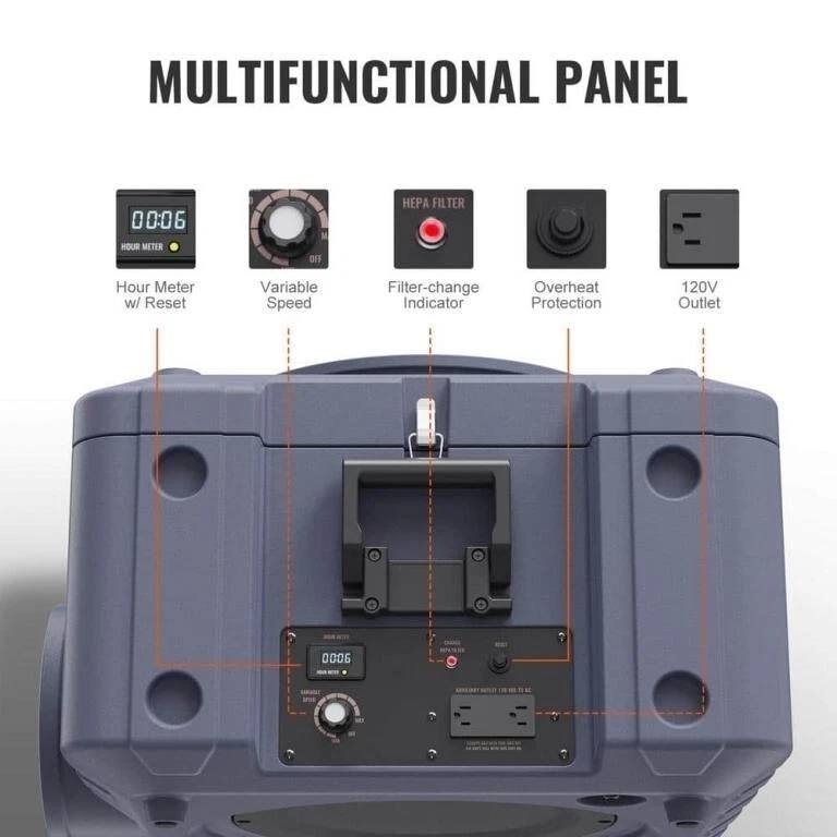 VEVOR's Air Scrubber is a robust addition to any space needing purification. With a 550 CFM airflow, it efficiently cleans the air of dust, pollen, and other particles. The unit features a 3-stage filtration system, including a MERV10 filter, activated carbon, and an H13 HEPA filter, ensuring that the air exiting the machine is clean and fresh. Designed for versatility, this portable air purifier is easy to move around as needed. It operates through an electrical power source and comes with a generous 23-foot power cord. The unit's dimensions, with a 15.5-inch air inlet and an 8.5-inch outlet, make it a practical size for a variety of settings. The gray color provides a sleek, contemporary look.