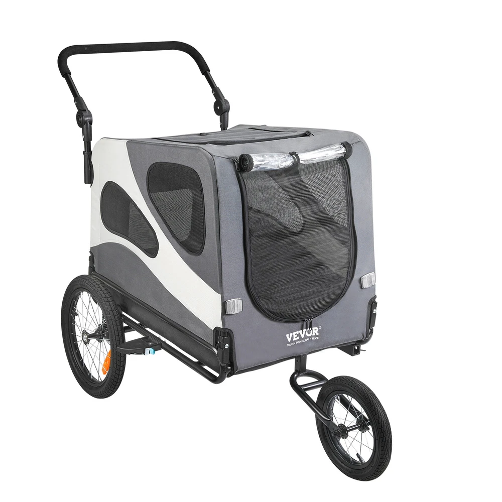 Document Product Description VEVOR Pet Bike Trailer – A Fun Way to Travel Our dog bike trailer provides a roomy compartment where your furry friend can relax while you ride. It's perfect for a medium-sized dog or multiple smaller ones up to 26" tall, with a load limit of 100 lbs/45 kg. Crafted from top-notch materials, our pet bike carrier is made for durability. Tear-resistant mesh on the inside ensures stability, while the exterior's tough texture adds grip. The transparent front door of this bike pet trailer features weather protection and a four-sided mesh design for a comfortable riding experience. Your pet can easily enter through the zippered front and rear doors. We've added a high-visibility flag and four reflectors to make your dog bike carrier easily noticeable on the road, even in low-light conditions. Setting up our bike dog carrier is a piece of cake. No special skills or tools are needed. Even newcomers can have it ready to roll, giving you more time for fun adventures with your pet. Features & Details 2-in-1 Design: This dog bike trailer is your perfect partner for leisurely bike rides and active jogging sessions. It easily transforms from a bicycle trailer to a jogging stroller. It fits most bicycles with wheel diameters of 22-28 inches and can carry up to 100 lbs/45 kg, making it effortless to take your furry companion on adventures. Smooth Riding: Our pet bike carrier ensures a comfortable journey with the built-in shock absorber. Security is a priority with a reliable parking brake to prevent any unexpected movement. Plus, the adjustable handle caters to people of all heights, ranging from 33.07"/840 mm (at a 90° angle) to 44.69"/1135 mm (at a 180° angle). Premium Materials for Durability: This dog bike carrier is built tough with a powder-coated steel frame and waterproof, sunproof 600D polyester fabric. The front door features a zippered mesh layer and a PVC canvas layer. Fold the PVC canvas for a cool breeze, or lower it to keep your pet dry. Let your dog enjoy the ride! Easy In, Easy Out: Getting your pet in and out is a breeze with this pet bike trailer. The transparent front door provides protection from wind and rain while ensuring excellent ventilation. Your pet can hop in through the zippered front and rear doors and even stick their head out, all with ease. Quick Connect and Fold: Assembling our bike dog carrier is a snap, quickly connecting to your bike via a coupler. The wheels are removable, and the frame folds and flips for convenient storage and transportation. SHIPPING ABOUT US PAYMENT RETURNS CONTACT WARRANTY Welcome to our eBay store. As a leading and emerging company in manufacturer and exporting business, we are specialized in Business and Industrial Products, Sporting Goods, Pet Products, Home and Garden products for more than 10 years. We believe that it is our vision and mission to provide innovative products with best service and competitive price to satisfy you. Our goal is to make sure that you can find exactly what you are looking for and make it easy for you to place your orders. We accept PayPal payment,PayPal Credit,Credit card or debit card and so on. Payment should be completed within 4 (Four) days of auction closing. Or unpaid dispute will be filed for closing auction. We will leave a positive feedback immediately after payment is received. We appreciate a positive feedback as much as you do. If for some reason there is any issue with the purchase, please contact us prior to leaving feedback, we will be glad to work together and provide a satisfying solution. Please be aware that PO Box cannot receive items, please DO NOT fill in the PO Box address. DELIVERY DAYS: 3-7 BUSINESS DAYS 3 BUSINESS DAYS SHIPPING OUT SHIP FROM CA & TX & NJ & GA & NC &OR WAREHOUSE California Warehouse: City of Industry, CA Texas Warehouse : Houston, TX New Jersey Warehouse : Perth Amboy, NJ New York State Warehouse: Perth Amboy, NJ Georgia Warehouse: Austell,GA North Carolina Warehouse: Grove NC Oregon Warehouse: AIRPORT WAY Portland,OR All of our items are backed with a 30-day return policy. We ensure all our items are new and in excellent condition prior to shipping. In case you receive the item that is not to the standards above, please contact us via e-Bay messages. All returns must be in new original condition as received and should be shipped with delivery confirmation Please note that all returns must be pre-approved by us. Unauthorized returns will not be accepted. If you need to return, please check twice to confirm the item not work and contact our customer service representative, let us know the detailed problem and send us some pictures for confirmation. We ONLY accept returns with original package. Please make sure that item has NO man-made sabotage. Used items will not be accepted for return. Email Customer Support: 9:00am-2:00am PST Sunday-Friday All emails will be responded to within 12-24 hours This item comes with 12 months Warranty from the date of customers purchased it. Special circumstances will be listed clearly in the listing. If your item has been damaged in transit or become faulty in warranty period, please email us with pictures or video to show the problem. Please do check everything carefully after you received the parcel, any the damage except DOA (Dead-On-Arrival) would not be covered if it's your fault. Replacement products are provided with the same warranty as the returned products. VEVOR is a leading brand that specializes in equipment and tools. Along with thousands of motivated employees, VEVOR is dedicated to providing our customers with tough equipment & tools at incredibly low prices. Today, VEVOR's products are sold in more than 200 countries and regions with 10 million plus members worldwide. VEVOR Pet Bike Trailer – A Fun Way to Travel Our dog bike trailer provides a roomy compartment where your furry friend can relax while you ride. It's perfect for a medium-sized dog or multiple smaller ones up to 26" tall, w