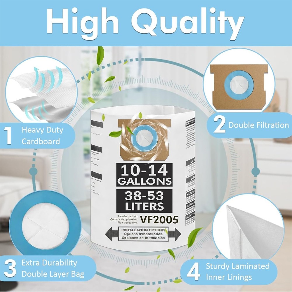 VF2005 Bags Compatible with Shop Vac Bags 10-14 Gallon, Type I 90672 9067200