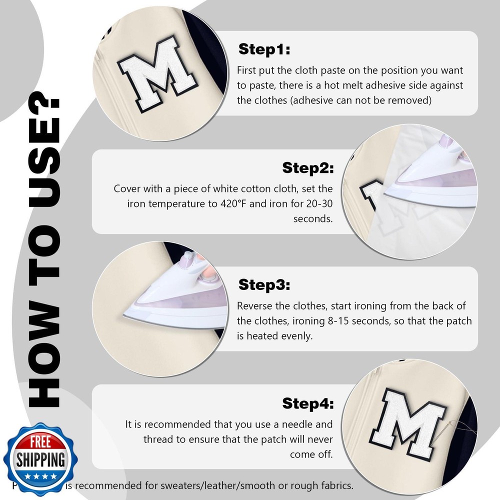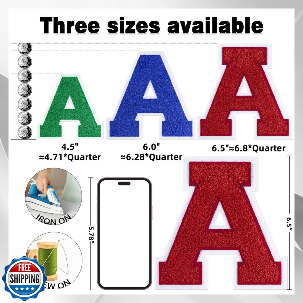 VGROSIA 6-1/2" White Iron On Letters Large Varsity Letter Patches Large Chenille Letterman Jacket Patches Iron On Patch for Jacket/Hoodie/Varsity J Features VARSITY LETTERS IRON ON PATCHES: Letter patches iron on make your clothing look more individual and attractive in daily life, used on varsity team clothing can make you or your team the most unique. CHENILLE LETTER PATCHES: These iron on letters for clothing can be used for holes jackets, which can help you repair your favorite clothes to avoid being thrown away. CHENILLE PATCHES IRON ON: Every patch has a durable adhesive glue on the back for iron-on transfers or sewing onto fabrics. Iron on varsity letters made of exquisite embroidered nonwovens, which can be used and washed for a long time LARGE IRON ON LETTERS: 1Pcs chenille letters in one package,each letter about 6.5 inch(height) Color:White AFTER SALES SERVICE:If you have any questions about this iron on letters for fabric, please let us know and we will provide you with a satisfactory solution within 24 hours. We hope that our products can bring you joy and satisfaction Shipping Free & Fast Shipping: We offer free shipping to most of the USA with a normal delivery time of 3-7 days. However, due to the current situation, additional delivery time (up to 3 weeks) may be required for some items. Alternative Carriers: We may use alternative carriers (e.g., USPS, FedEx, UPS) to ensure your package arrives safely and on time. Due to the use of multiple carriers, we are unable to provide a tracking number automatically. Handling Time: Orders are processed and shipped within 1-2 business days of receiving cleared payment. Shipping Restrictions: Shipping to Alaska, Hawaii, Puerto Rico, Guam, and other US territories may incur shipping charges or delivery restrictions. Please contact us before ordering, or your order can be refunded/cancelled. State Restrictions: Certain items may not be shipped to California due to state regulations. Contact for Tracking Updates: If you require tracking updates or have any concerns about the delivery of your order, please feel free to contact us, and we will be happy to assist you. Return Policy 30-Day Hassle-Free Returns: If you are not completely satisfied with your purchase, you can return the item for free within 30 days of receiving it for a full refund or exchange. Easy Return Process: Contact us, and we will provide you with a prepaid return shipping label and detailed instructions. No Restocking Fee: There are no restocking fees for returns. However, the buyer is responsible for return shipping costs if the return is not due to a seller's error. Refund Processing: Refunds will be processed within 1 business day of receiving the returned item in its original condition. Feedback Your feedback is extremely important to us. We strive to provide the best products and customer service possible. If you are satisfied with your purchase, please take a moment to leave us a positive review. If you have any concerns or issues with your order, please contact us before leaving negative feedback. We are committed to resolving any problems and ensuring your satisfaction. Contact Us If you have any questions or concerns, please feel free to reach out to our customer support team. You can contact us through the eBay messaging system. We are available Monday to Friday, 9:00 am to 5:00 pm EST, and we will do our best to respond to your inquiry within 24 hours. Thank you for supporting our small family business!