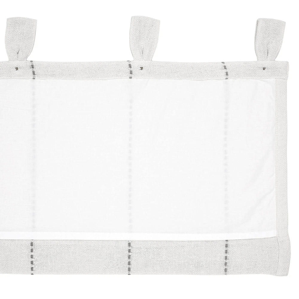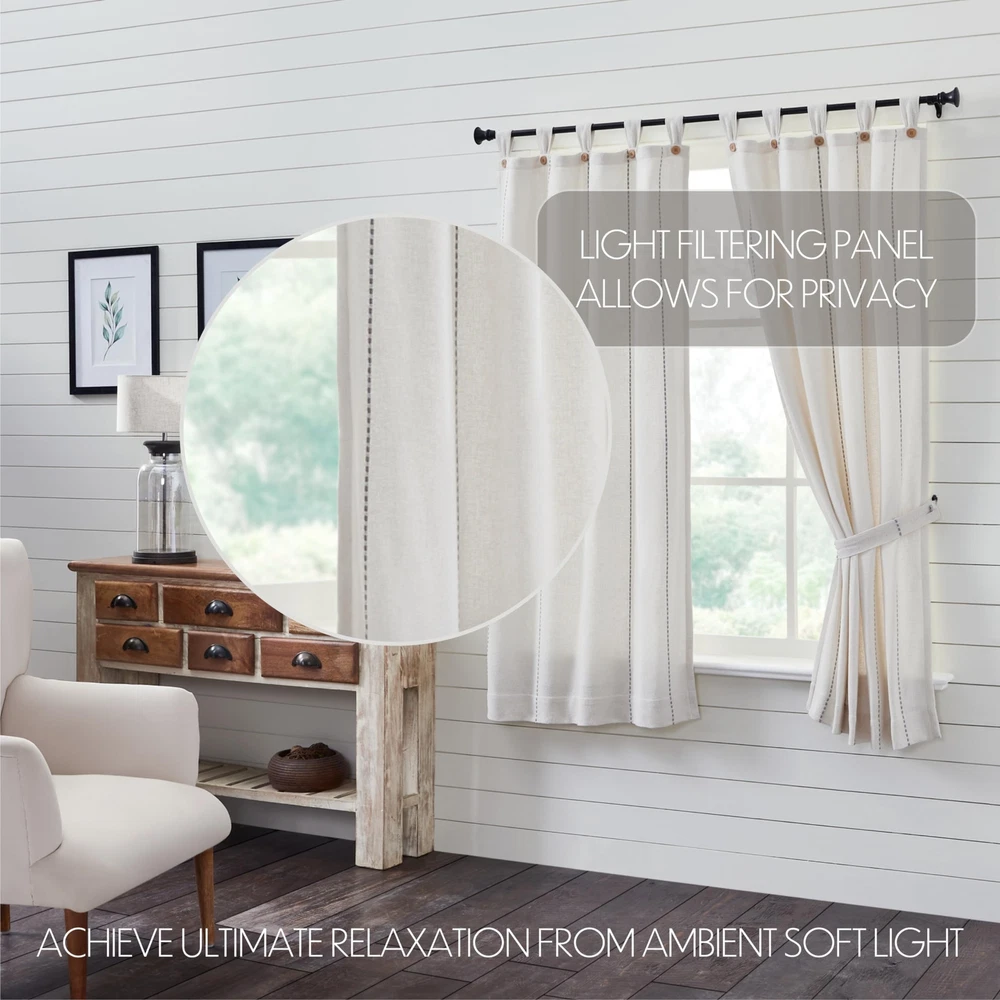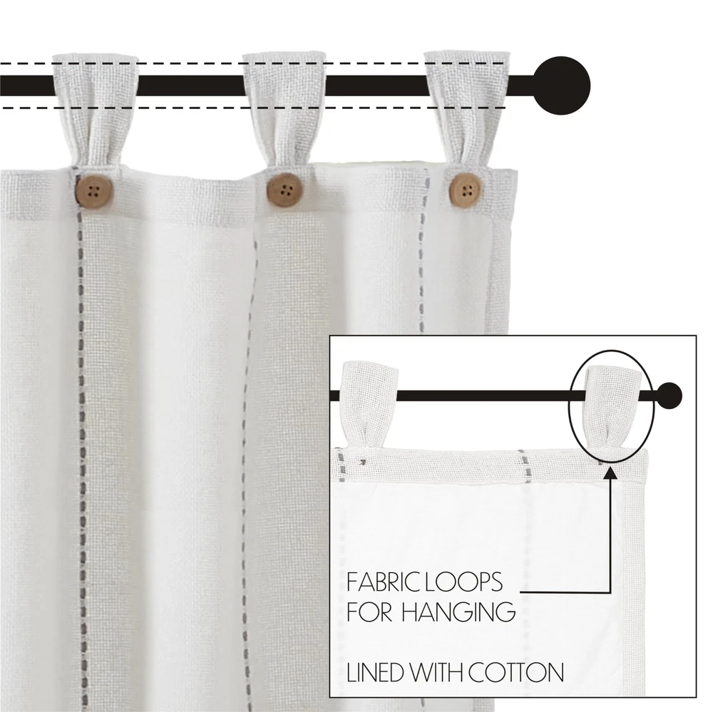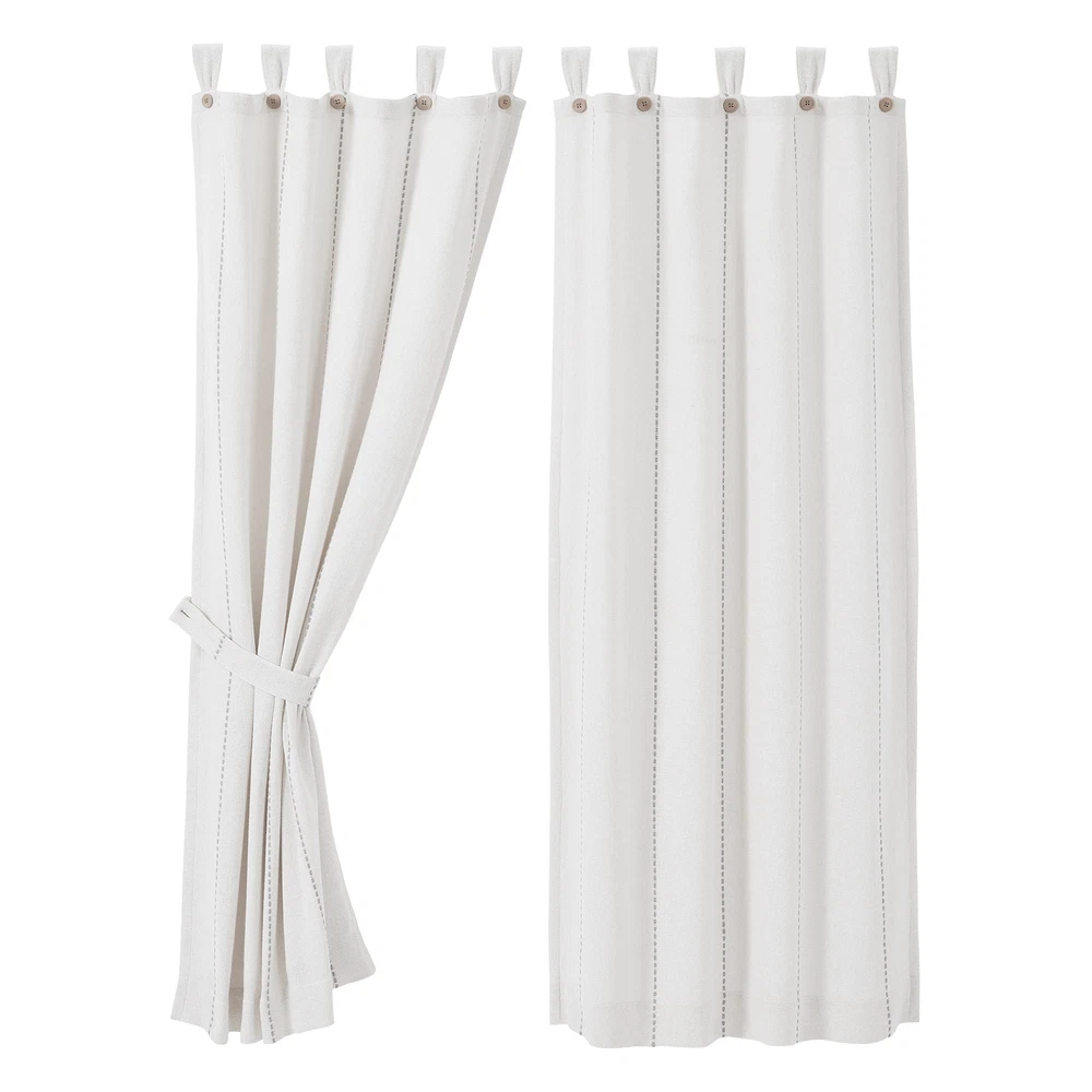 FARMHOUSE CURTAINS: Includes two 63 by 36 inch panels made from high-quality, textured white burlap with dove grey stitching. Features a white cotton lining and a tab top for easy hanging. Includes matching tie backs. Tabs not included in the overall dimensions. LIGHT FILTERING: Lined to provide additional privacy while filtering out harsh outside light. FLEXIBLE STYLING: White burlap blends easily into farmhouse, cottage, and modern country home decor. EASY CARE: Machine wash on gentle and tumble dry on low. Iron safe. When washed, the weave tightens. Gently iron to relax the weave and return burlap to its original state. BURLAP CHARM: Cozy texture, white burlap and dove gray stitching details create a relaxed yet fashionable rustic look.