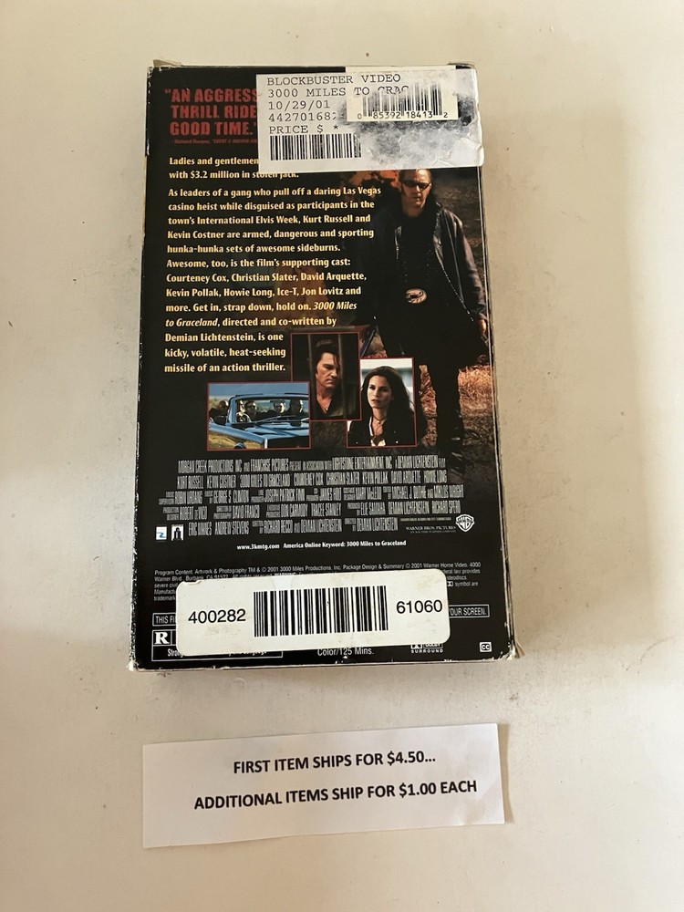 Actor: Kurt Russell Movie/TV Title: 3000 Miles to Graceland Leading Role: Kevin Costner, Kurt Russell Director: Stephen Miner, Steve Miner, Demian Lichtenstein Rating: R UPC: 085392184132 Country of Origin: United States Signal Standard: NTSC Release Year: 2001 Seller Notes: “Good+ Condition” Studio: Warner Home Video Genre: Action & Adventure Former Rental: Yes Edition: Full Screen Language: English Materials sourced from: United States gtin13: 085392184132 Sub-Genre: Thriller