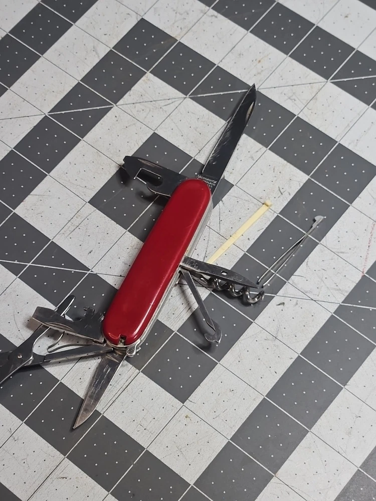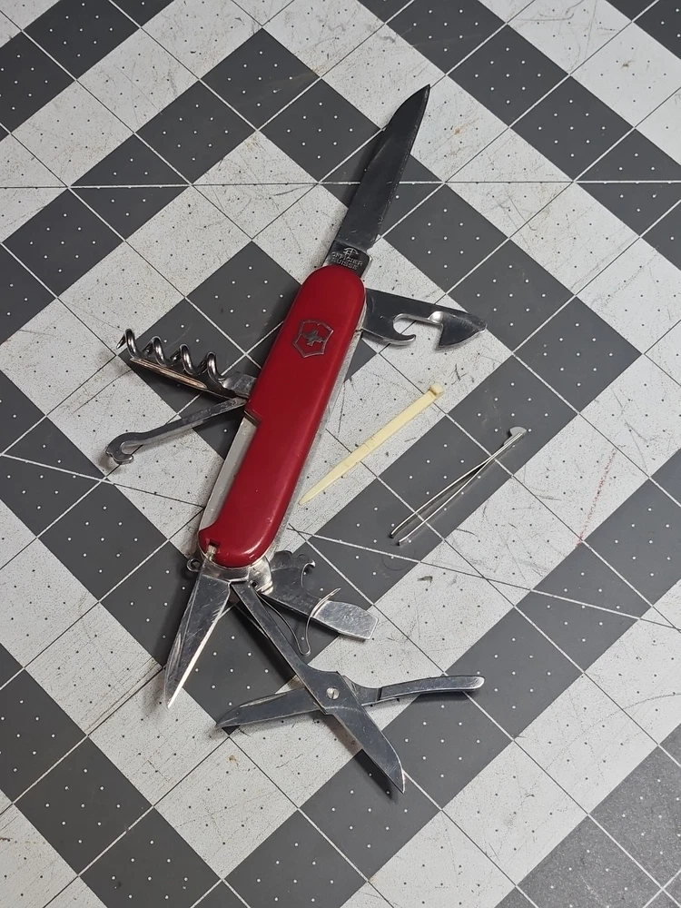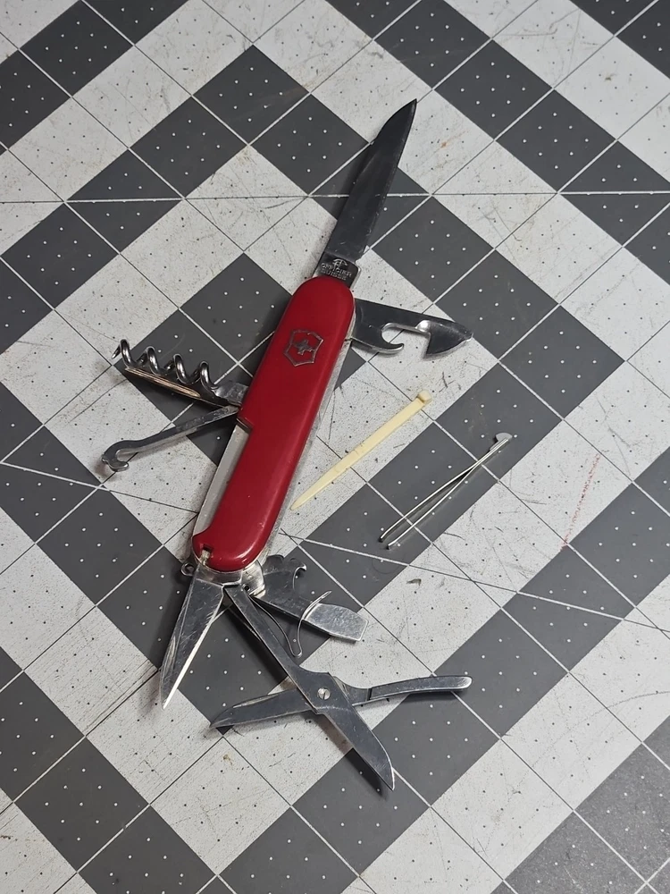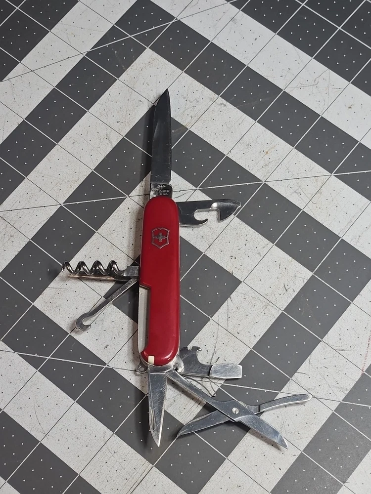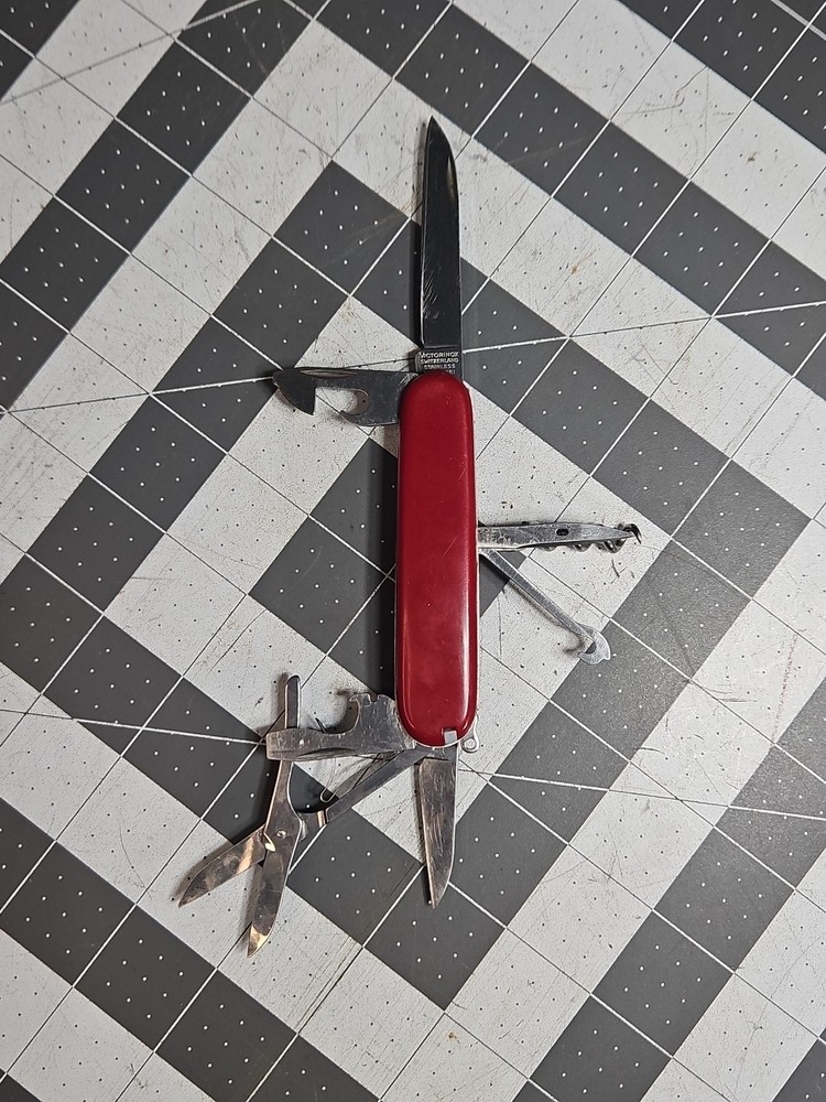VICTORINOX "Huntsman" Swiss Army Knife 15 Functions Officier Suisse GUC Worn Good used condition. Light wear from age and use. Markings from age and use. See pictures Product will be shipped timely and packaged with care. Offers are encouraged. Please feel free to reach out with questions. Please see pictures. Thank you. The VICTORINOX Huntsman Swiss Army Knife is a 15-function tool that is perfect for any outdoor enthusiast. It features a manual opening mechanism and three blades made of high-quality plastic. The red handle adds a pop of color to the knife, making it easy to find in a crowded toolbox. This knife is a great addition to any collection and is sure to impress. HLB2 hunts