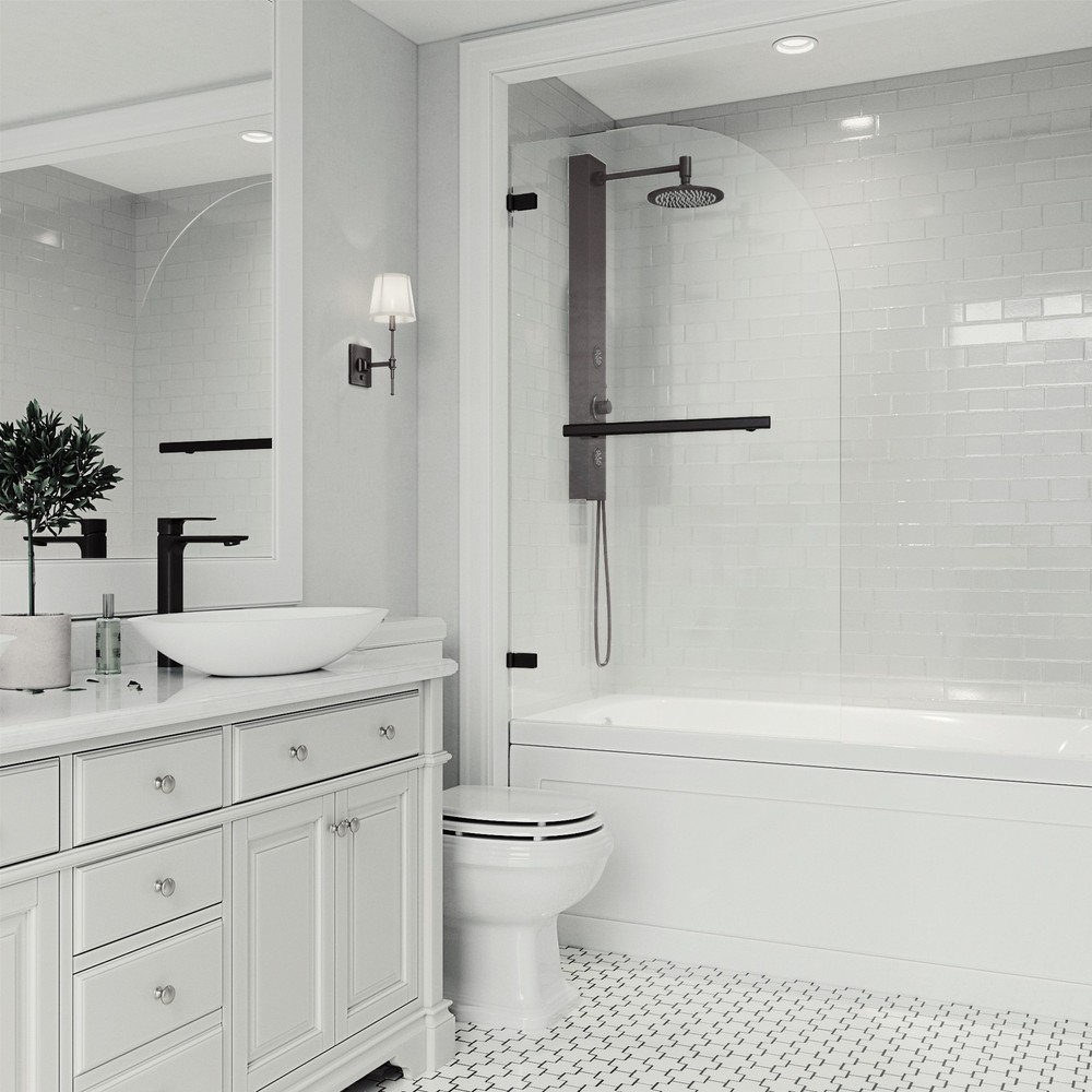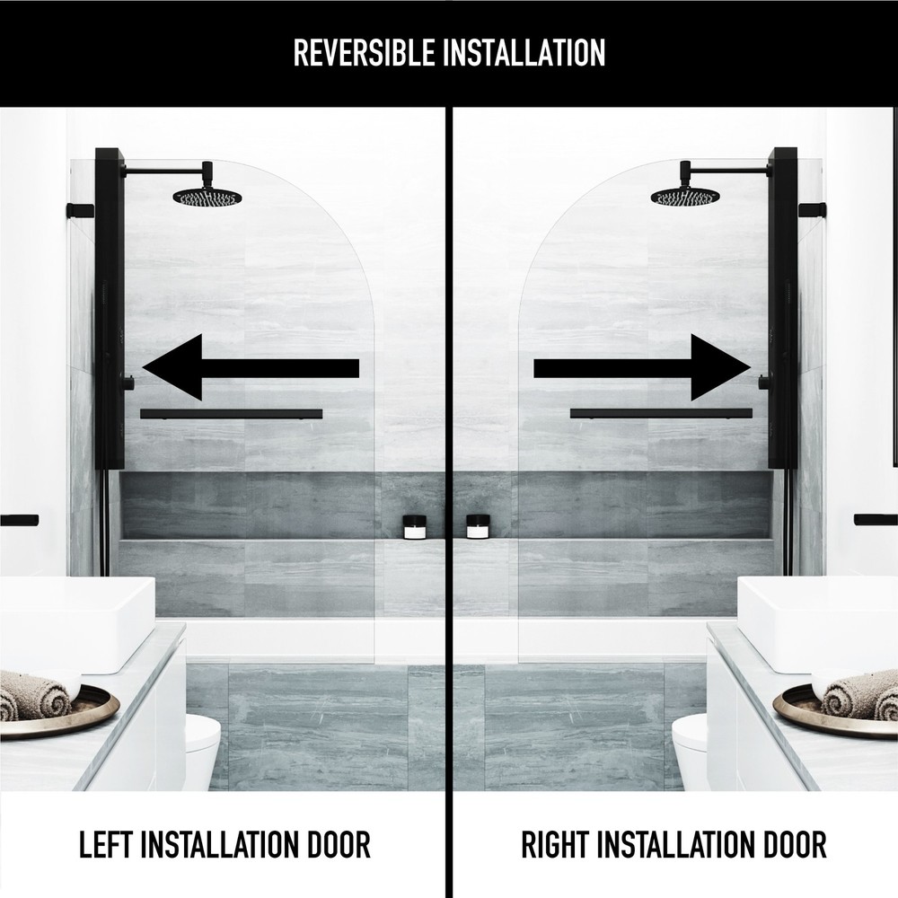 Avant-garde and super sleek, the VIGO Orion Bathtub Door is a fashion-forward way to update any bathtub setup. Made from 5/16" tempered glass, this door neatly swings outward for an easy bathtub entry. The large, horizontal door handle doubles as a towel bar. Its 7-layer coated finish resists corrosion, rust, and tarnish for longevity. Enjoy the Orion today, tomorrow, and for years to come. FEATURES:RECTANGULAR HINGES: Sleek-looking hinges with a rectangular configuration add style to functionTEMPERED GLASS: Spot-free and incredibly safe, this glass resists dangerous breakage and shardsREVERSIBLE DOOR INSTALLATION: Install with a left or right-side door openingPREMIUM FINISHES: Hardware features 7-layer coating process on finishes to resist rust, corrosion, and tarnishPRE-DRILLED GLASS: Free Shipping Over $49.99* Details VIGO Orion 34" W x 58" H Frameless Hinged Tub Door in Matte Black Product Description: Avant-garde and super sleek, the VIGO Orion Bathtub Door is a fashion-forward way to update any bathtub setup. Made from 5/16" tempered glass, this door neatly swings outward for an easy bathtub entry. The large, horizontal door handle doubles as a towel bar. Its 7-layer coated finish resists corrosion, rust, and tarnish for longevity. Enjoy the Orion today, tomorrow, and for years to come. FEATURES: RECTANGULAR HINGESSleek-looking hinges with a rectangular configuration add style to function TEMPERED GLASSSpot-free and incredibly safe, this glass resists dangerous breakage and shards REVERSIBLE DOOR INSTALLATIONInstall with a left or right-side door opening PREMIUM FINISHESHardware features 7-layer coating process on finishes to resist rust, corrosion, and tarnish PRE-DRILLED GLASSTempered glass has been pre-drilled for towel bar installation LEAK FREEFull length clear seal strips keep tub door waterproof where door and side panels overlap EASY ENTRYHinged door swings outward for easy bathtub entry GLASS CERTIFICATIONS5/16" ANSI Z97.1 and 16 CFR 1201- certified clear tempered glass VERSATILE STYLEInstall in a variety of bathrooms, regardless of design aesthetic SOLID BRASS HARDWARETub door hardware is made from solid brass construction BOTTOM SEAL STRIPWater is redirected toward inside of tub with bottom seal strip CONSISTENT FINISH GUARANTEEAll VIGO products are coated and plated under one roof to guarantee consistency in color and finish ALL PARTS INCLUDEDAll mounting hardware included in packaging NON-INTRUSIVEDoor installs easily with a variety of setups including whirlpool tubs for non-intrusive alignment SILENT CLOSUREHundreds of reviews confirm the silent closure of this sliding glass bath tub door FRUSTRATION FREEDetailed, intuitive instructions allow for simple, one-day installation