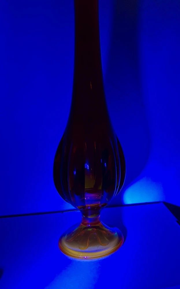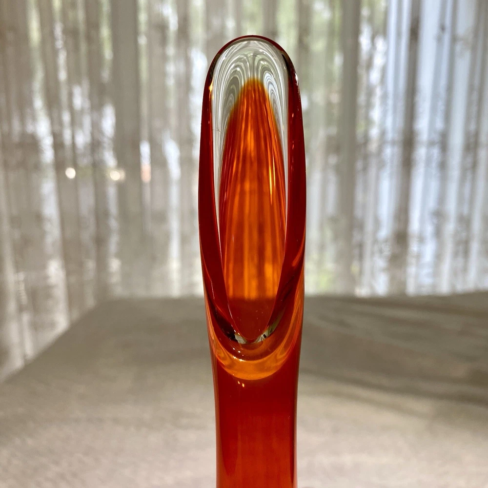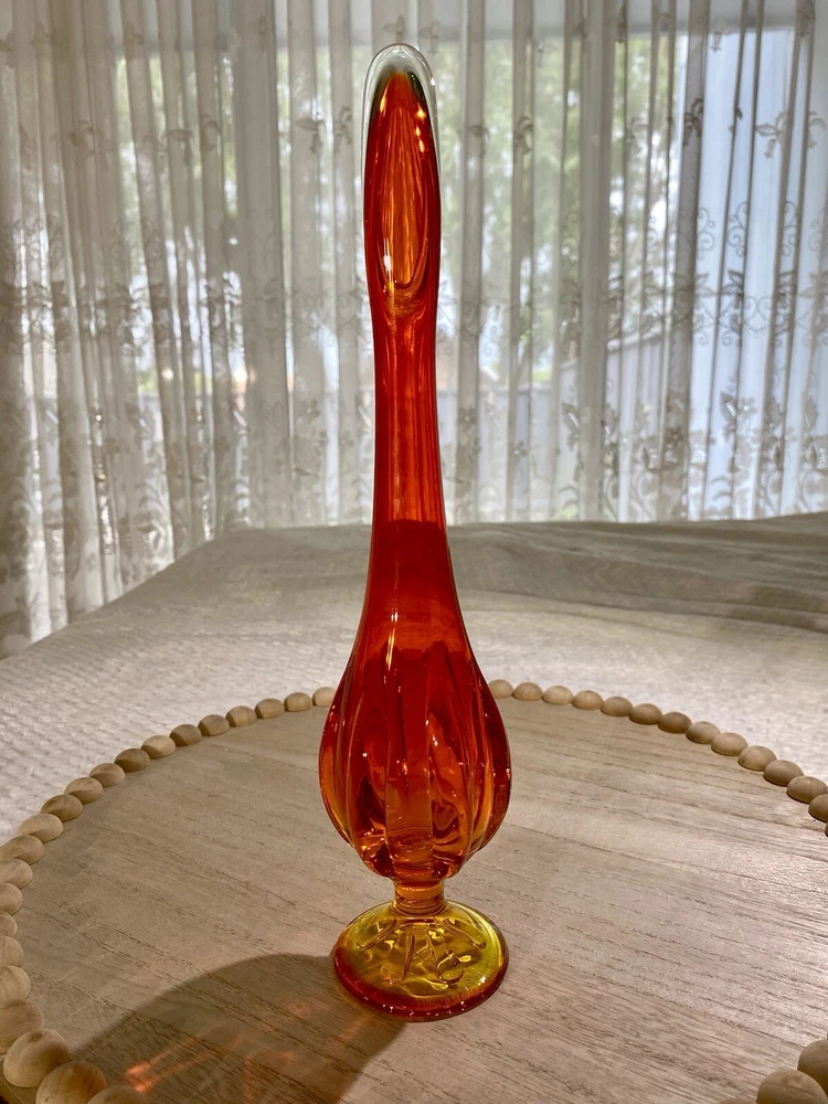 EDIT: If you like this listing, see a similar listings in 18.5 inches - available at my eBay store YUNI SNOW. This item is a vintage VIKING GLASS, acquired in the early 2000's. It features a handmade amberina swung vase. Amberina is an American art glass that refers to a graduation in color. The colors of this vase transitions from red orange to an orange yellow base, and it features the persimmon 6-petal design on the pedestal base. The glass is removed from the base mold and "swung" while still in its hot and elastic form to its desired length. The item glows under UV lighting. Made in the U.S.A. Height: 12 in Diameter: 2.75 in Weight: 11.9 oz These measurements are Seller's best approximations. Vintage. Pre-owned and in excellent condition. No flaws observed. Please see all photos. SHIPPING: From Hawaii. All items will be weighed, photographed and/or video-recorded while item is prepared for shipment. Shipping of items will always prioritize the care and safety of the item, but at times will use recyclable materials (to include boxes and packaging materials). The packaging may not be aesthetically pleasing, but will be safe and secure. DISCLAIMER: All photographs provided do not use filters with any intent to alter or improve the appearance or condition of the item. All items are inspected carefully and flaws are photographed and presented as transparently as possible to The Buyer. All measurements provided are done to the best of the ability by The Seller. If you have any further questions pertaining to the description of this item, please contact The Seller BEFORE purchasing or placing an offer.