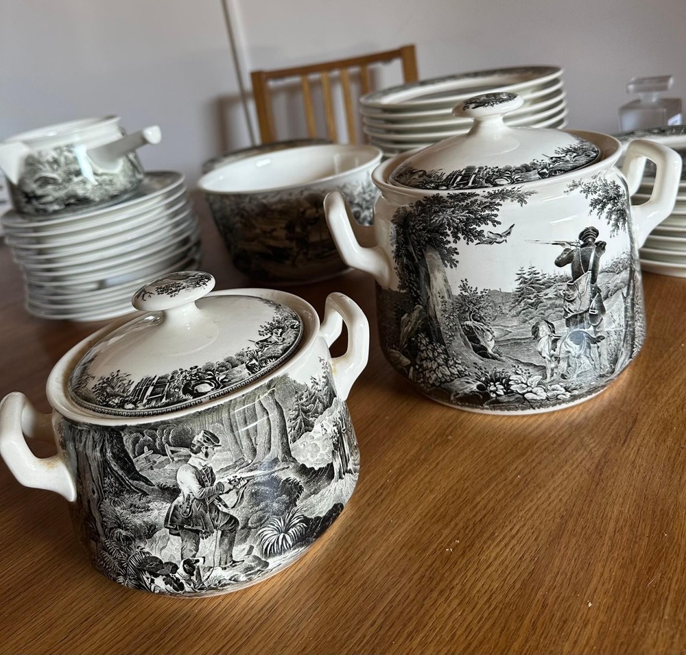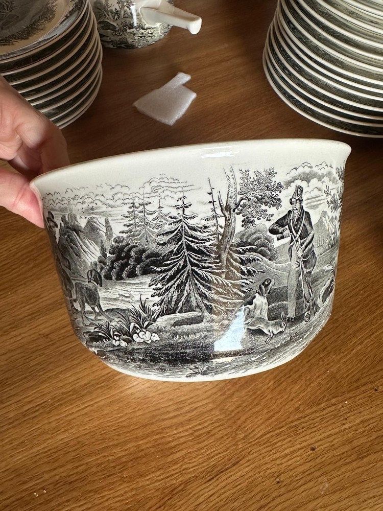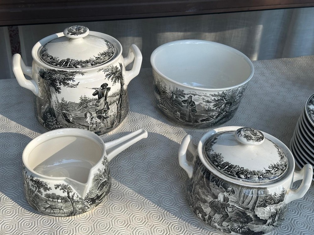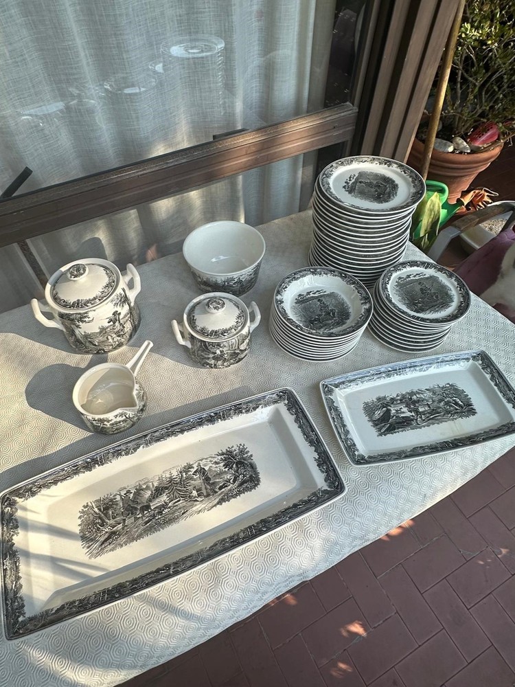Collezione Artemis, anni ‘50/’60, manifattura tedesca, calcografia su lastra rame applicata sotto smalto. Motivo: scena caccia tradizionali. Monocromatico nero su bianco/crema. Prestigioso servizio completo per 10 persone, per un totale di 47 pezzi così suddivisi: • Piatti fondi – 10 pezzi • Piatti piani – 20 pezzi • Piattini dessert – 10 pezzi • Vassoi di portata, varie dimensioni: 3 pezzi • Zuppiere con coperchio, varie dimensioni: 2 pezzi • Terrina con manico; 1 pezzo • Porta frutta: 1 pezzo Nel suo assieme, il set appare in ottime condizioni. Si notano due scheggiature come da foto (su un piatto piano ed uno da dessert) ed alcune macchie del tempo coerenti con l’età ed il materiale. Naturalmente disponibile a fornire ulteriori dettagli, foto e/o dimensioni dei componenti. INFO per la CONSEGNA. Le dimensioni totali (approssimative) sono: 60x60x60 cm, 25 kg. Se ritiro a mano, la zona principale di riferimento è Roma Sud (Eur). Se spedito, il costo è a carico acquirente: quanto indicato è di riferimento, ma il valore definitivo sarà da valutare e concordare in funzione della destinazione finale (Italia o estero).