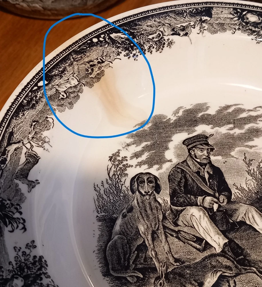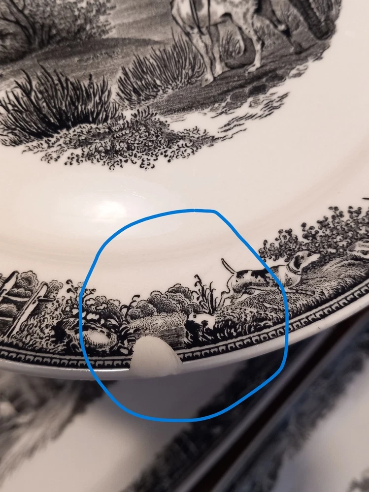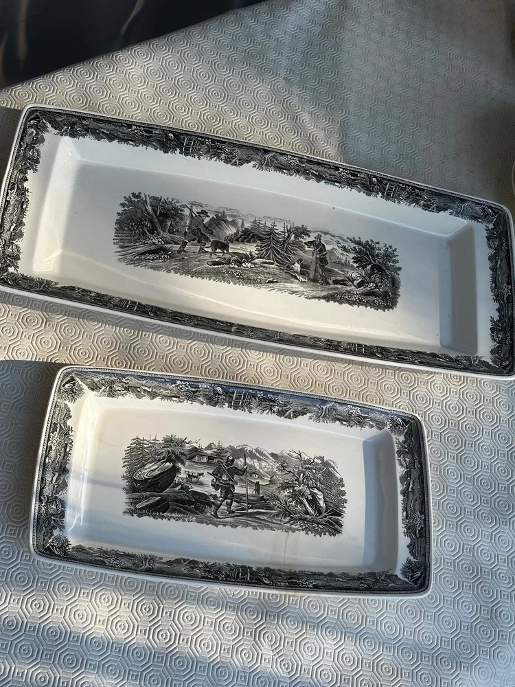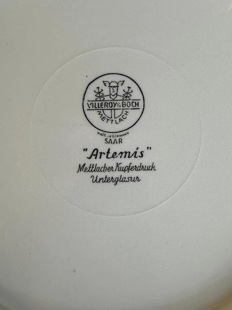 Collezione Artemis, anni ‘50/’60, manifattura tedesca, calcografia su lastra rame applicata sotto smalto. Motivo: scena caccia tradizionali. Monocromatico nero su bianco/crema. Prestigioso servizio completo per 10 persone, per un totale di 47 pezzi così suddivisi: • Piatti fondi – 10 pezzi • Piatti piani – 20 pezzi • Piattini dessert – 10 pezzi • Vassoi di portata, varie dimensioni: 3 pezzi • Zuppiere con coperchio, varie dimensioni: 2 pezzi • Terrina con manico; 1 pezzo • Porta frutta: 1 pezzo Nel suo assieme, il set appare in ottime condizioni. Si notano due scheggiature come da foto (su un piatto piano ed uno da dessert) ed alcune macchie del tempo coerenti con l’età ed il materiale. Naturalmente disponibile a fornire ulteriori dettagli, foto e/o dimensioni dei componenti. INFO per la CONSEGNA. Le dimensioni totali (approssimative) sono: 60x60x60 cm, 25 kg. Se ritiro a mano, la zona principale di riferimento è Roma Sud (Eur). Se spedito, il costo è a carico acquirente: quanto indicato è di riferimento, ma il valore definitivo sarà da valutare e concordare in funzione della destinazione finale (Italia o estero).