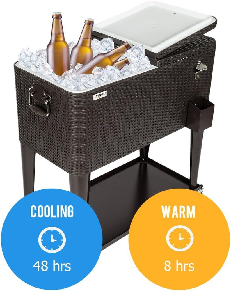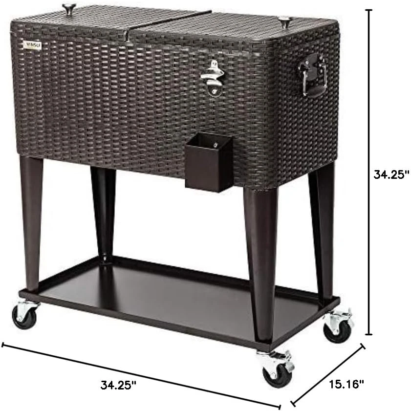 FOR YOU VINGLI 80 Quart Rolling Ice Chest, Portable Patio Party Bar Drink Cooler Cart, with Shelf, Beverage Pool with Bottle Opener (Brown) FEATURES 80 QUART COOLER CART: Holds up to 80 quarts (20 gallons) 96 aluminum can, It Will Be a Perfect Tool to Cool Your Drinks, Such As Beer, Beverage and Juicy. MULTI DIRECTIONAL ROLLING WHEELS: 2 Caster with lock and 2 Caster without lock, Move it anywhere or lock to keep it in place. Bottom Tray for additional storage and two-sided easy access lid. EXQUISITE CONSTRUCTION: Bottle opener with bottle cap catcher attached to side, two sided access lids with handles easy opening and closing. Increase portability KEEP COOL AND WARM: Keep cool for 48hrs and keep warm for 8hrs. Convenient rolling cooler is perfect for any outdoor and indoor occasion like a barbeque or backyard party. EASY CLEAN AND ASSEMBLE: Drain plug removing excess water, for easy cleaning and care. Installation without tools. Product description VINGLI 80 QUART PP RATTAN COOLER CART: Holds up to 80 quarts (20 gallons) 96 aluminum can, It Will Be a Perfect Tool to Cool Your Drinks, Such As Beer, Beverage and Juicy. Keep cool for 48hrs and keep warm for 8hrs. Convenient rolling cooler is perfect for any outdoor and indoor occasion like a barbeque or backyard party. KEEP COOL AND WARM Keep cool for 48hrs and keep warm for 8hrs. Convenient rolling cooler is perfect for any outdoor and indoor occasion like a barbeque or backyard party. Easy Clean Up Back of the cooler is designed with a drainage plug to drain your cooler with ease, and the attached bottle cap catcher will make sure your bottle caps don't make a mess. Foot Material: Iron Spray Plastic with Tray Bearing: 110kg / 242.51lbs Dimensions: (30.5 x 15.5 x 33)" (L x W x H) Heat Preservation for: 6 hours Refrigerated for: 48 hours Large Holding Capacity With a large 80 quart/20 gallon/96 aluminum can capacity, this cooler can accommodate any party or occasion. LID WITH HANDLE Two sided access lids with handles easy opening and closing. Increase portability MULTI DIRECTIONAL ROLLING WHEELS 2 Caster with lock and 2 Caster without lock, Move it anywhere or lock to keep it in place. WATER PIPE Drain plug removing excess water, for easy cleaning and care. Warranty Description 1 Year Warranty Capacity 80 Quarts Item Dimensions LxWxH 15.8 x 31 x 31.2 inches Brand Name VINGLI Color Brown Included Components Frozen Trolley Brand VINGLI Material 430 Stainless Steel, Iron Item Weight 30.86 Pounds Suggested Users unisex-adult Number of Items 1 Model Name PatioCooler01 Recommended Uses For Product Outdoor and Indoor Occasions, Barbecues, Backyard Parties, Patio Parties Package Information Box Team Name Vingli Size 31 x 15.8 x 31.2" Special Feature Built-In Cup Holder, Wheeled Product Dimensions 15.8"D x 31"W x 31.2"H Manufacturer VINGLI 31.0 "h x 15.8 "h x 31.2 "h. Weight: 30.86 lb PAYMENT We accept all payments via Ebay using Credit Cards , PAYPAL , Apple Pay and many others SHIPPING We are always working hard to ensure your package arrives as soon as possible. Please understand that some factors like weather, high postal traffic, and the performance of shipping companies are outside of our control. DELIVERY & RETURN POLICY We offer a 30-Day Return Policy on items in which you are not completely satisfied with. You have the option of a full-refund or an exchange of the item. No returns are available on items shipped outside of the USA.