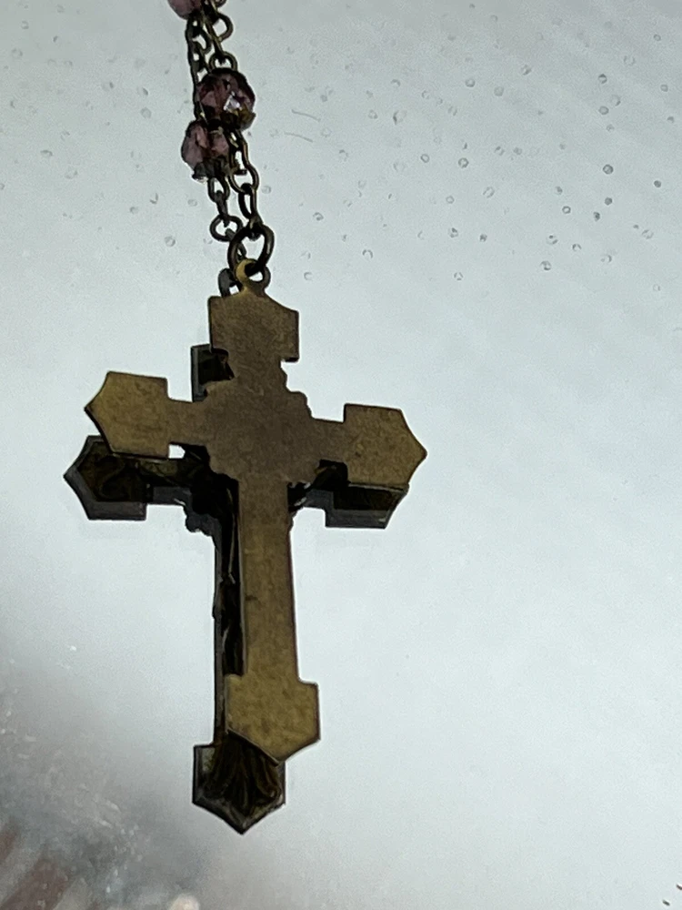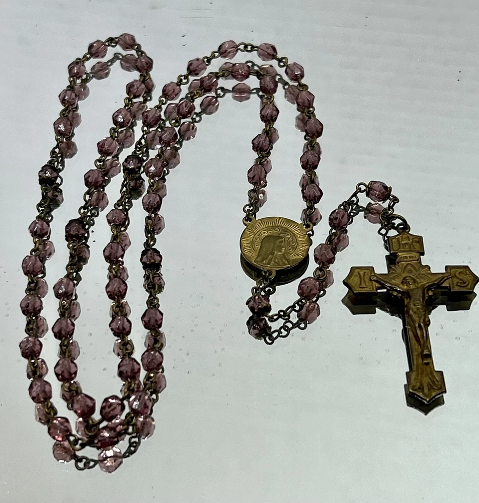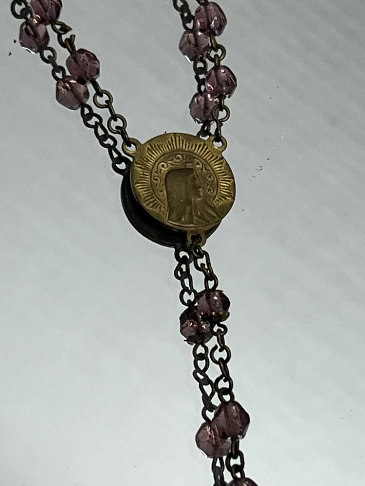 VINTAGE 18.5" Rosary Amethyst / Purple Beads Catholic Cross Necklace. Measures approx. 18 1/2" from the bottom of the cross to the top bead. Please see my pictures and ask any questions. WE WILL DEFINITELY COMBINE SHIPPING ON ANY OF OUR AUCTIONS! PICK YOUR ITEMS OUT AND I WILL SEND A COMBINED INVOICE.