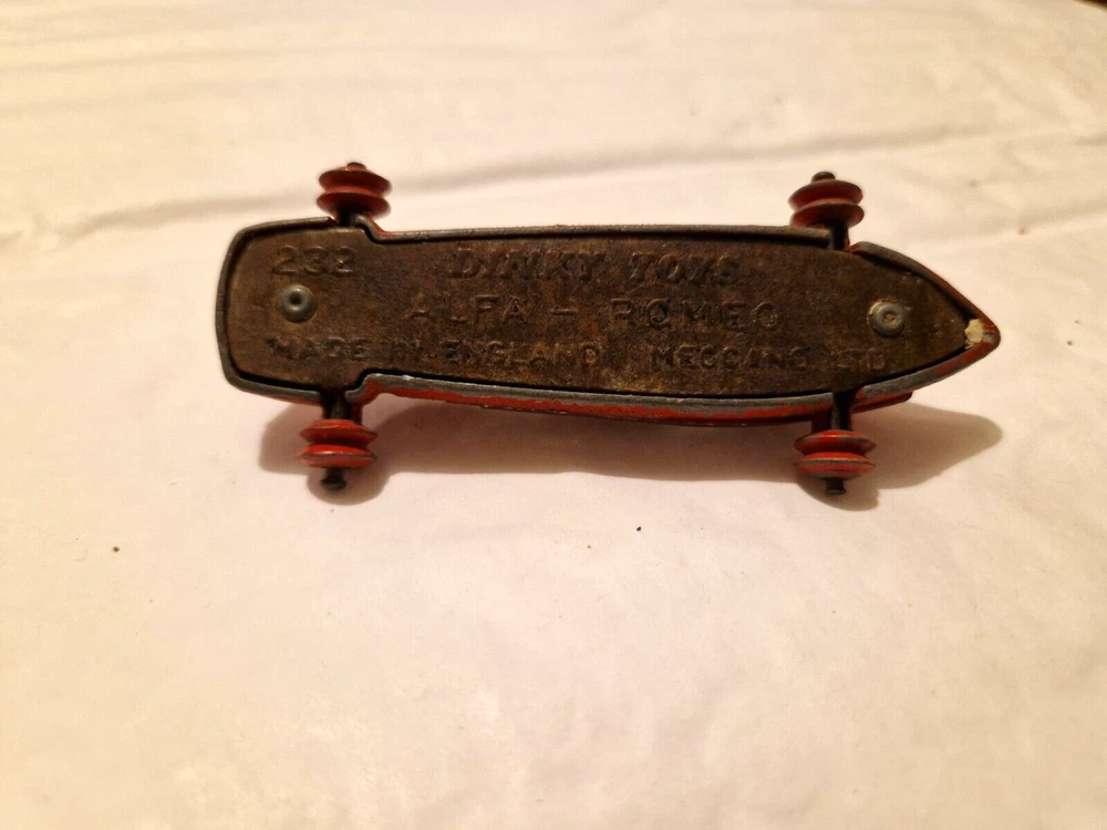 VINTAGE 1950'S DINKY TOYS 232 ALFA ROMEO RACING RED DIECAST MODEL CAR This product data sheet is originally written in English. YOU ARE BUYING A VINTAGE DIECAST MODEL FEATURING AN ALFA ROMEO CAR MADE BY DINKY IN THE 50S IT IS APPROX 8CM LONG IN GOOD USED CONDITION SOME CHIPPING TO THE PAINTWORK, OVERALL GOOD FOR ITS AGE - SEE PHOTOS FOR DETAILS NO REPAINT OR REPLACED PARTS BASEPLATE IS GOOD NEEDS 4 NEW TYRES NICE MODEL TO OWN THIS WAS RELEASED OVER 50 YEARS AGO AND IS IN VERY GOOD ORDER CONSIDERING THIS! A MUST HAVE FOR ANY FANATICS, DON'T MISS OUT AS THERE ARE HARDLY EVER ANY ON EBAY YOU ARE BUYING A VINTAGE DIECAST MODEL FEATURING AN ALFA ROMEO CAR MADE BY DINKY IN THE 50S IT IS APPROX 8CM LONG IN GOOD USED CONDITION SOME CHIPPING TO THE PAINTWORK, OVERALL GOOD FOR ITS AGE - SEE PHOTOS FOR DETAILS NO REPAINT OR REPLACED PARTS BASEPLATE IS GOOD NEEDS 4 NEW TYRES NICE MODEL TO OWN THIS WAS RELEASED OVER 50 YEARS AGO AND IS IN VERY GOOD ORDER CONSIDERING THIS! A MUST HAVE FOR ANY FANATICS, DON'T MISS OUT AS THERE ARE HARDLY EVER ANY ON EBAY Brand Dinky Vehicle Type Car Vehicle Make Alfa Romeo EAN Does not apply