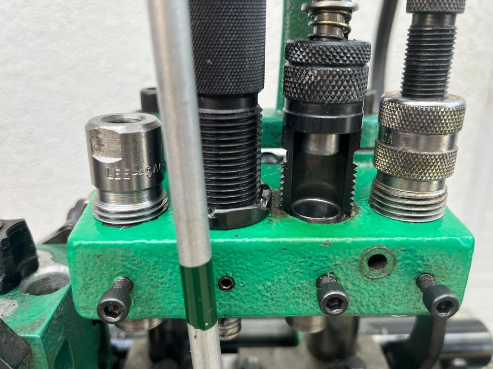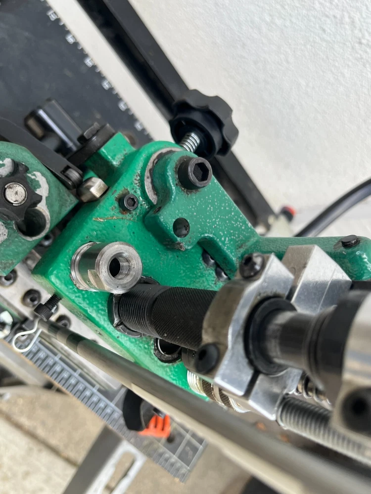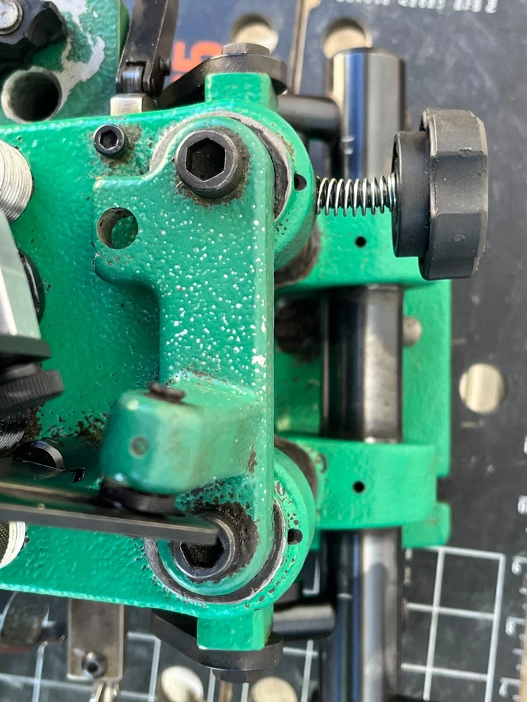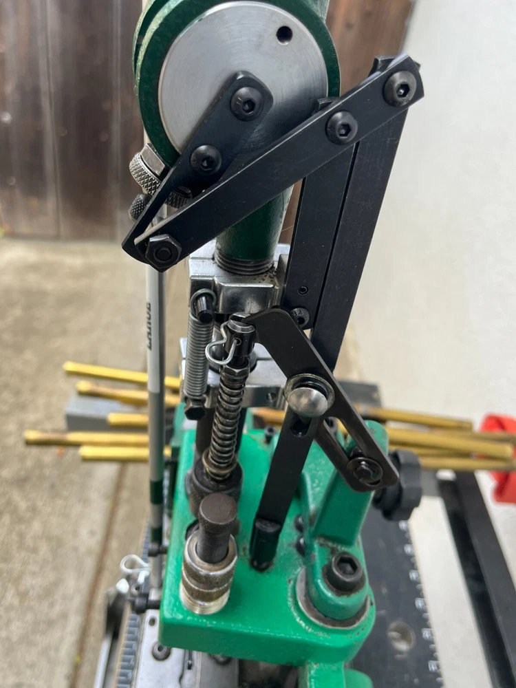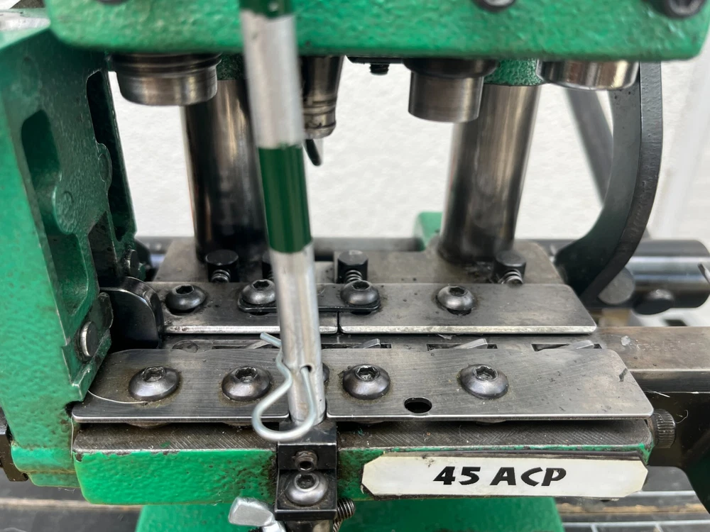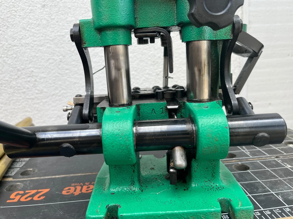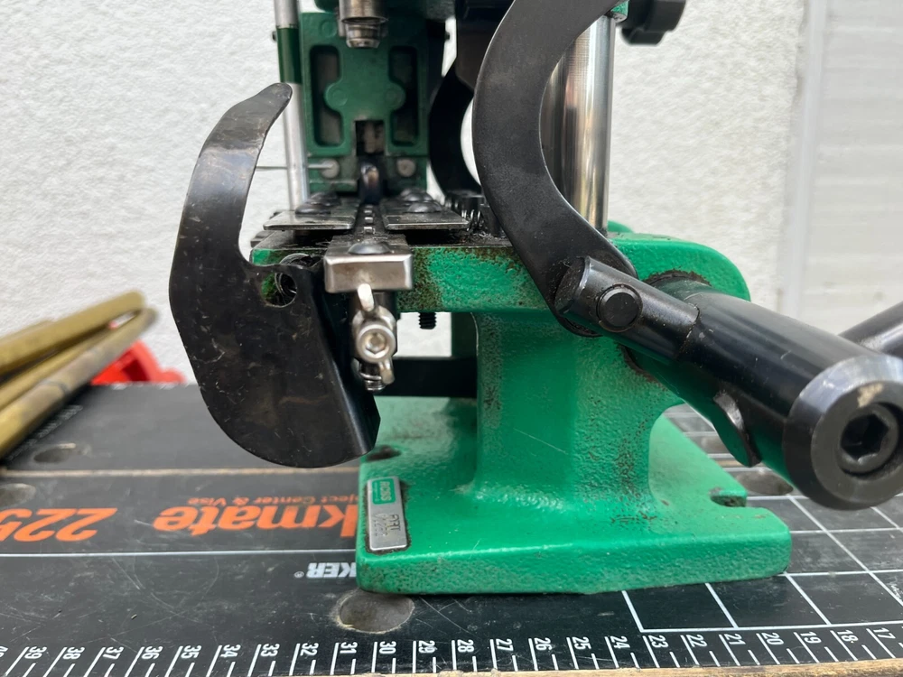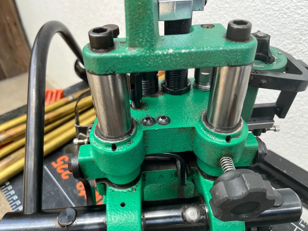 Vintage RCBS Green Machine inline progressive reloading press which was set up in .45 acp. The original owner made some modifications to it including upgrading to a Uniflow powder measure, tube primer feed, 8 ball handle and brass loading tubes. I t's out of adjustment or needs some TLC. Case advance is off a bit and it's not centering over the primer seater nor is it fully advancing the piece of brass I tested it with. Possibly the case holder bars are out as well. Case advance arm will jam if that lower adjuster bolt turns sideways. Powder measure is not actuating but maybe it needs brass to dump? The primer tube is very close to the new powder measure, not sure if there is a conflict when working the press. The case feed has a broken bottom plastic tube retainer and missing the top one. Plastic powder hopper has a crack but RCBS still has these available. Lee carbide sizing die and a Lyman seating die. Press #01252. You will need to disassemble, clean, lube and adjust to get it up and running. I will be listing more of these in the near future but different calibers .45 Colt, .44 Special/Magnum, .38 S&W, 9mm, and .357 Magnum. Please refer to images. This press is very heavy, in excess of 30 lbs. and will be partially disassembled for shipping which will be two insured Priority mail boxes. Pickup is an option but not listed on the shipment methods. Please feel free to discuss before purchase. Glad to combine freight when possible, please message me prior to paying for an invoice with combined freight amount. USA shipping only. Message any questions or for more images. Thanks for looking!