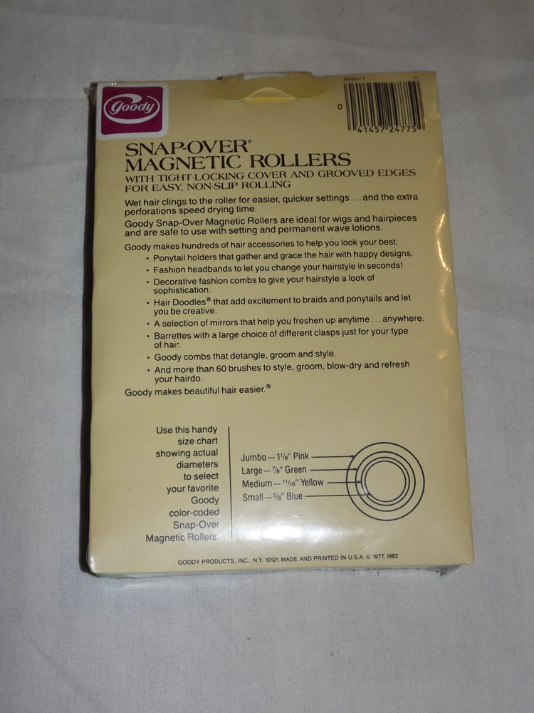 YOU ARE BIDDING ON...... VINTAGE 1982 GOODY SNAP-OVER 16 LARGE MAGNETIC ROLLERS NEW OLD STOCK NOS.. ..NEVER OPENED....PLEASE VIEW PHOTOS FOR CONDITION.***PLEASE E-MAIL IF YOU HAVE A QUESTION OR WANT AN ADDITIONAL PICTURE....PLEASE VISIT MY EBAY STORE FOR ADDITIONAL VINTAGE ITEMS..THANK YOU***BX9009-1N-1221