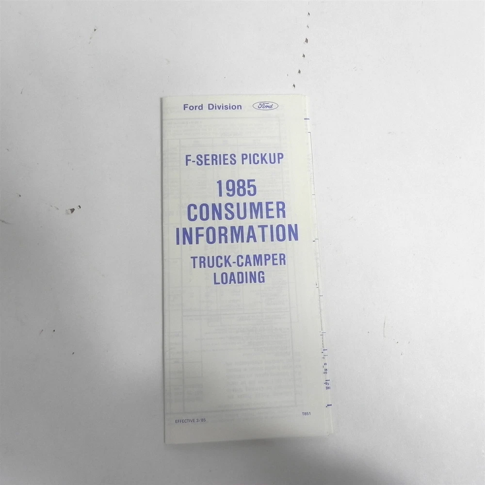 VINTAGE 1985 FORD F SERIES PICKUP CONSUMER INFORMATION TRUCK CAMPER LOADING BROCHURE GOOD CONDITION NO TEARS See photos below for details. Contents included will be pictured. ABOUT US Jones Vintage Parts has been a family-owned business for over 40 years. We specialize in rare and vintage NOS and used parts for all makes and models from the teens to the 70s. We're passionate about uncovering and restoring the stories of the treasures from your grandparents and great grandparents history. We believe in breathing new life into the world's first modes of transportation. New vintage all the time! SHIPPING INFORMATION Purchased items will generally ship Monday through Friday, within 3 days via USPS Flat Rate or First Class upon payment receipt. Larger items will be shipped via FedEx Ground or UPS. Multiple same-day purchases will be combined for discounted shipping (request a revised invoice to receive bulk shipping discount or notify us of future purchases). International shipping also available. RETURN POLICY Our goal is your satisfaction. If you are unhappy with your order for any reason items may be returned for parts credit within three (3) days of receipt, and you will be charged a 10% restocking fee. There are no shipping refunds. Exchanges will be billed appropriate freight. All return items must be complete, undamaged, unaltered and in resale condition. You may be interested in our other eBay listings . Powered by SixBit's eCommerce Solution