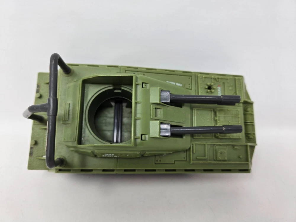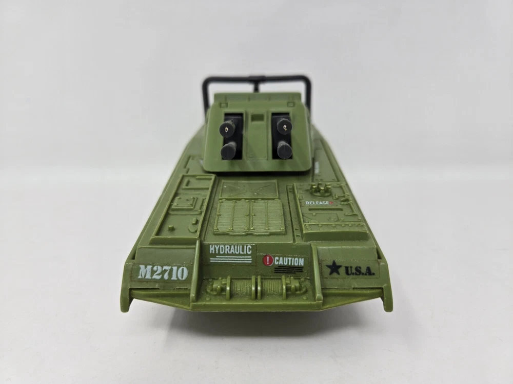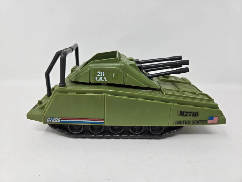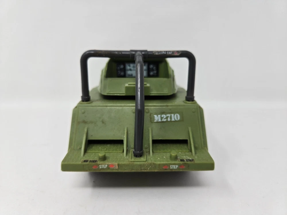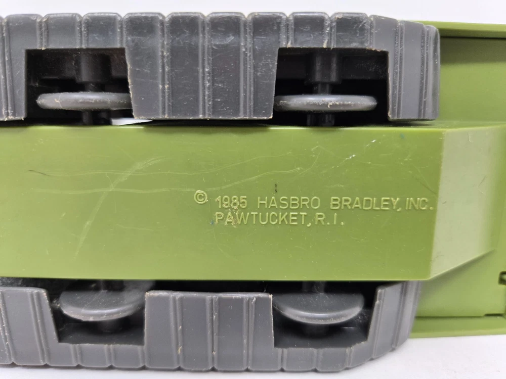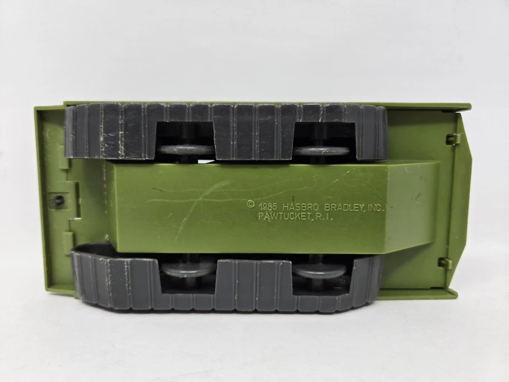 The product is a vintage 1985 Hasbro GI Joe Armadillo mini tank vehicle from the GI Joe series. It is a green plastic action figure accessory in 1:18 scale, measuring 7 inches in length, 3 inches in height, and 3 inches in width. The item is 100% complete and features adjustable parts. A collectible toy from the 80s, it is part of the military & adventure theme. All of our items are shipped from a SMOKE-FREE environment.