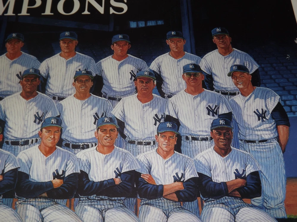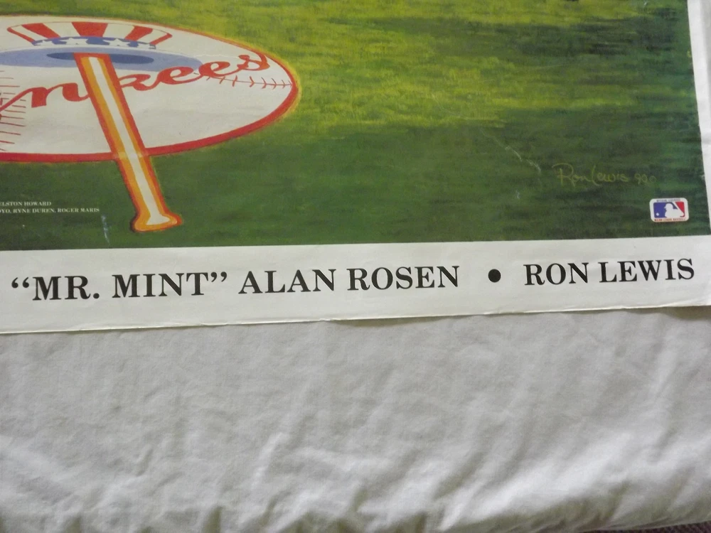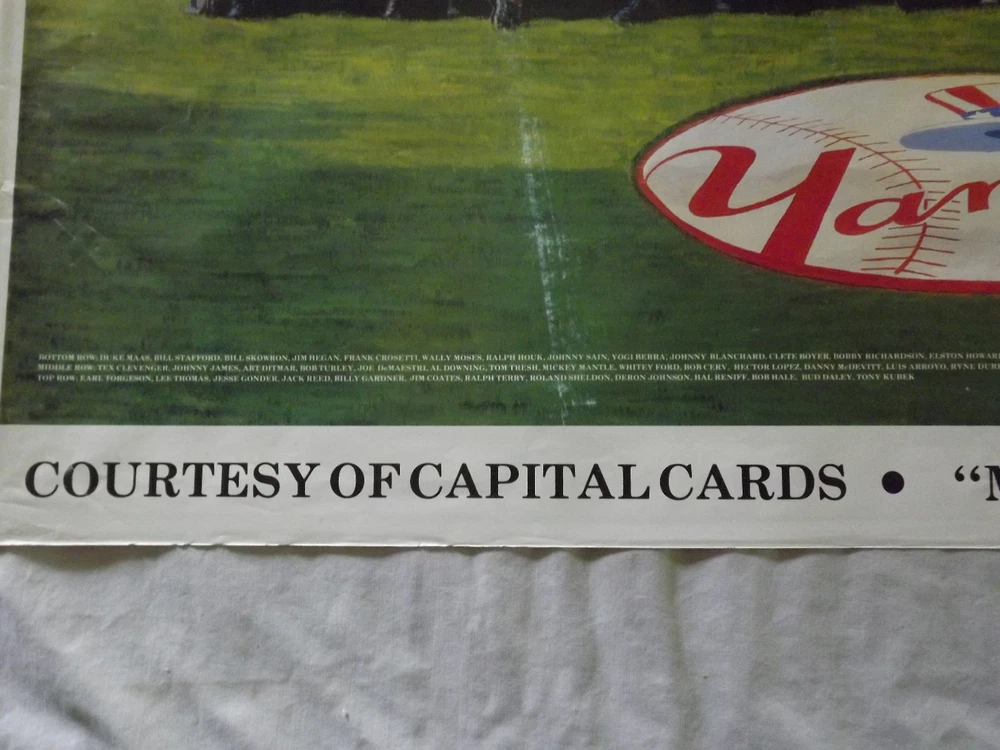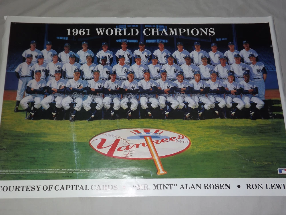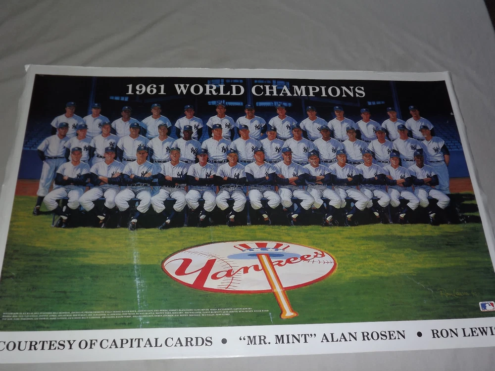 YOU ARE BIDDING ON..... VINTAGE 1990 MLB BASEBALL 1961 WORLD CHAMPIONS NY YANKEES PLAYERS POSTER.... ....MEASURES APPROX 37 1/2" X 24 "..POSTER SHOWS SOME AGE DISCOLORATION..SMALL 1/2" TEAR (SEE PHOTO)..EDGES SHOW A LOT OF WEAR..HAVE TEARS..HAS A FEW WHITE SPOTS/STREAK ...SHIPS ROLLED.....PLEASE VIEW PHOTOS FOR CONDITION.***PLEASE E-MAIL IF YOU HAVE A QUESTION OR WANT AN ADDITIONAL PICTURE....PLEASE VISIT MY EBAY STORE FOR ADDITIONAL VINTAGE ITEMS..THANK YOU*** XXXX0513