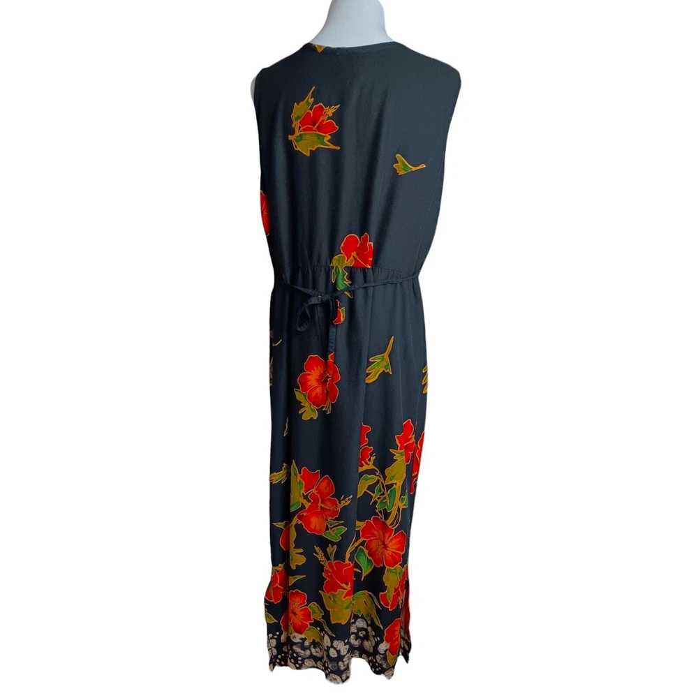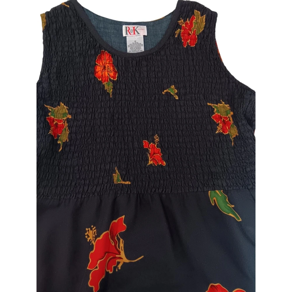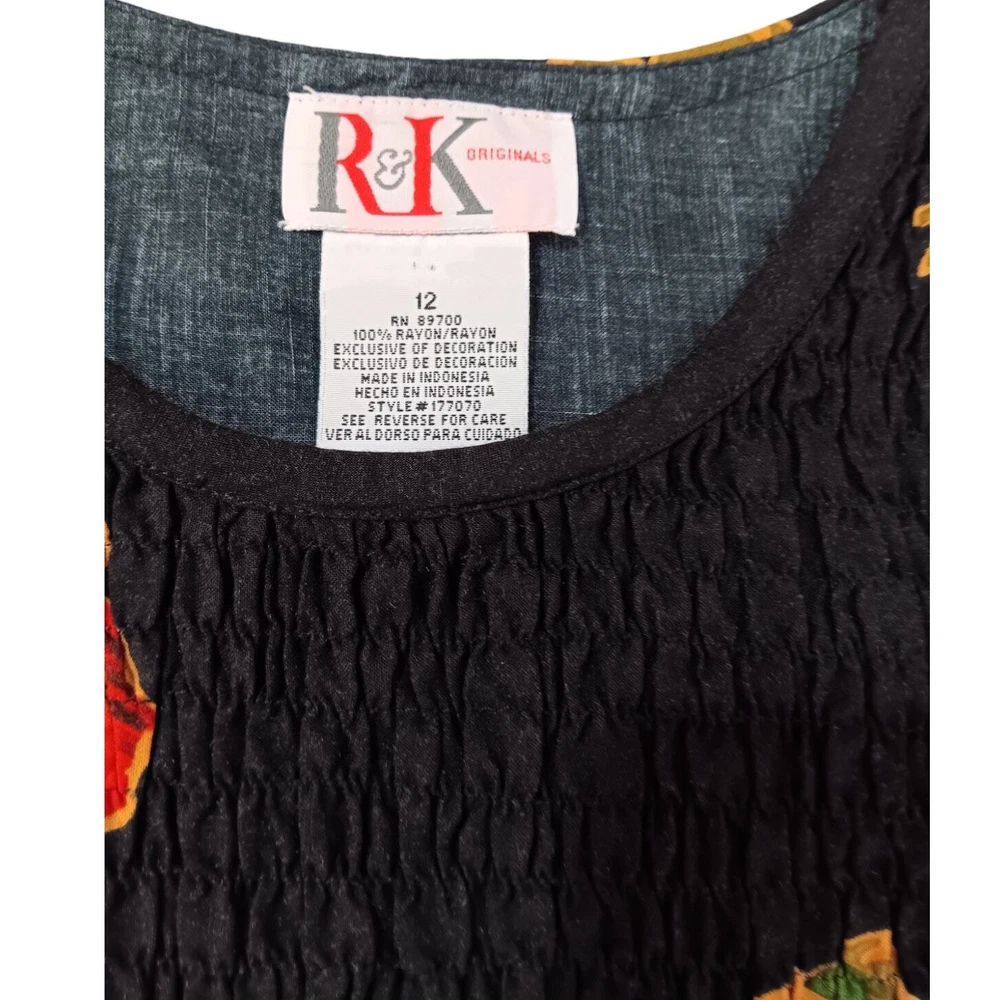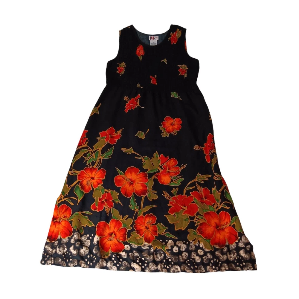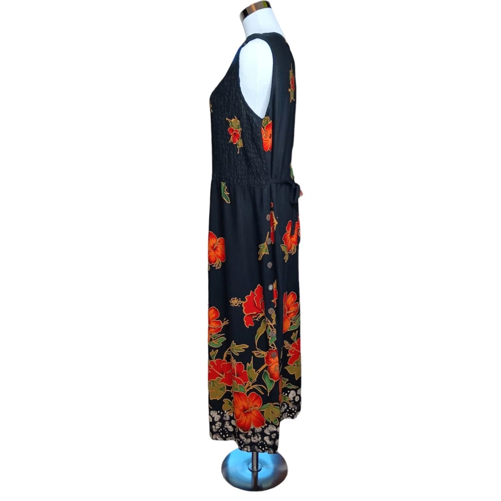 Gorgeous, vibrant vintage dress from the 1990's era. Beautiful soft fabric and flattering design! Zoom in on the adorable mismatched (purposeful) button embellishment. In great vintage condition with only faint signs of wear/laundering. Note: The side slits have been partially sewn to make them shorter, but this can be taken out if you prefer higher slits. Please review measurements in photos before buying. VINTAGE 1990s Maxi Dress Smocked Front Small attached tie belt in back Size 12 (see measurements in pics) Tropical Floral Hibiscus Design Black Orange Brand: R&K Originals Keywords: 90's 1990's VTG Long Tall Cottagecore Boho Bohemian Tropical Travel Vacation Holiday Event Cruise Hawaii Garden Romantic Feminine Girly Office Career Work Sustainable Minimalist Dressy Casual Secondhand Used Preowned Smoke-free/pet-free home Color/texture may vary due to lighting/devices Items may show wrinkling from packing/transit ID:B2/10