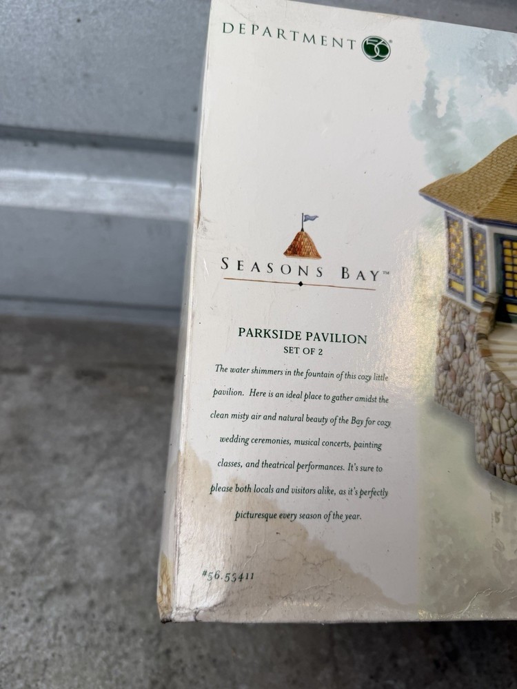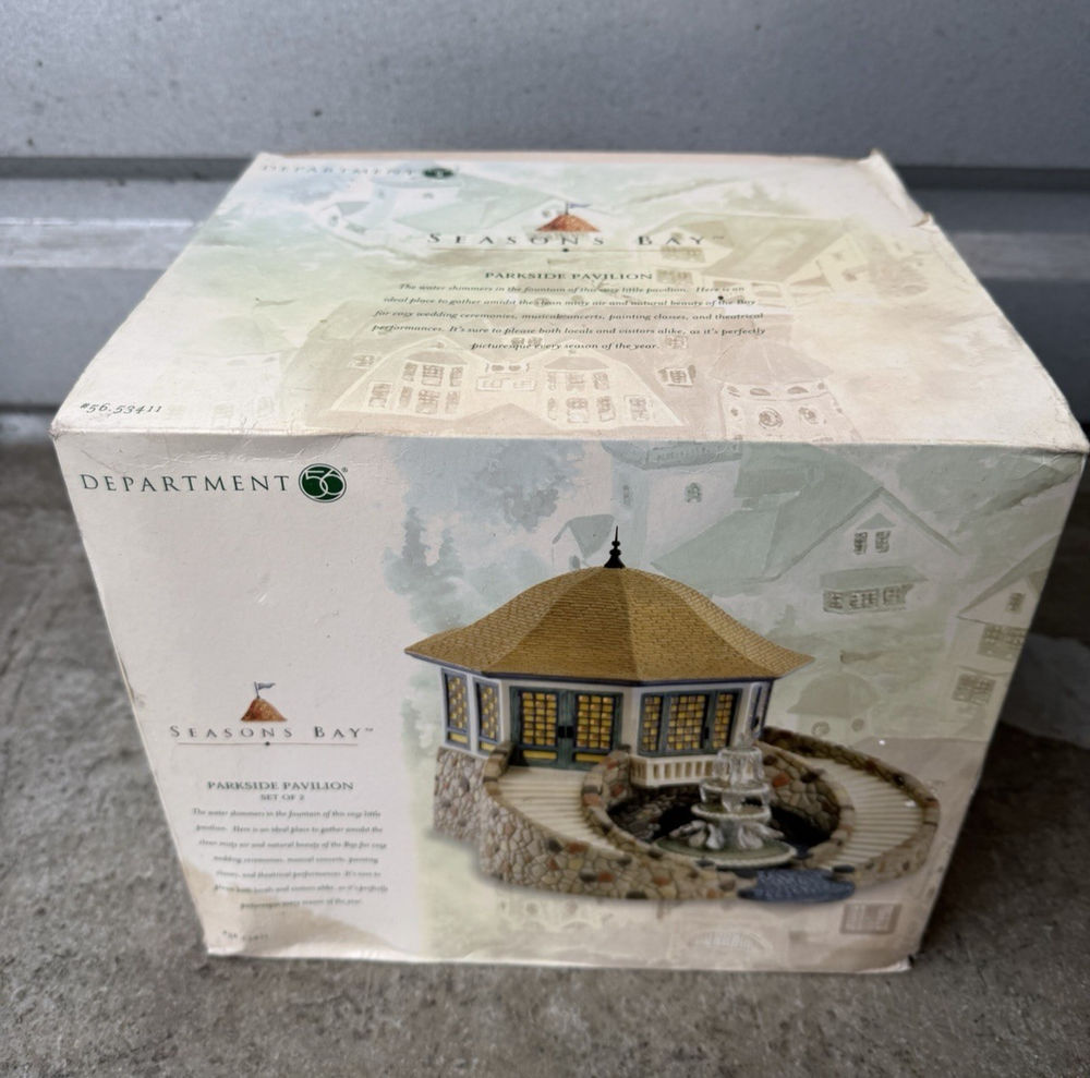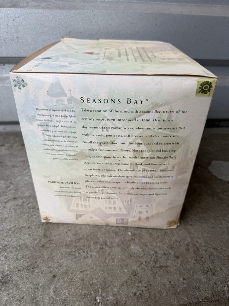 1. Brand: Dept 56 2. Item Description: SEALED NEW VINTAGE 1999 Dept 56 Seasons Bay - Parkside Pavilion - 56.53411 3. Condition: This box has been opened but the components are sealed. The components inside are 100% brand new from the manufacturer. The pictures are from the actual item on sale. 4. Color: 5. Included Items: A. Included: Original manufacturer's packaging, B. Not Included: 6. Suggested Retail Price: $ 7. Product Features: