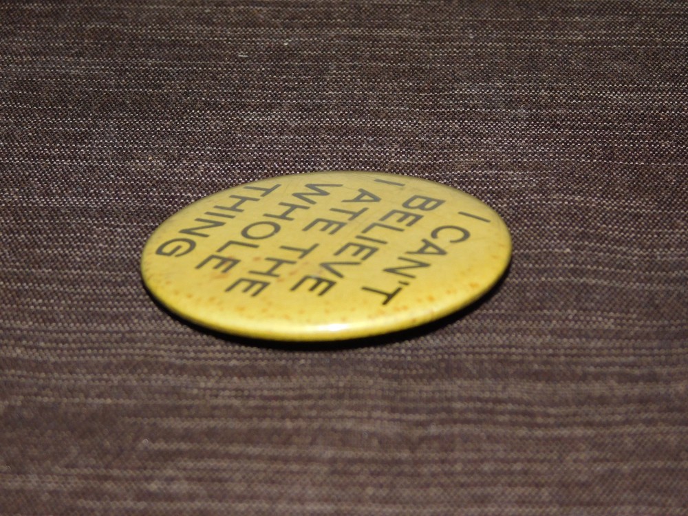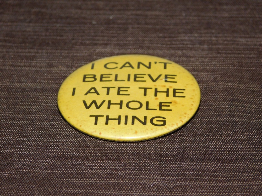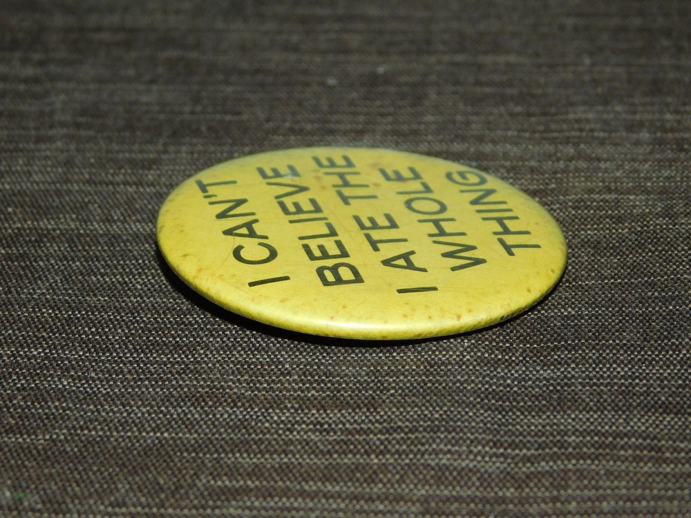YOU ARE BIDDING ON....... . VINTAGE 2 1/4"ACROSS I CAN'T BELIEVE I ATE THE WHOLE THING PIN BACK BUTTON .. . . .... SHOWS HANDLING/AGE WEAR..HAS SCRATCHES/PAINT LOSS/AGE DISCOLORATION.......PLEASE VIEW PHOTOS FOR CONDITION.***PLEASE E-MAIL IF YOU HAVE A QUESTION OR WANT AN ADDITIONAL PICTURE....PLEASE VISIT MY EBAY STORE FOR ADDITIONAL VINTAGE ITEMS..THANK YOU***12Q BX7133-XXXX