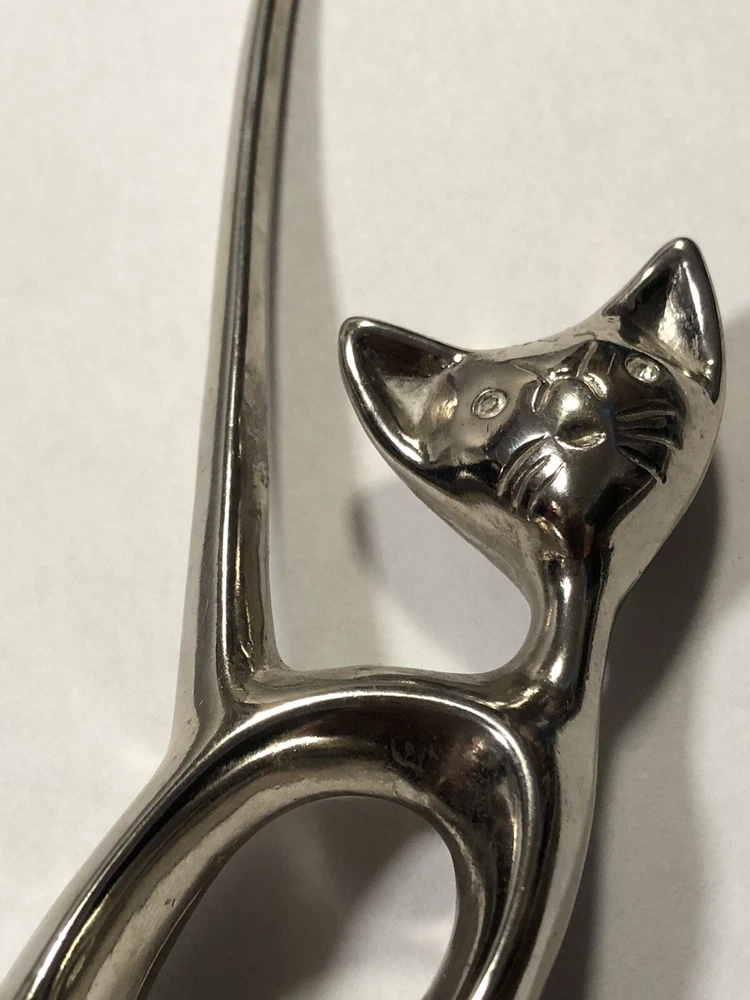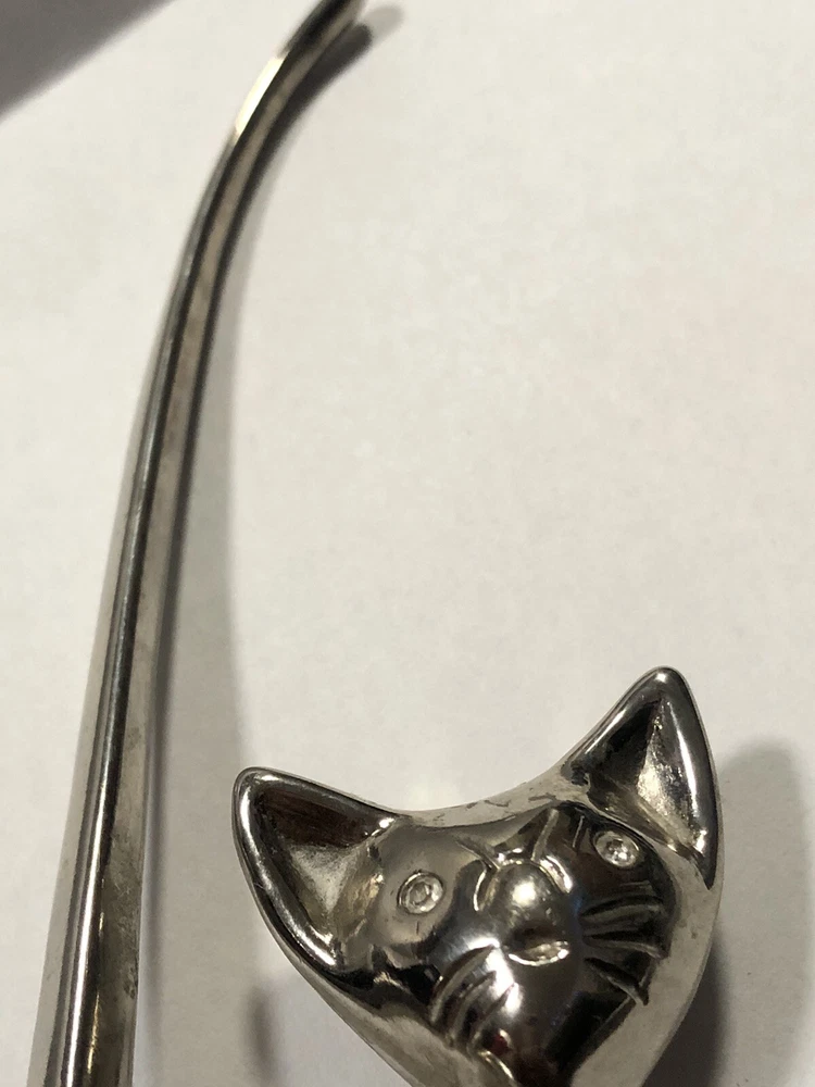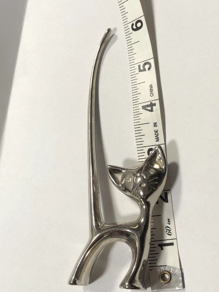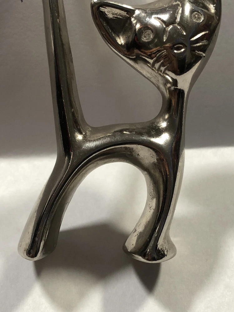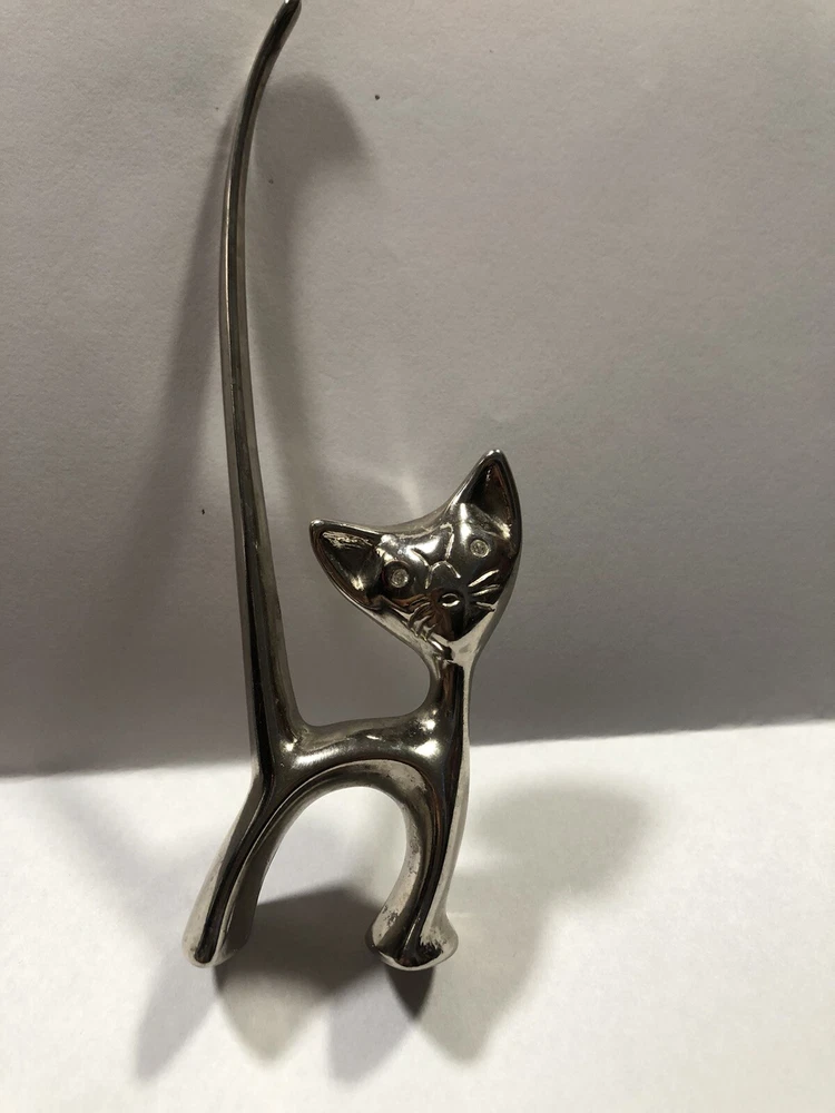 This vintage ring holder is a silver tone long tailed kitty with rhinestone eyes. It is a lovely ring holder and is perfect for unisex adults or children . The holder is made of metal and is in the shape of a cute cat figurine. This vintage piece is from the 40's and 50's and is a great addition to any jewelry collection. Please feel free to ask any questions prior to purchasing , all sales are final. If we have made a mistake, please contact us prior to leaving feedback and we will take care of it. Thank you kindly.