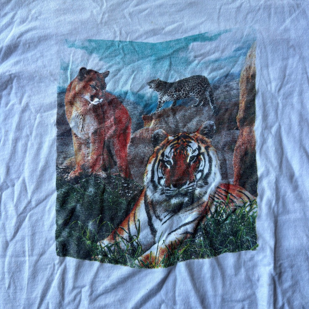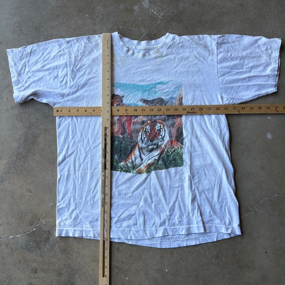 VINTAGE 90S TIGER LION ANIMAL T-SHIRT NATURE SINGLE STITCH FITS MEDIUM STAINS beautiful color measurements, and tag shown in pictures item is preworn and may have defects shipping every wednesday and sunday