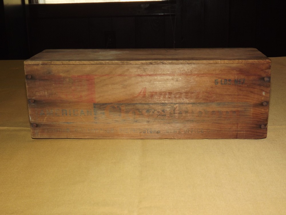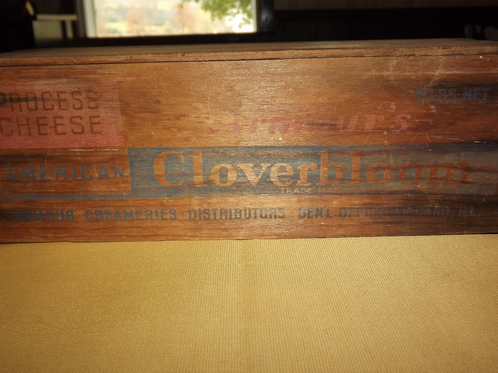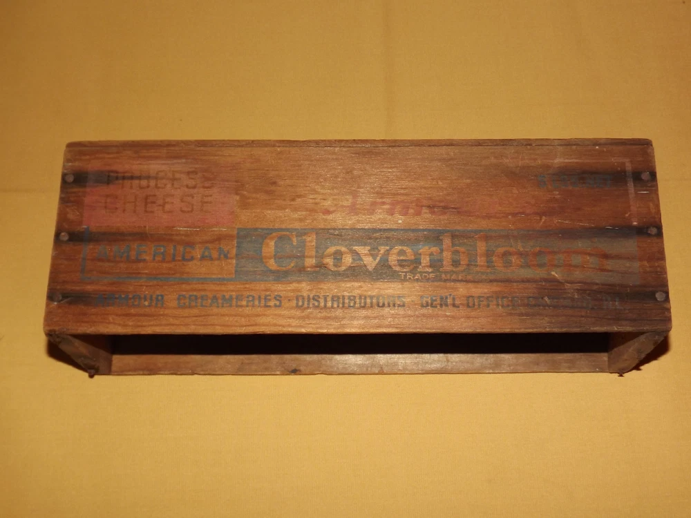 YOU ARE BIDDING ON...... VINTAGE ARMOUR'S CLOVERBLOOM WOOD AMERICAN CHEESE BOX...... .....MEASURES APPROX 11 9/16" X 3 3/4" X 3 7/8" HIGH....SHOWS USAGE/AGE WEAR..HAS SCRATCHES/PAINT LOSS & FADING /AGE DISCOLORATION....NO BOTTOM..PLEASE VIEW PHOTOS FOR CONDITION.***PLEASE E-MAIL IF YOU HAVE A QUESTION OR WANT AN ADDITIONAL PICTURE....PLEASE VISIT MY EBAY STORE FOR ADDITIONAL VINTAGE ITEMS..THANK YOU***BX2238-10N-3316