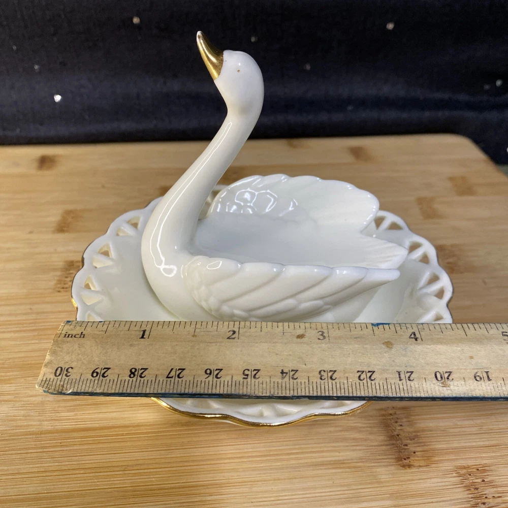 Beautiful white swan with gold accents, ring holder, earring and other jewelry holder. This item is preowned in great condition, with some of the gold on the beak rubbing off (see photos). Sold as is. Feel free to make an offer! Hg-009