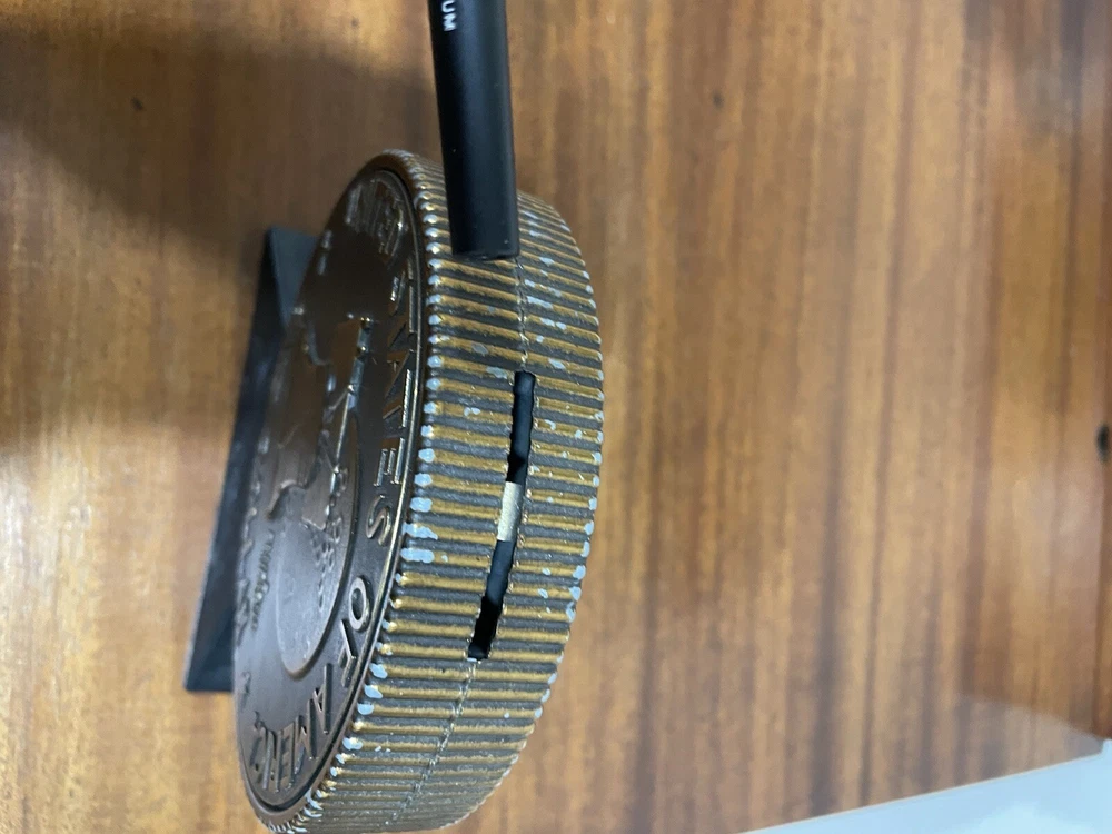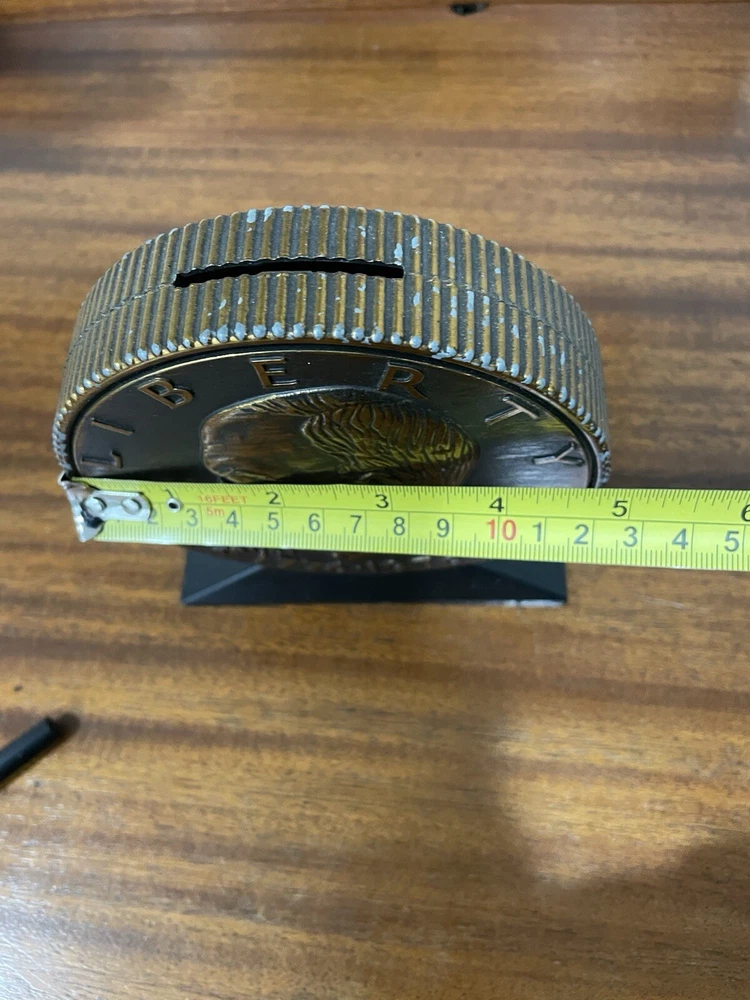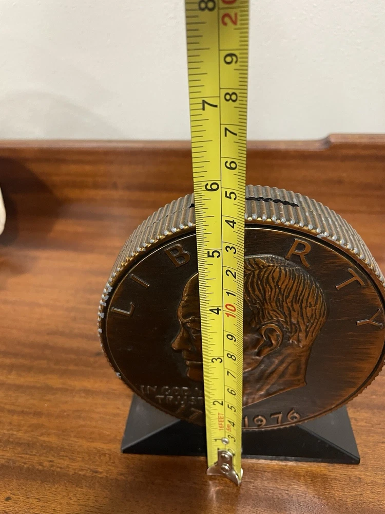 The vintage Liberty Bell Bank celebrates the Bicentennial of the United States with a design featuring President Dwight Eisenhower and the years 1776-1976. Made of plastic, this original reproduction is a collectible still bank perfect for showcasing American history and patriotism. The bank is a unique piece that captures a significant moment in the nation's past and serves as a reminder of the bicentennial celebrations of the United States. READ, has some wear on the top and sides of coin. See photo.
